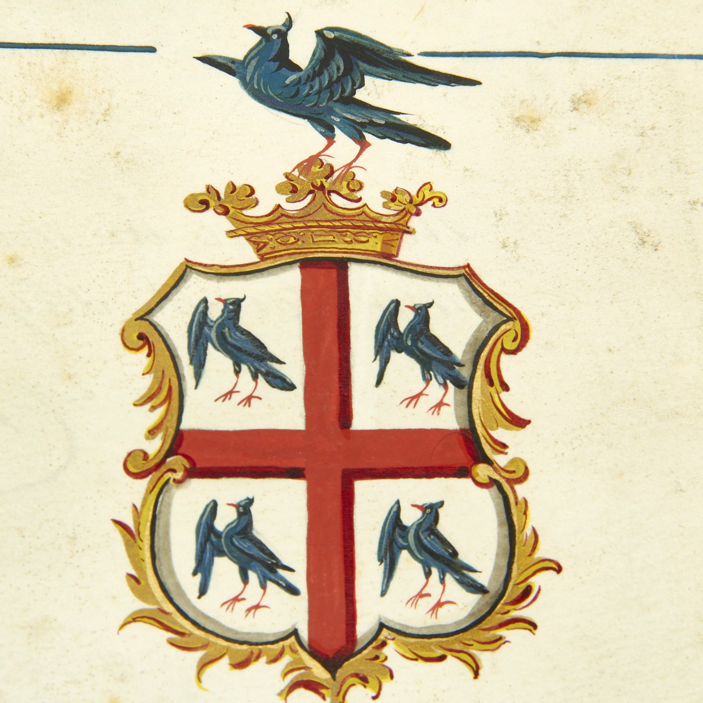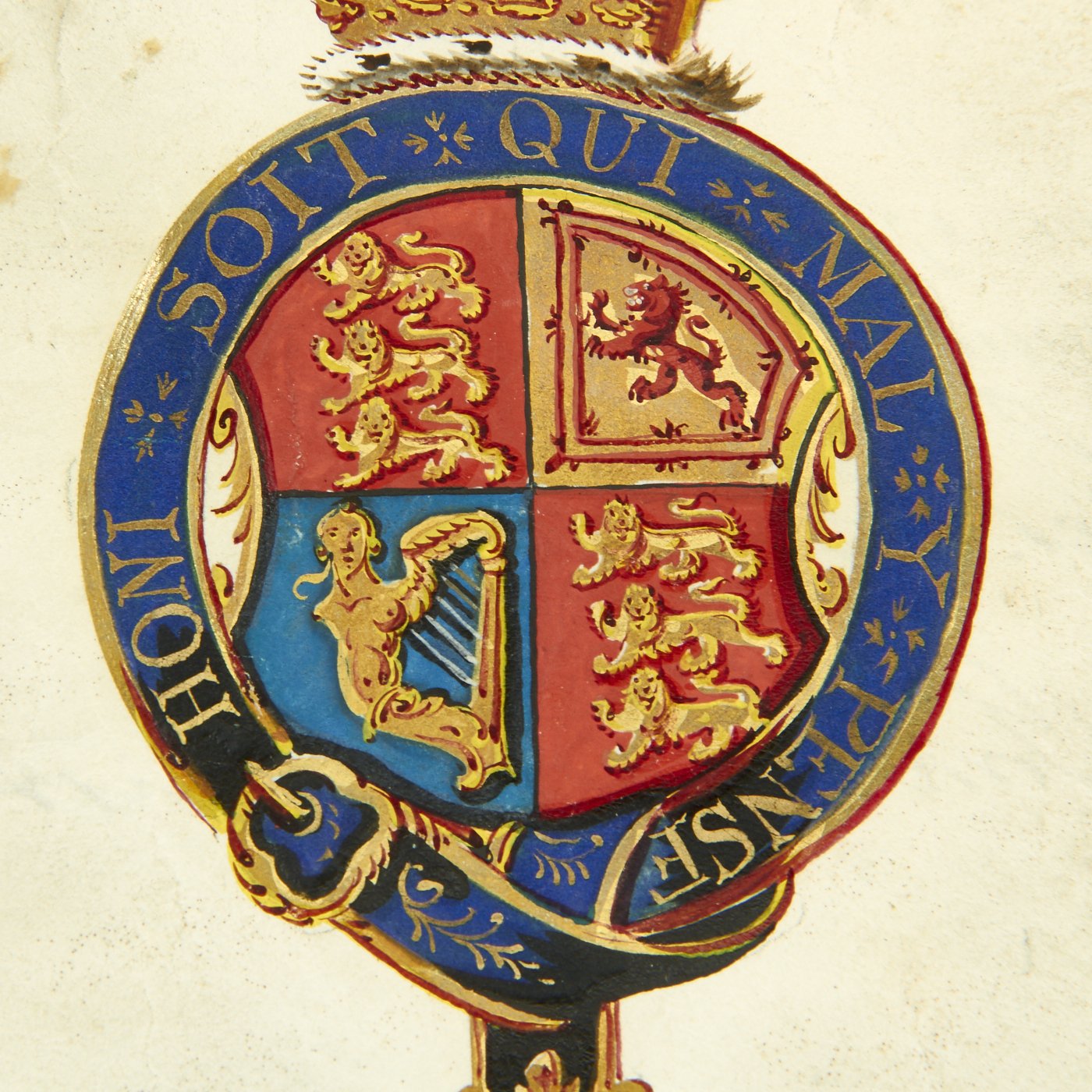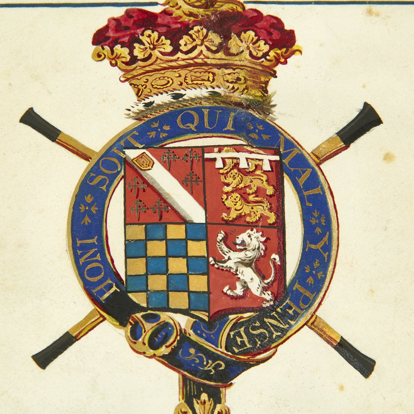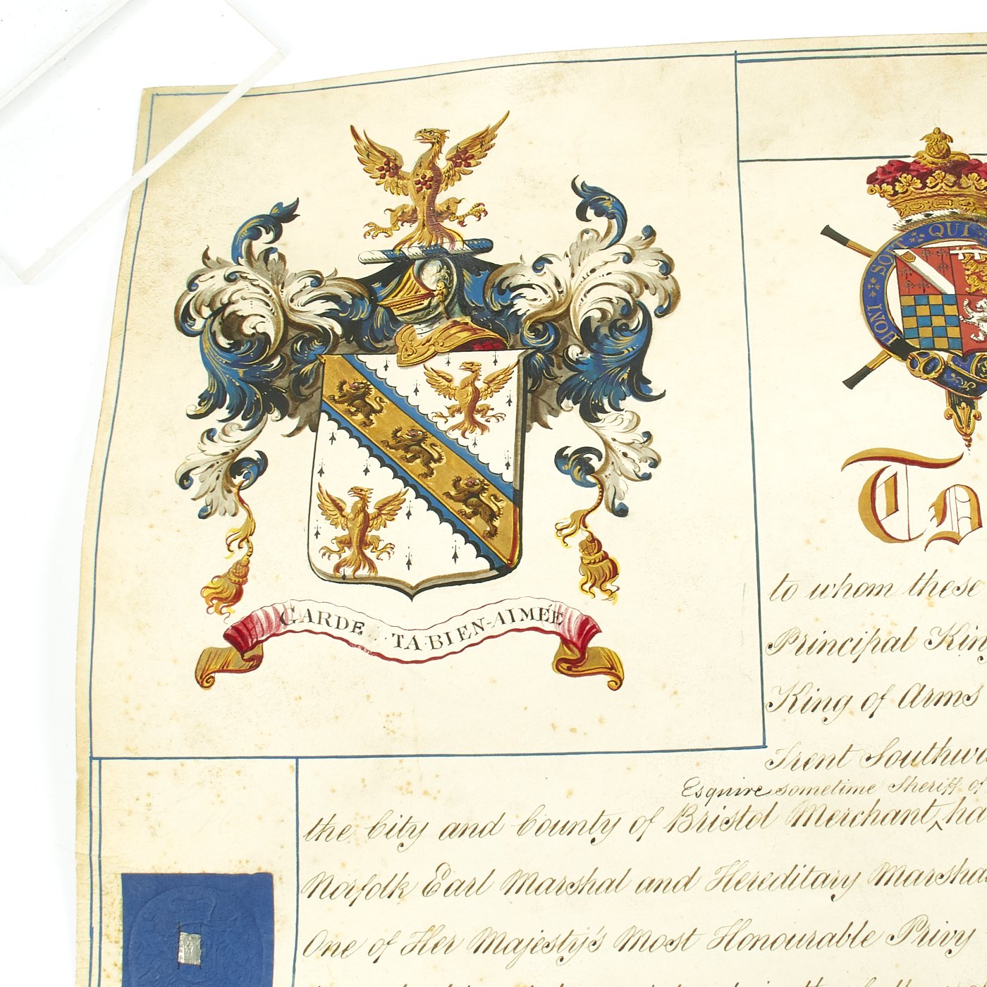 Beautifully presented, the vellum document is signed by SIR WILLIAM WOODS, Knight of the Garter and Principal King of Arms, and JOSEPH HAWKER, Clarenceux, King of Arms, under direct instructions of Queen Victoria to grant a Coat of Arms to PETER MAZE OF BRISTOL. Magnificent Scroll with Peter Maze's new Coat of Arms in Color together with three Official Royal Coats of arms complete with official blue ribbons to bottom holding two gold washed metal circular boxes themselves bearing the Crown motifs of the King of Arms.