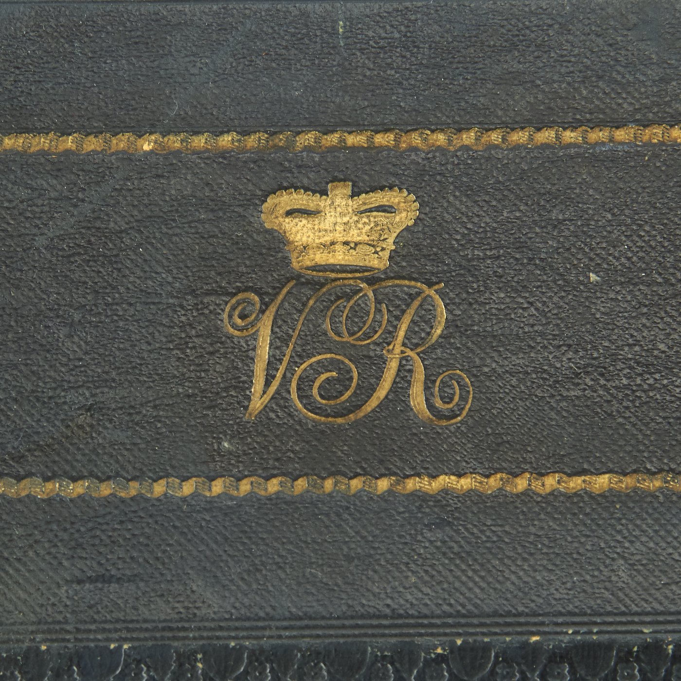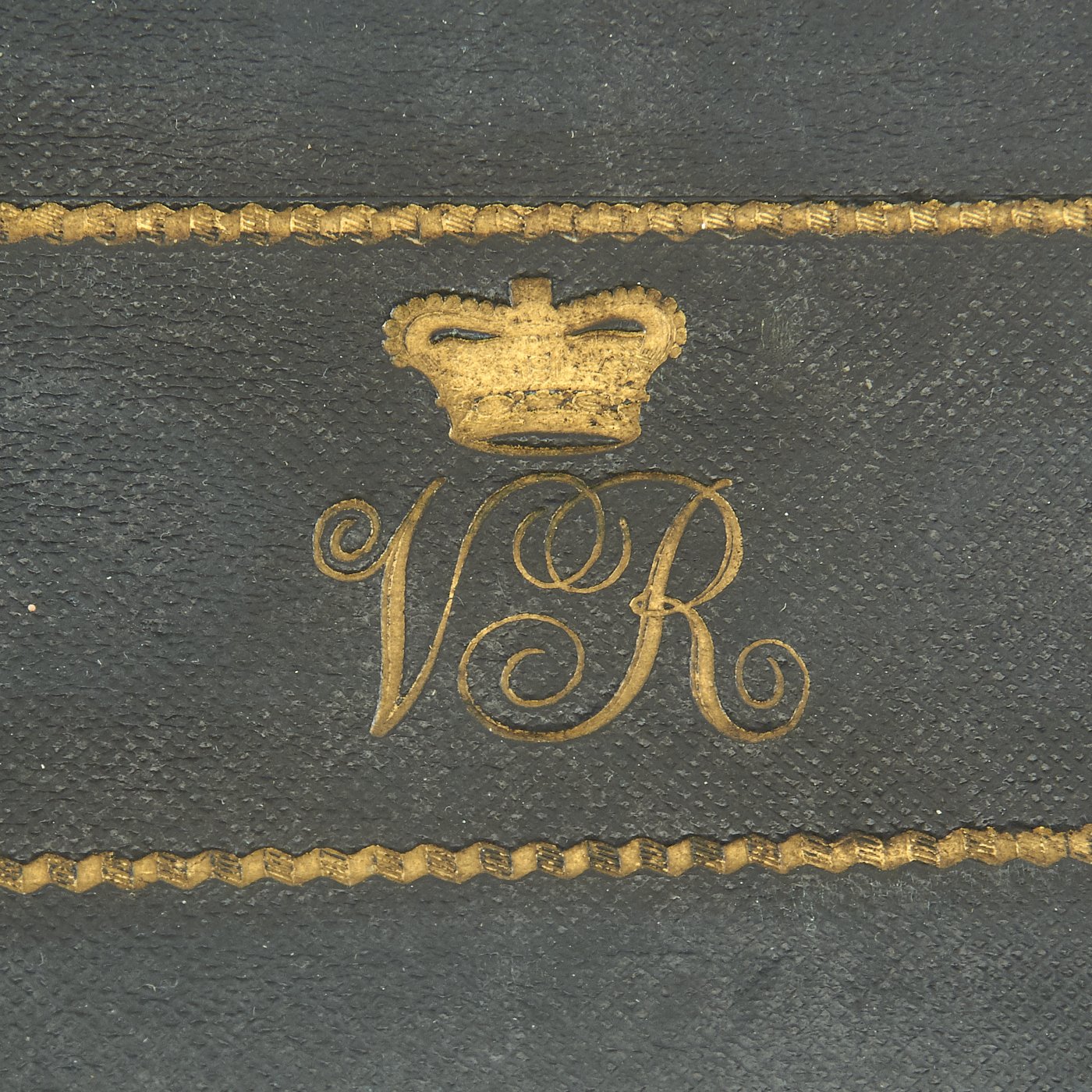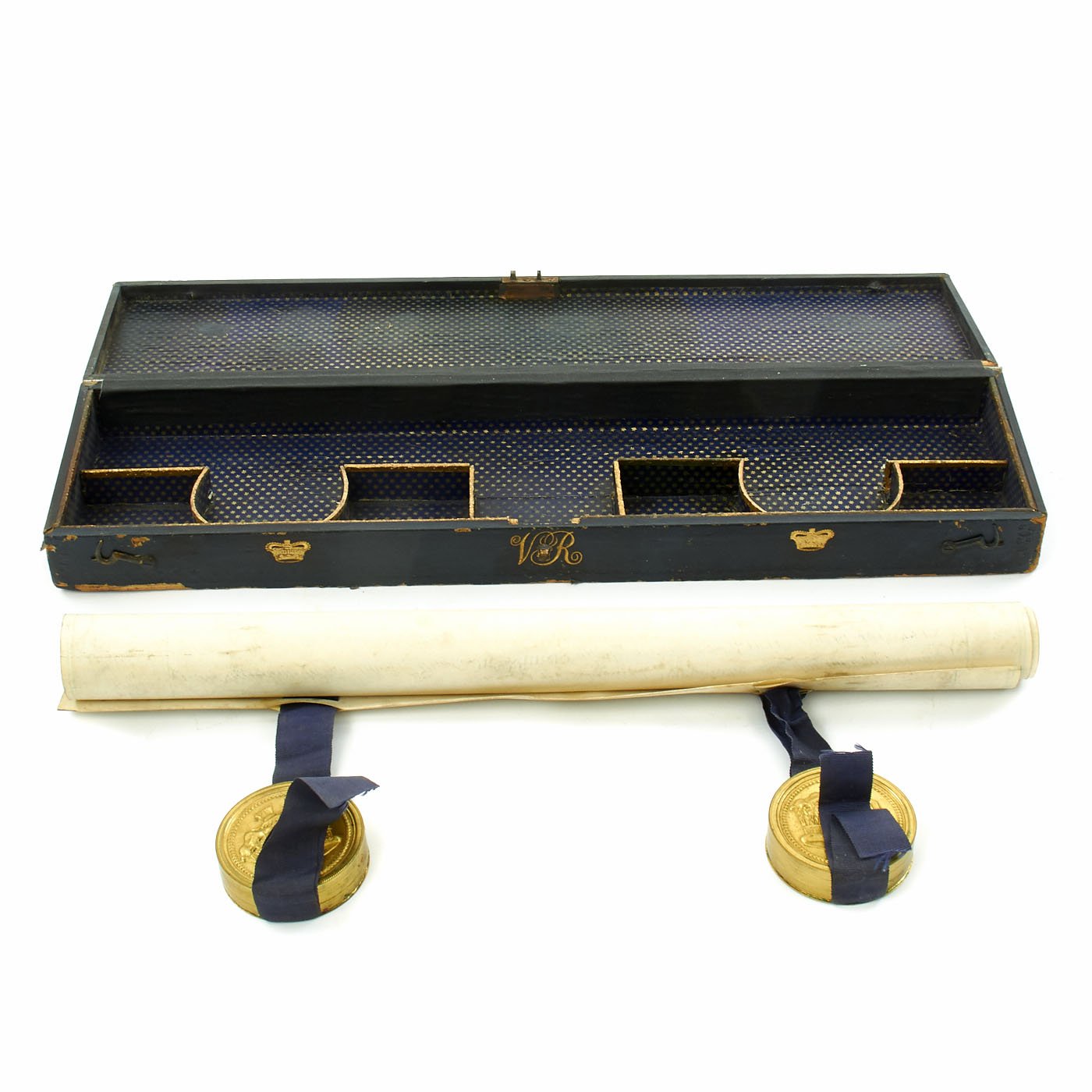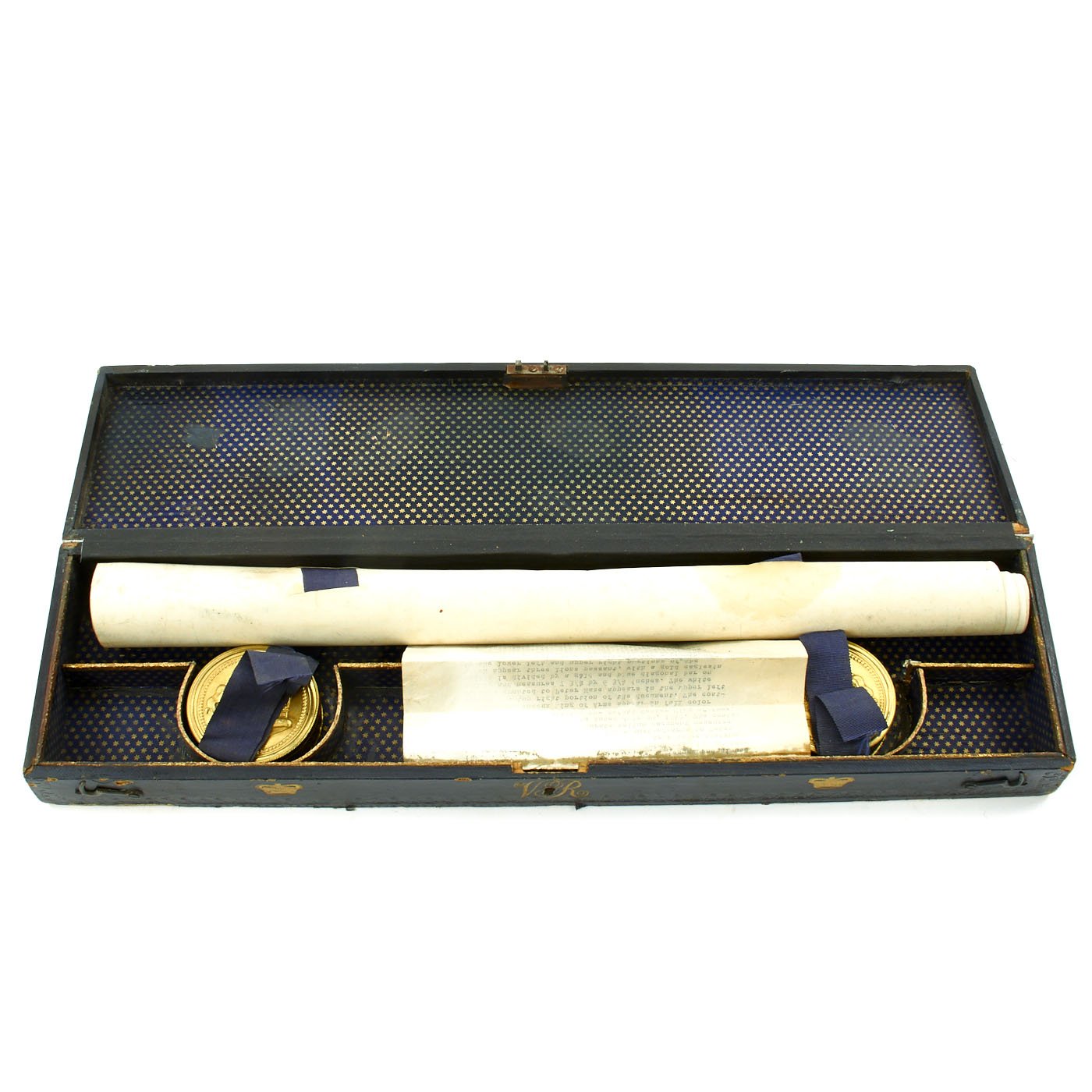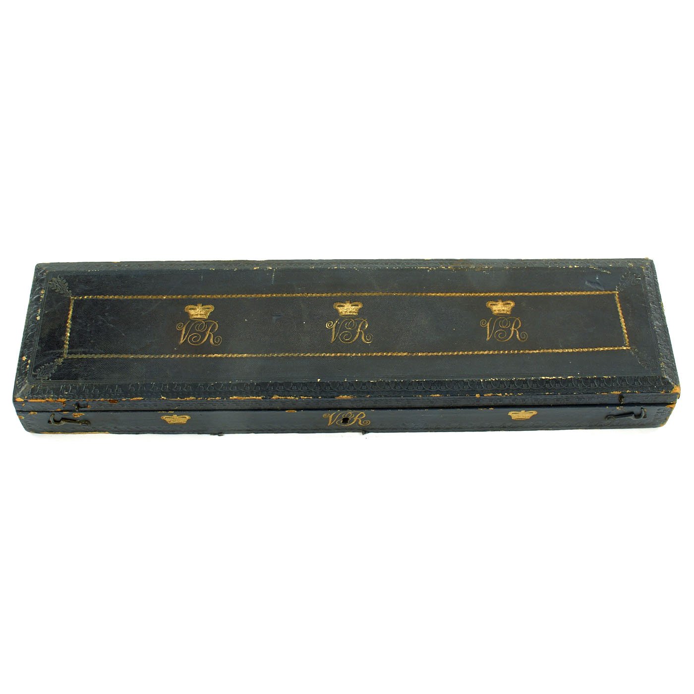 In pristine condition with fully separate typed description on an old piece of paper included, all encased in a magnificent fitted dark blue morocco box bearing gilt embossed borders, the Crown of Queen Victoria and the Initials V.R.. The box measures 22" X 5 1/2" X 2 1/2", and is in great shape.