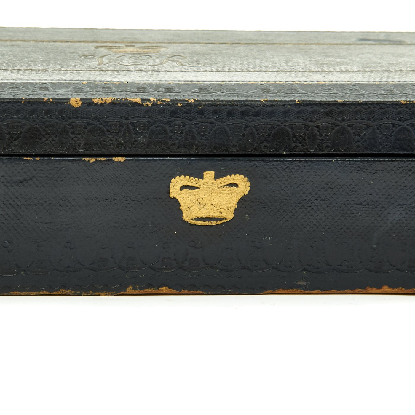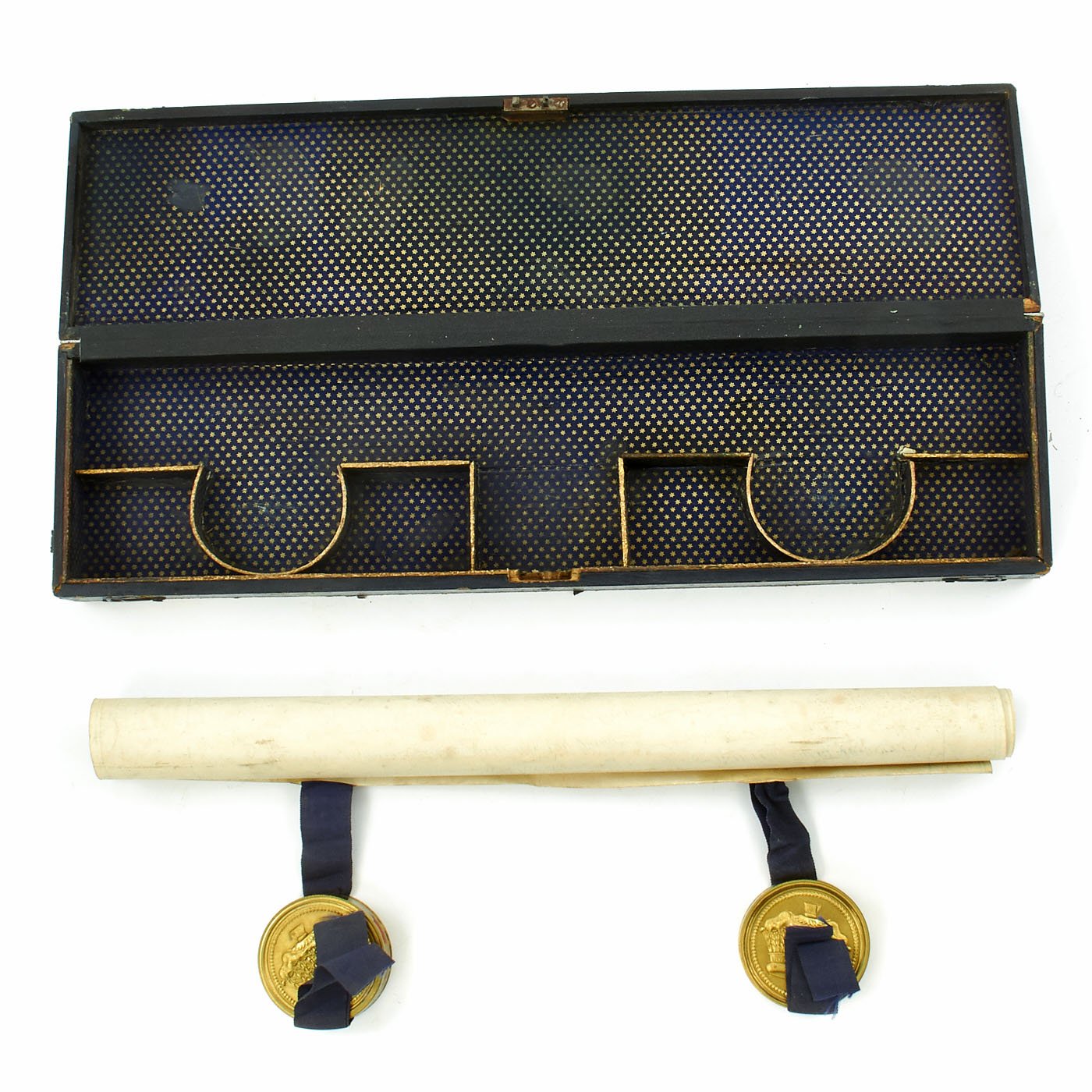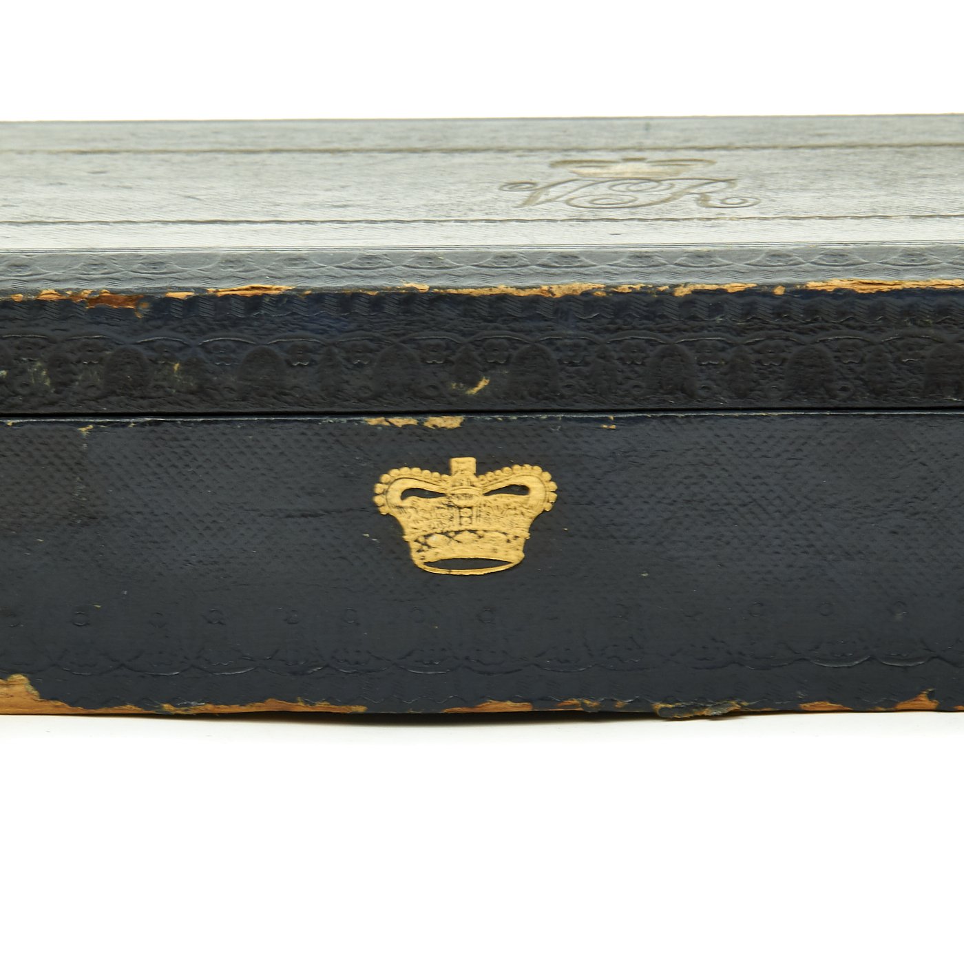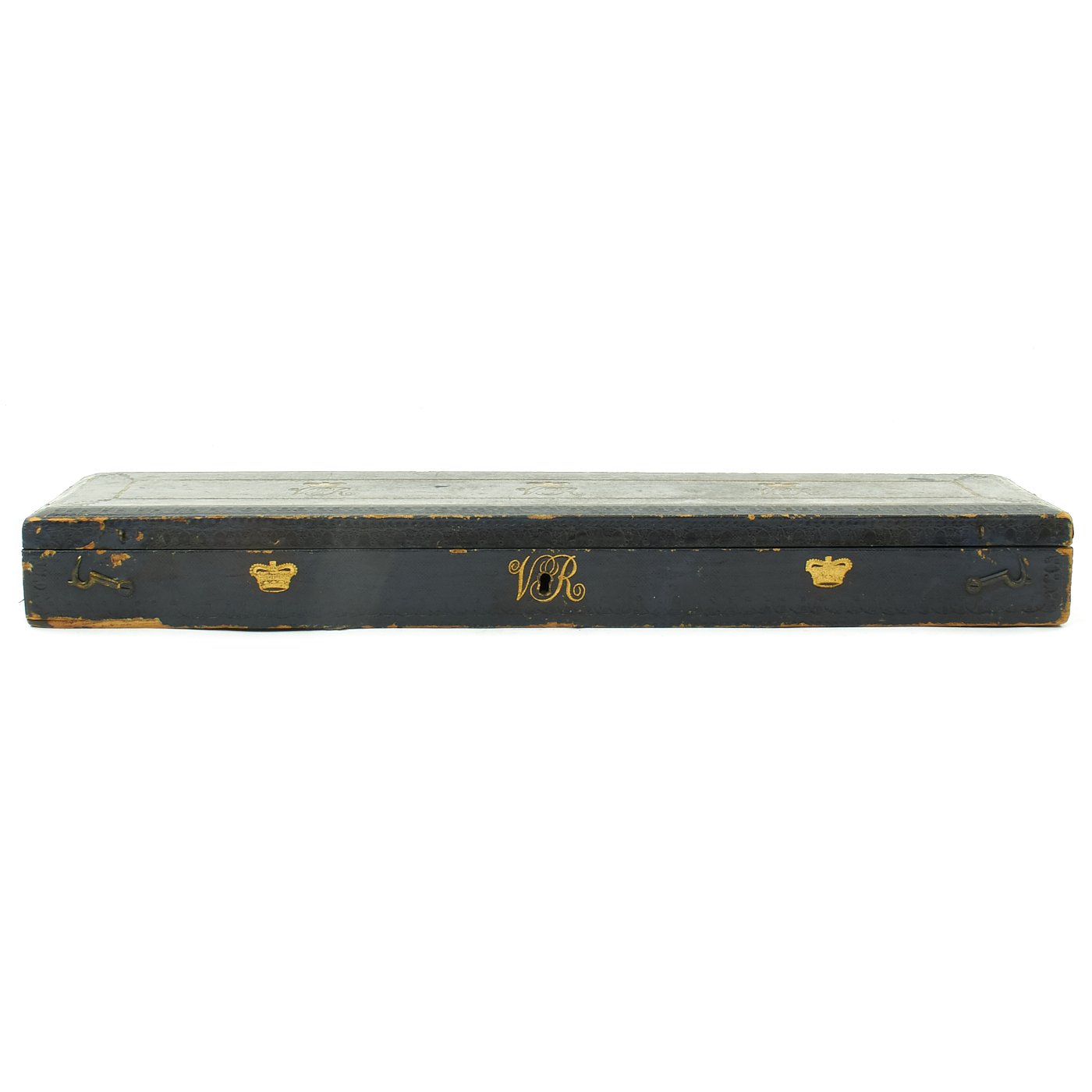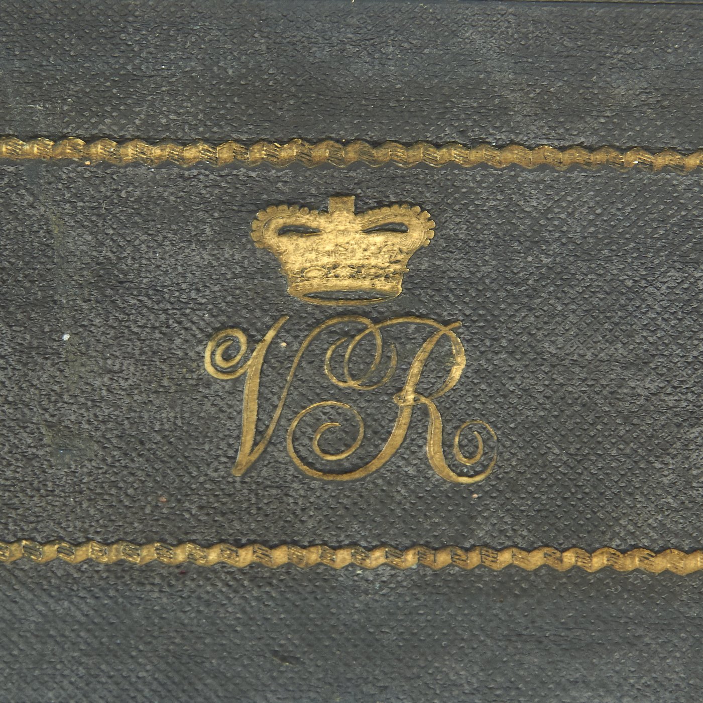 In pristine condition with fully separate typed description on an old piece of paper included, all encased in a magnificent fitted dark blue morocco box bearing gilt embossed borders, the Crown of Queen Victoria and the Initials V.R.. The box measures 22" X 5 1/2" X 2 1/2", and is in great shape.