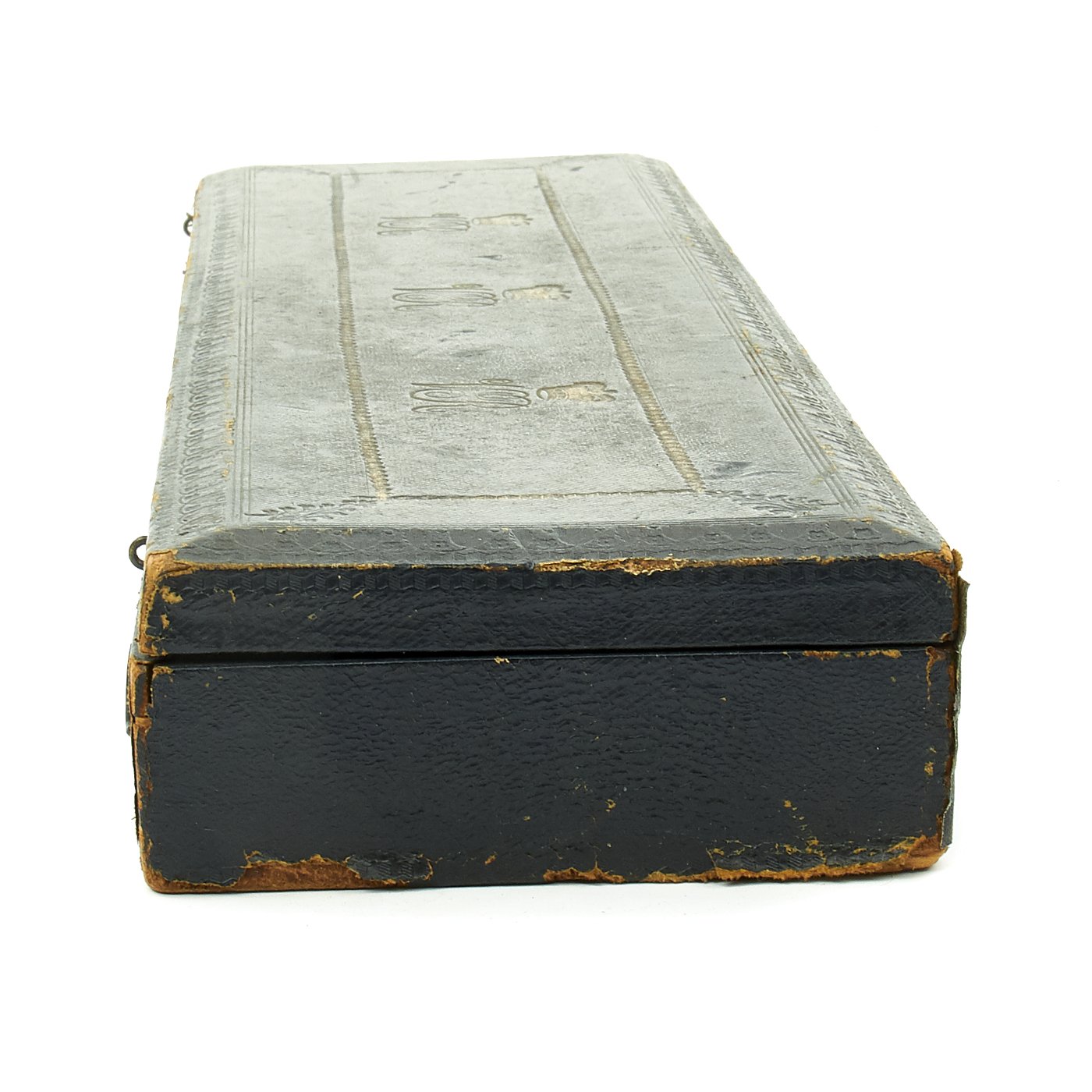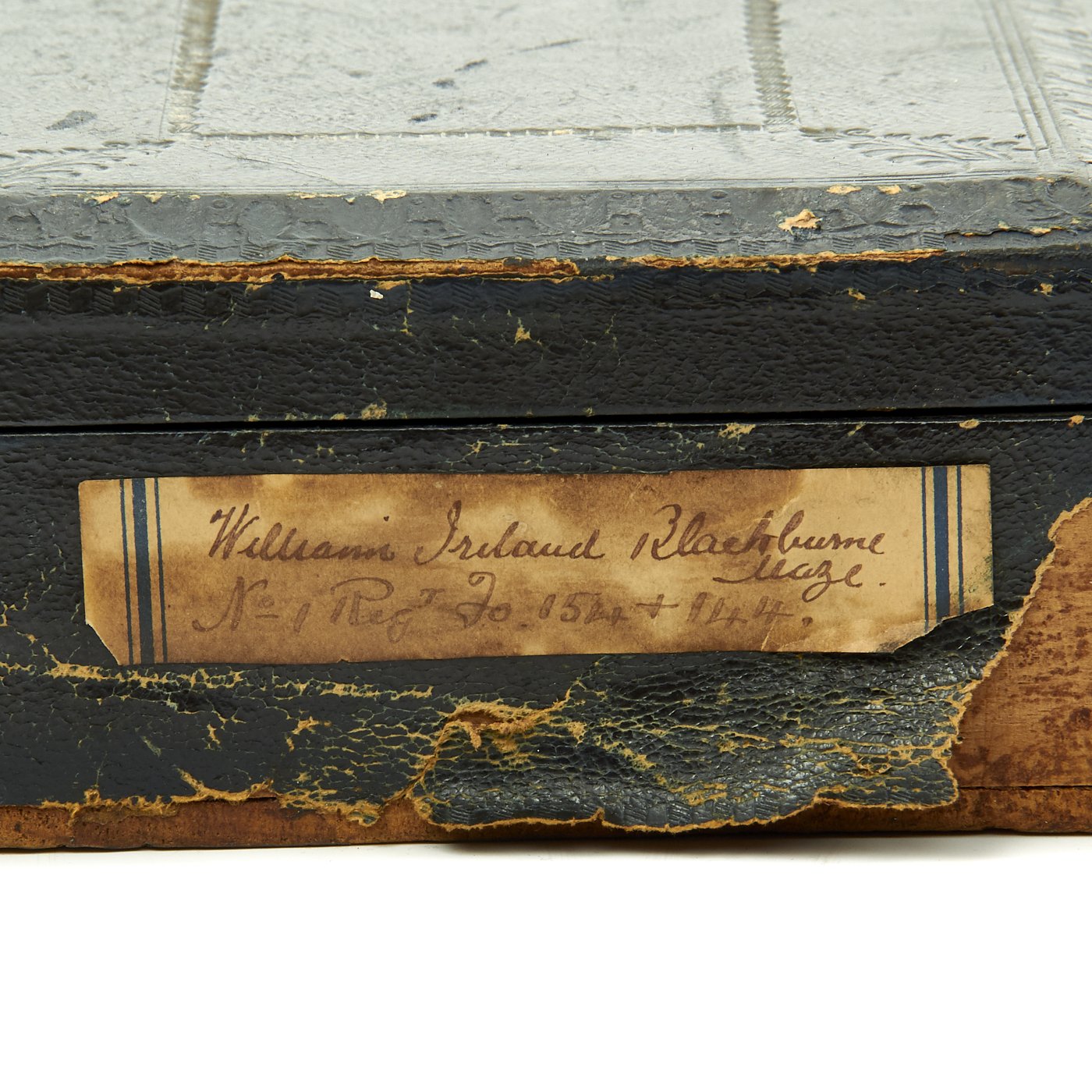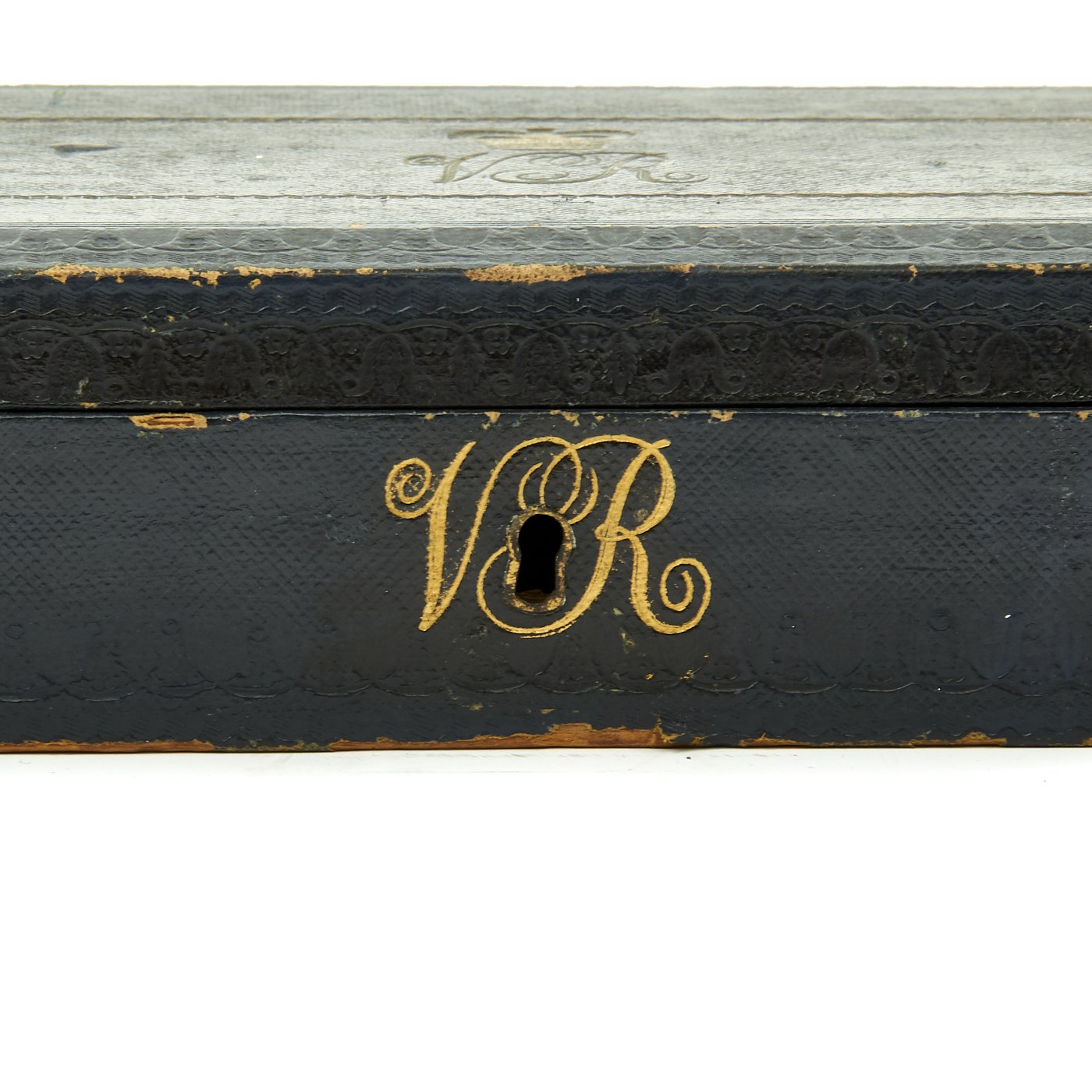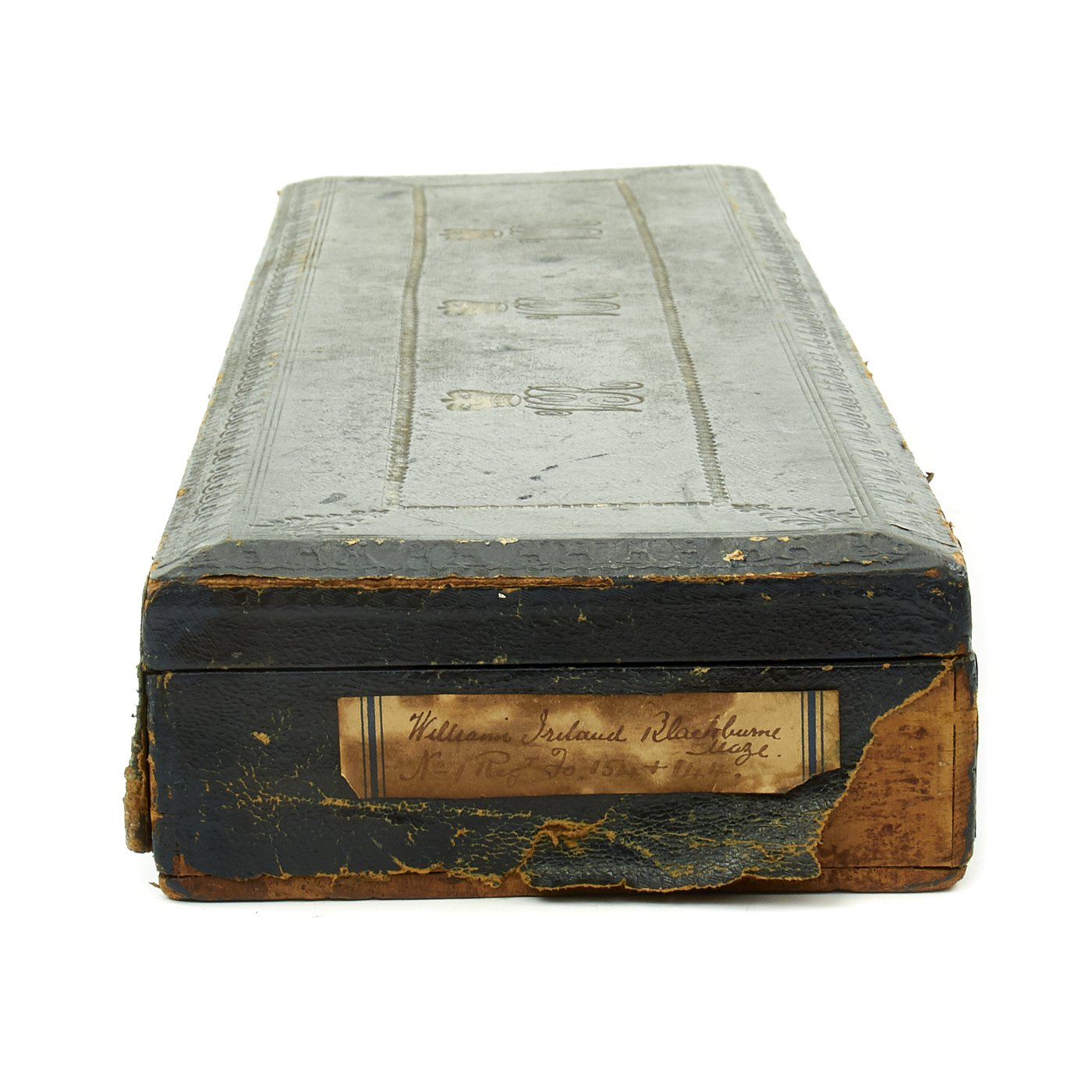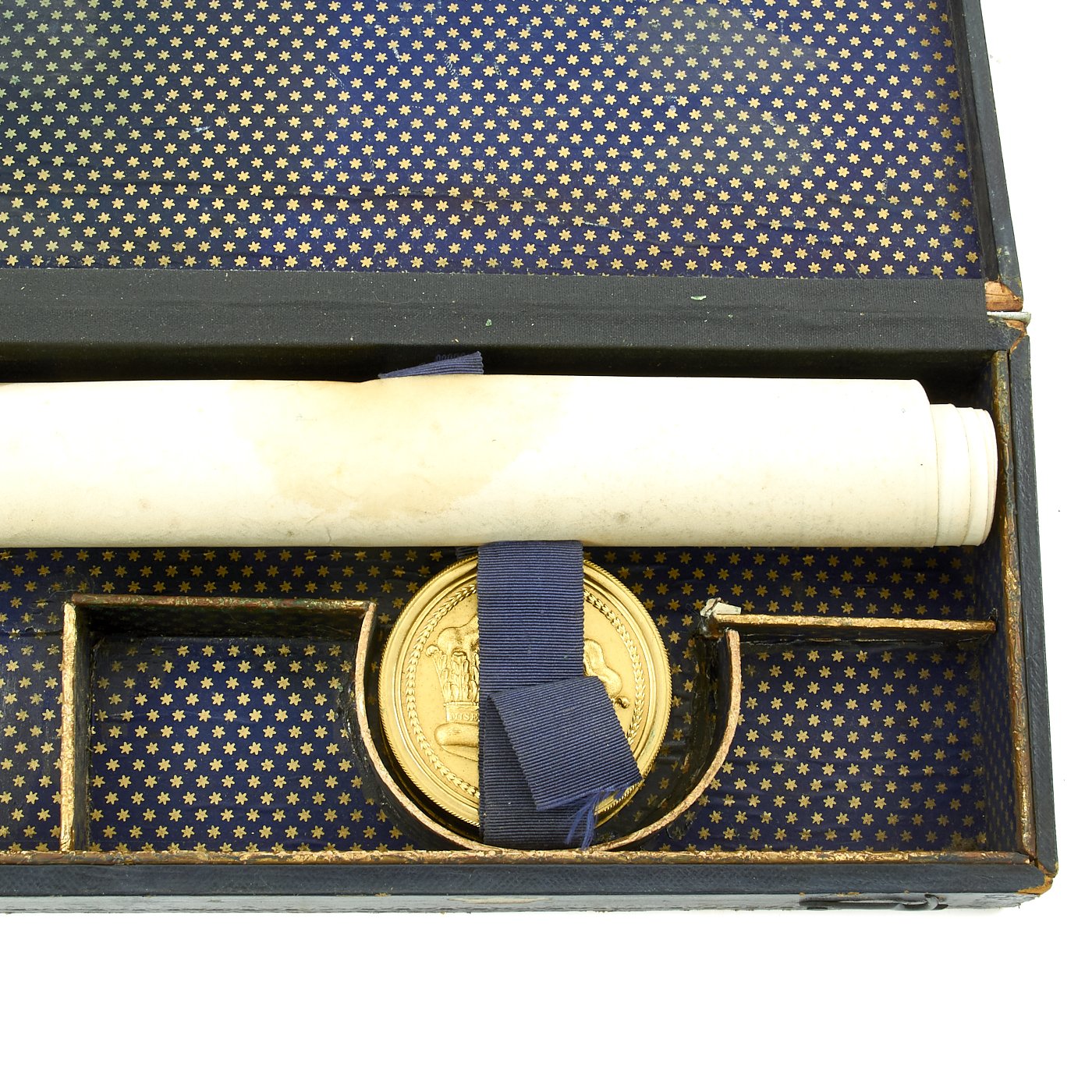 In pristine condition with fully separate typed description on an old piece of paper included, all encased in a magnificent fitted dark blue morocco box bearing gilt embossed borders, the Crown of Queen Victoria and the Initials V.R.. The box measures 22" X 5 1/2" X 2 1/2", and is in great shape.
