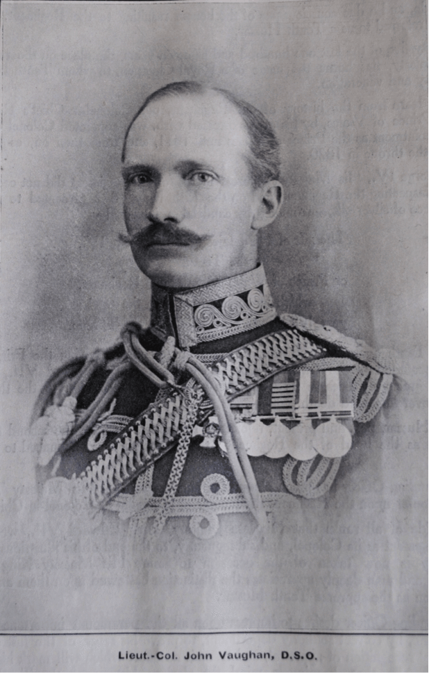 Advanced to Captain in October 1899, Vaughan served throughout the Boer War, onetime as A.D.C. to the G.O.C. Cavalry Division and as D.A.A.G., Intelligence, Cavalry Division. He witnessed extensive action, had command of a column in the relief of Kimberley operations, and was awarded the Queen’s Medal with 6 clasps and the King’s Medal with 2 clasps, in addition to a D.S.O. for a memorable encounter with the enemy at Boschman’s Kop during the Guerilla War. The recommendation stated: On 1 April 1902, near Springs, South Africa, when acting as Intelligence Officer to a column, he led the Queen’s Bays to capture some Boers in a deserted farm. After capturing some prisoners, this regiment was attacked at dawn by superior numbers, and fought a rear-guard action until the 7th Hussars came up and counter-attacked the enemy. Major Vaughan commanded one wing of the Bays during the retirement, after having been wounded before daylight, and subsequently advanced with a squadron of the 7th Hussars to assist them by his knowledge of the country. He continued fighting until he fainted.’