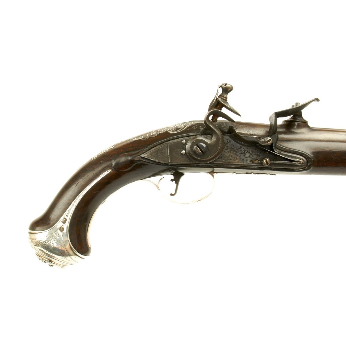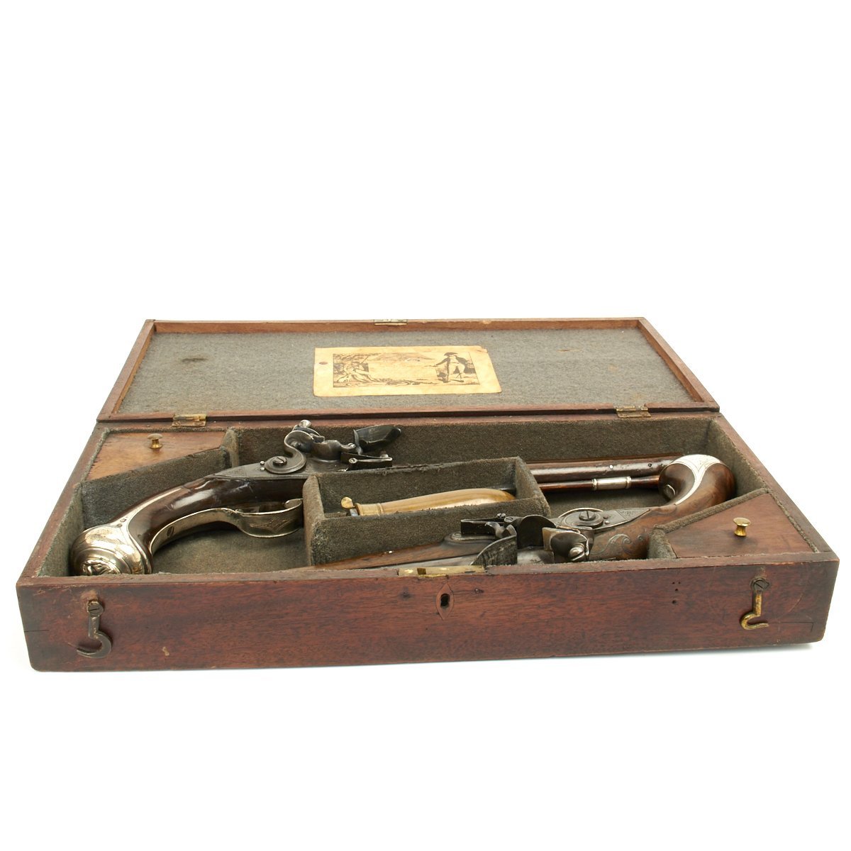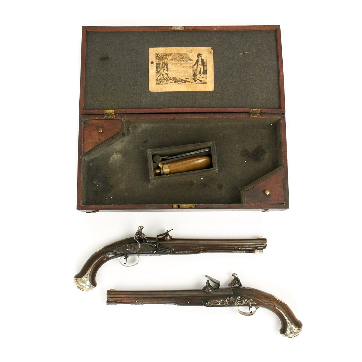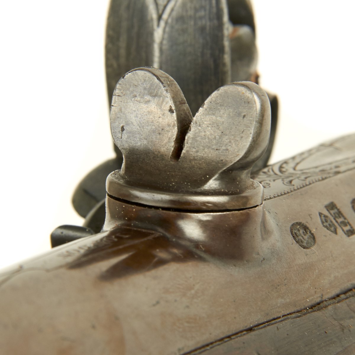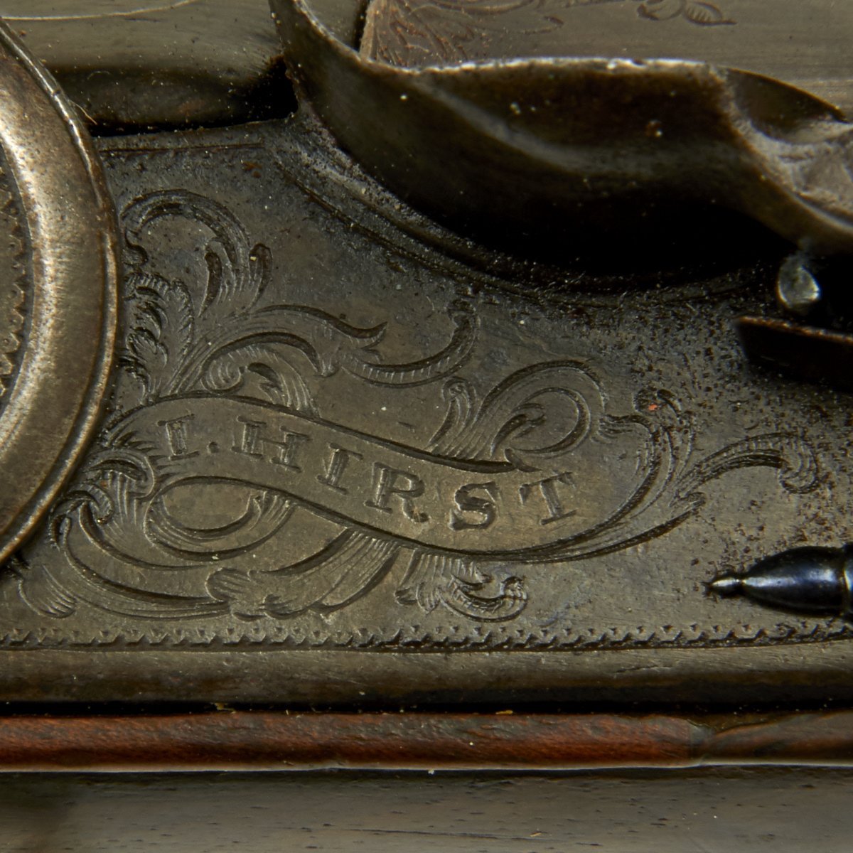 Original Items: One-of-a-kind set. As seen on the History Channel! These exquisite incredibly rare pistols were manufactured in the later portion of the 18th century by the gun maker Jonathan Hirst. Hirst was located at Tower Hill, London and worked from 1760 until 1805. These are incredibly rare due to the fact that each barrel has an elaborately eared back sight. These back sights are also plugs that unscrew allowing access to the barrel which allow these pistols to be loaded from the breech! The advantages of a breech loading weapon include speed of loading and the ability to load an oversize ball inside a rifled barrel. The shooter could load a ball that would otherwise not fit through the muzzle, at least not easily. A tighter ball inside a rifled barrel meant far improved accuracy as the soft lead ball would "grip" the internal rifling grooves causing the ball to spin faster and fly straighter. Breech loading weapons of the late 18th century were intended for marksmen.