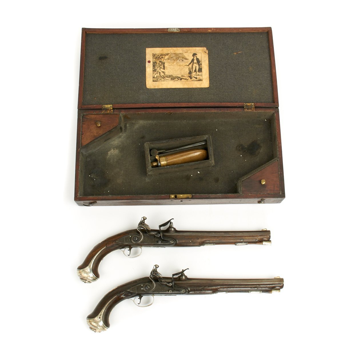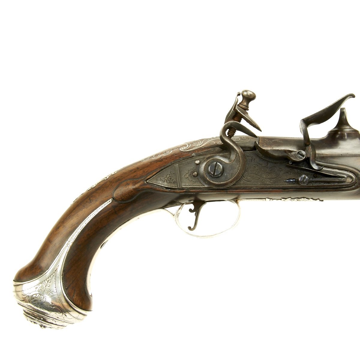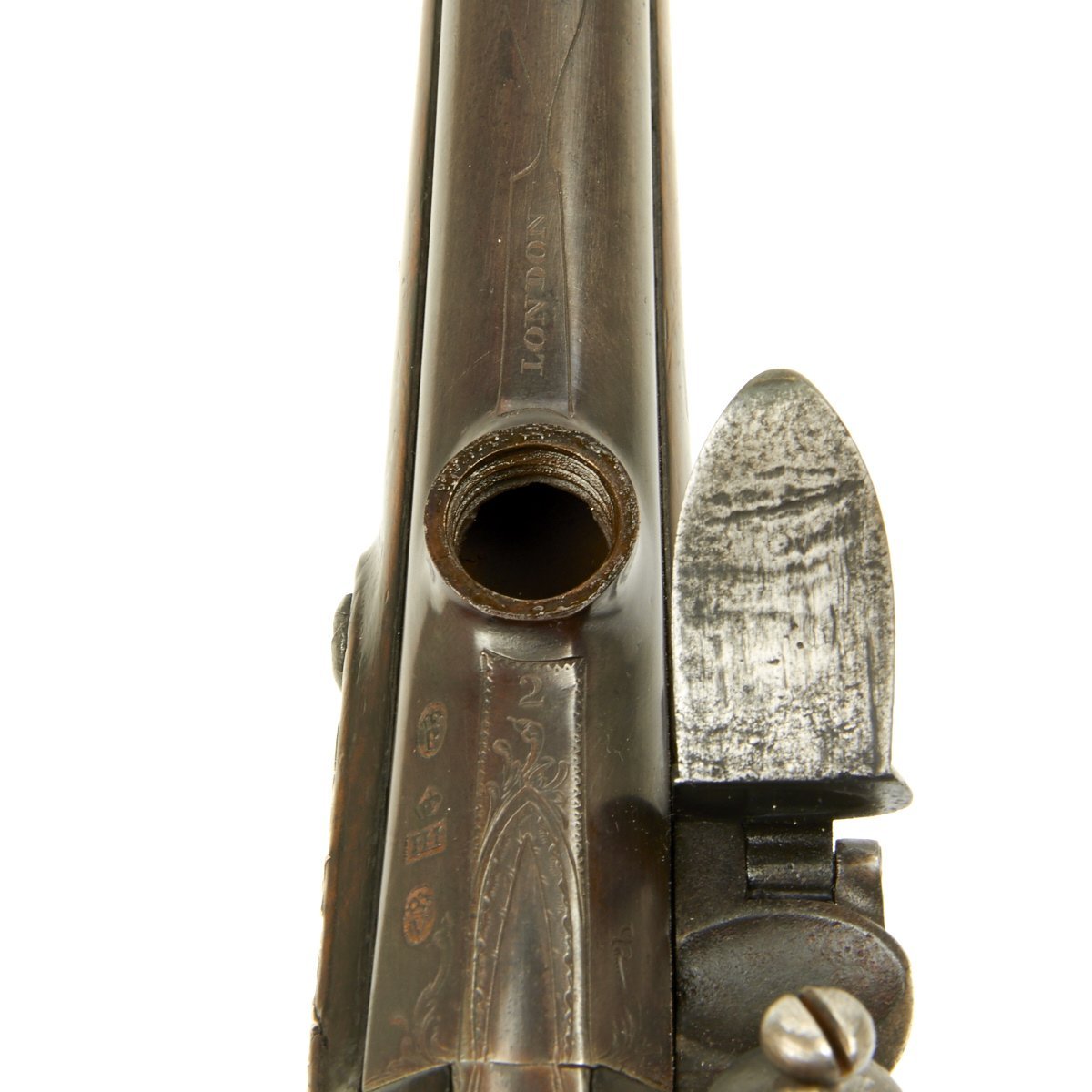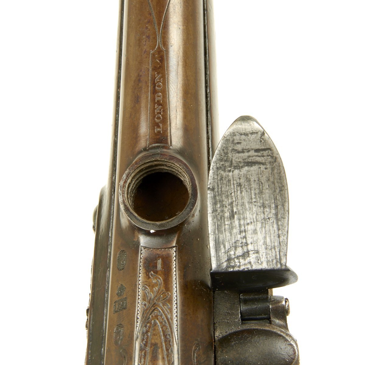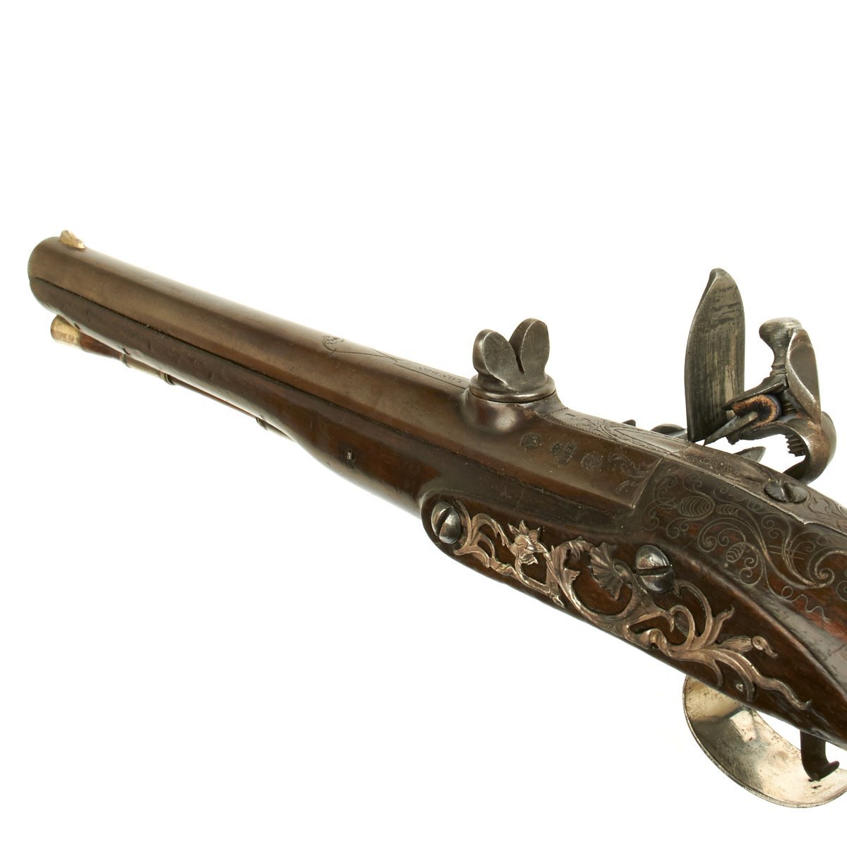 Original Items: One-of-a-kind set. As seen on the History Channel! These exquisite incredibly rare pistols were manufactured in the later portion of the 18th century by the gun maker Jonathan Hirst. Hirst was located at Tower Hill, London and worked from 1760 until 1805. These are incredibly rare due to the fact that each barrel has an elaborately eared back sight. These back sights are also plugs that unscrew allowing access to the barrel which allow these pistols to be loaded from the breech! The advantages of a breech loading weapon include speed of loading and the ability to load an oversize ball inside a rifled barrel. The shooter could load a ball that would otherwise not fit through the muzzle, at least not easily. A tighter ball inside a rifled barrel meant far improved accuracy as the soft lead ball would "grip" the internal rifling grooves causing the ball to spin faster and fly straighter. Breech loading weapons of the late 18th century were intended for marksmen.