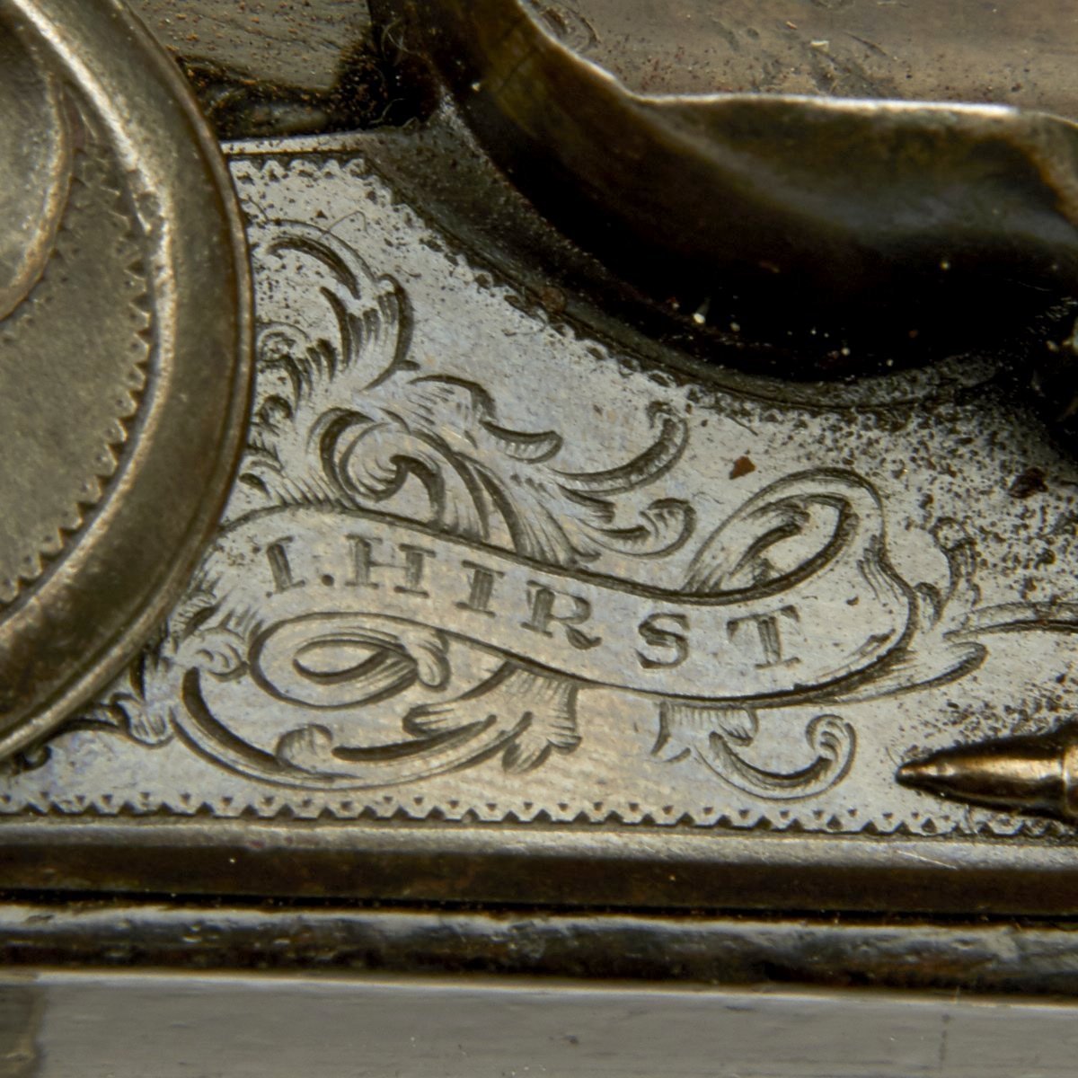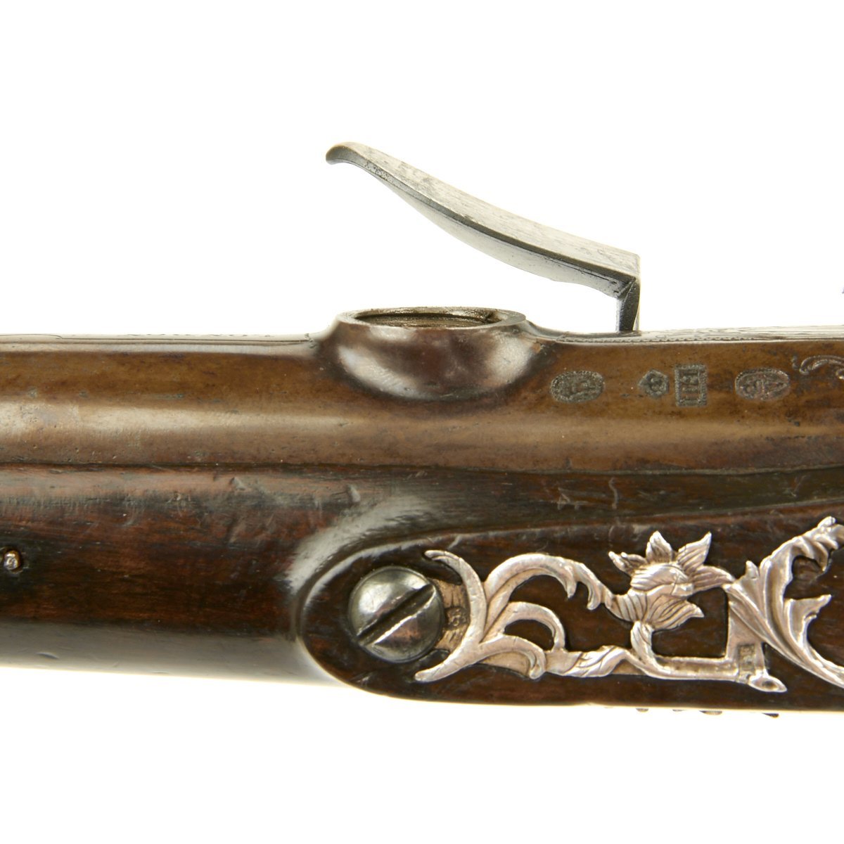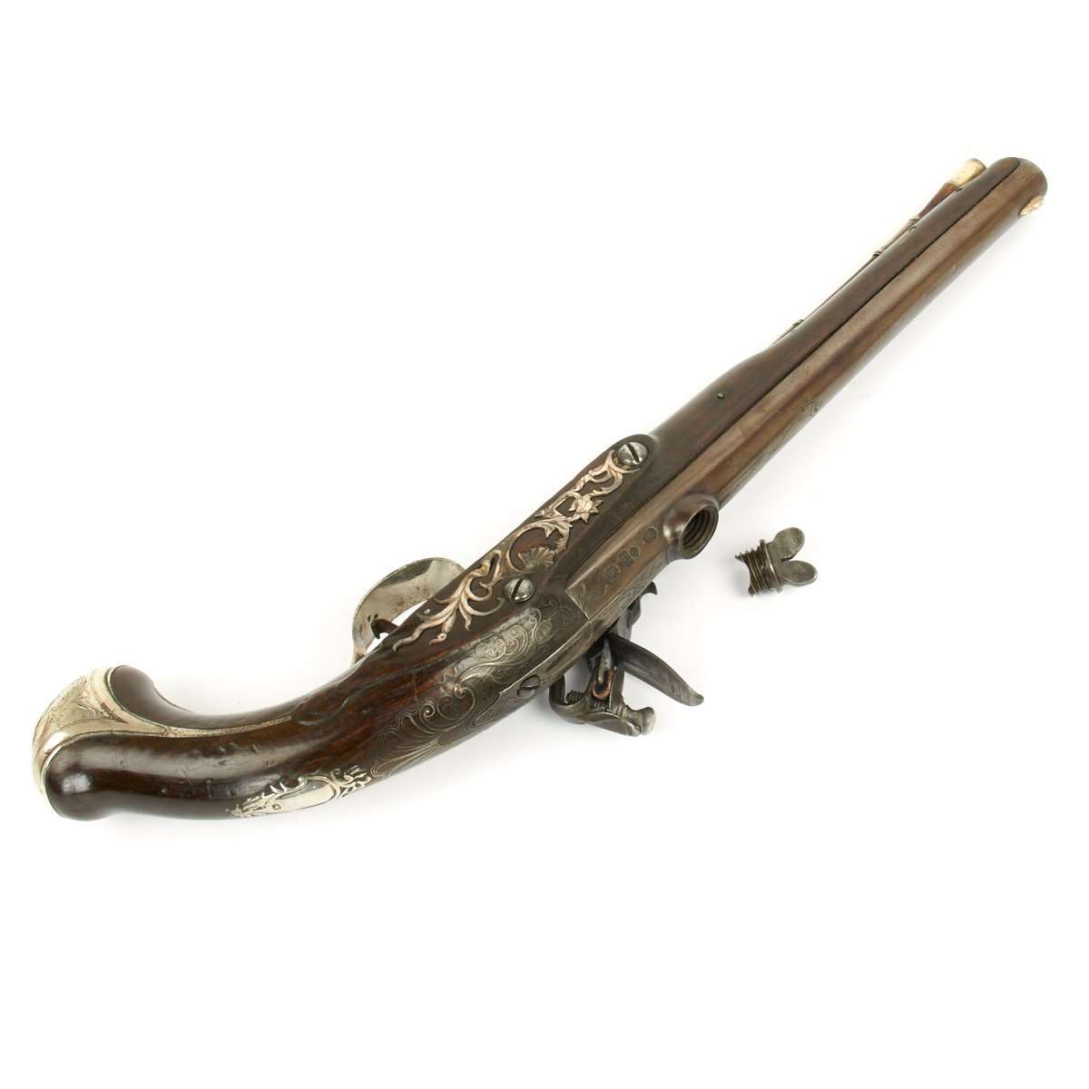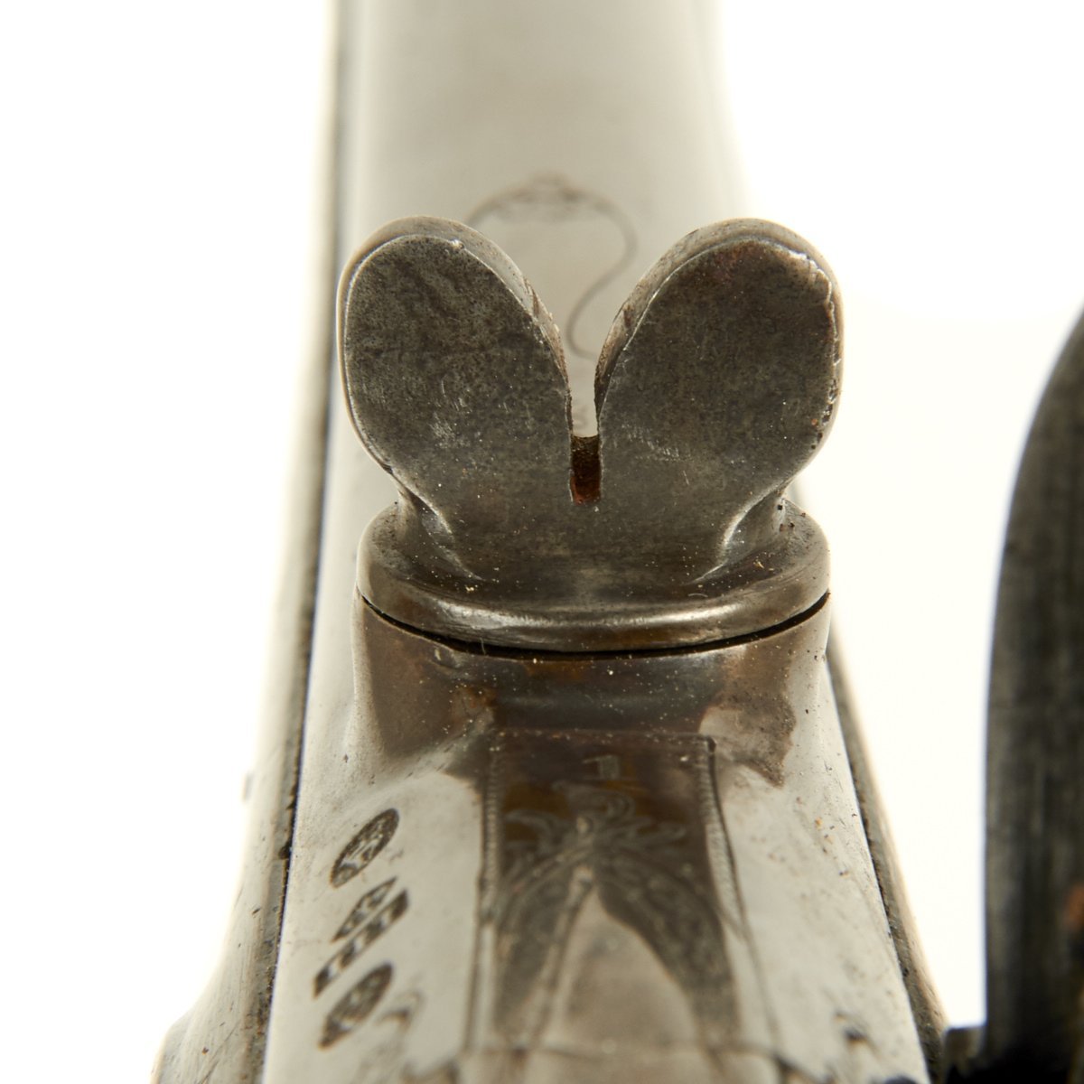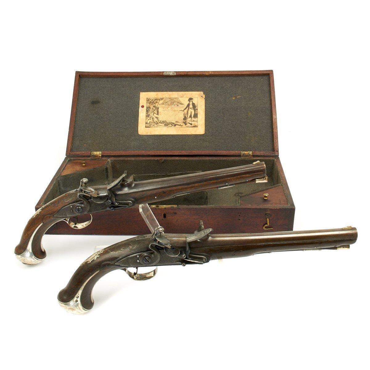 Original Items: One-of-a-kind set. As seen on the History Channel! These exquisite incredibly rare pistols were manufactured in the later portion of the 18th century by the gun maker Jonathan Hirst. Hirst was located at Tower Hill, London and worked from 1760 until 1805. These are incredibly rare due to the fact that each barrel has an elaborately eared back sight. These back sights are also plugs that unscrew allowing access to the barrel which allow these pistols to be loaded from the breech! The advantages of a breech loading weapon include speed of loading and the ability to load an oversize ball inside a rifled barrel. The shooter could load a ball that would otherwise not fit through the muzzle, at least not easily. A tighter ball inside a rifled barrel meant far improved accuracy as the soft lead ball would "grip" the internal rifling grooves causing the ball to spin faster and fly straighter. Breech loading weapons of the late 18th century were intended for marksmen.