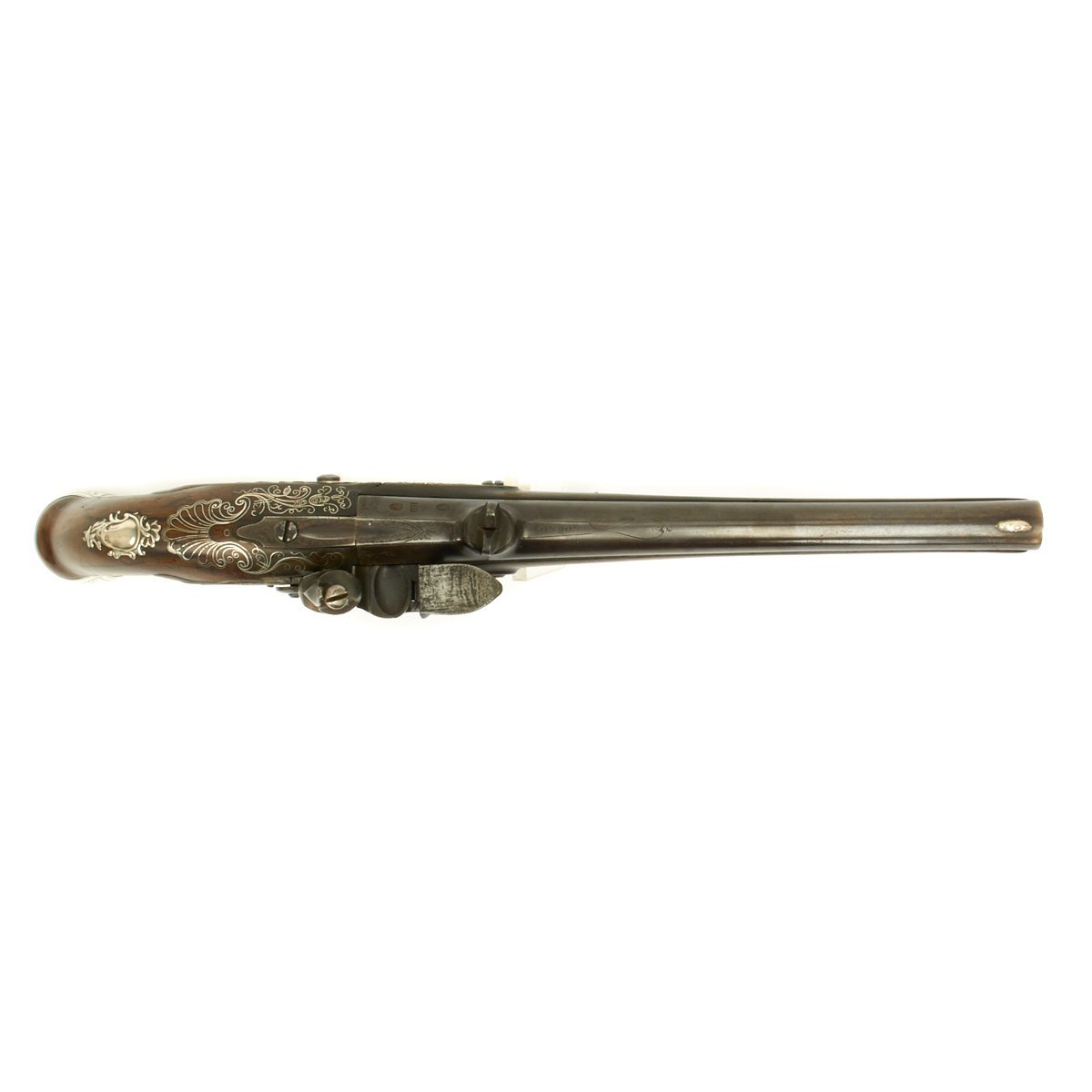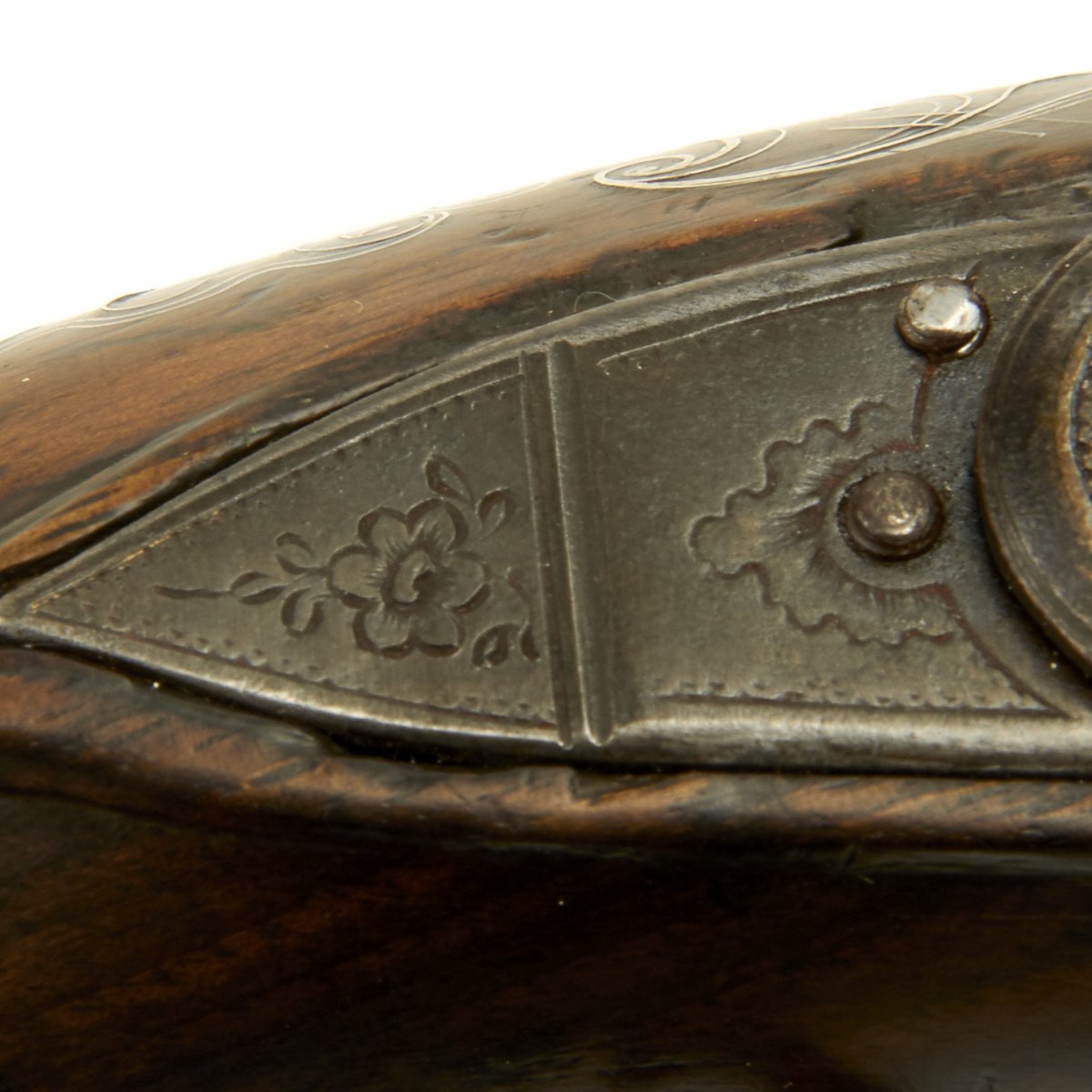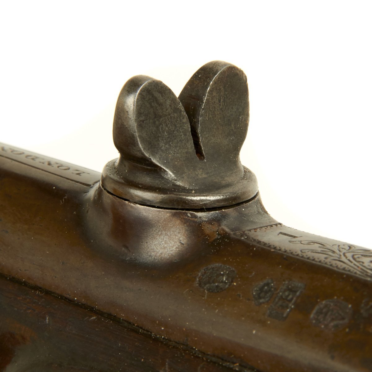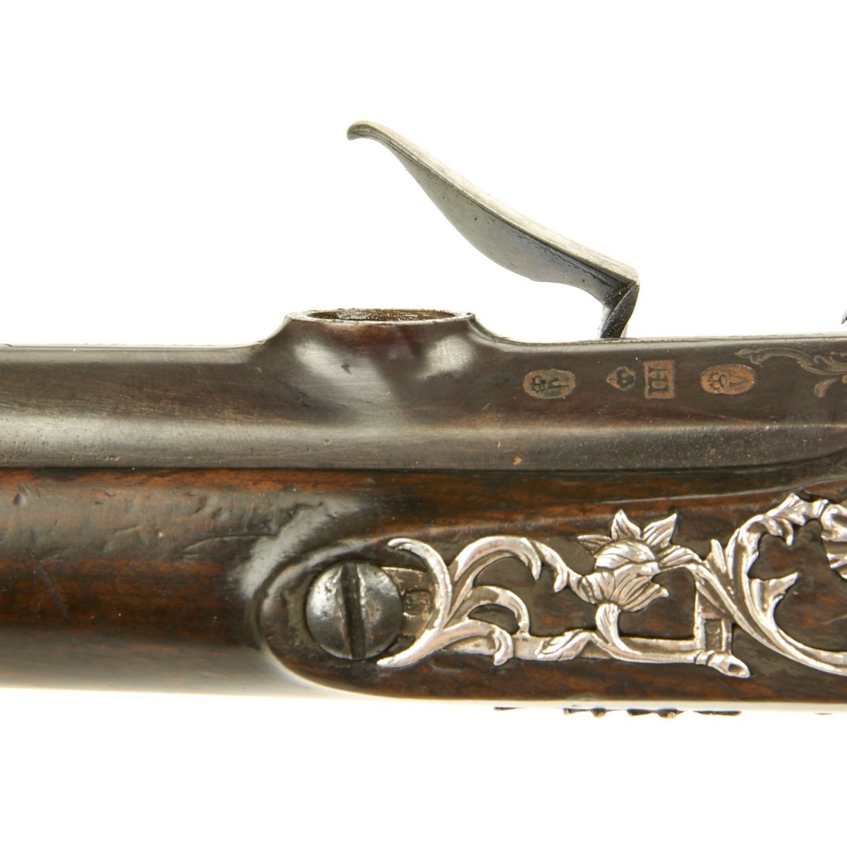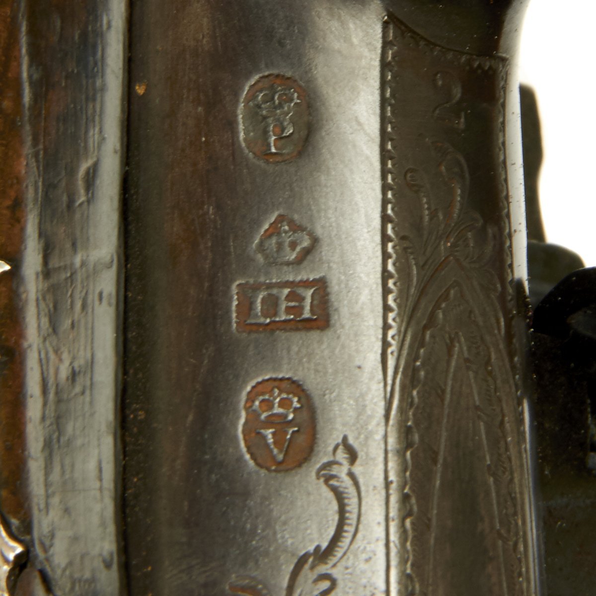 Original Items: One-of-a-kind set. As seen on the History Channel! These exquisite incredibly rare pistols were manufactured in the later portion of the 18th century by the gun maker Jonathan Hirst. Hirst was located at Tower Hill, London and worked from 1760 until 1805. These are incredibly rare due to the fact that each barrel has an elaborately eared back sight. These back sights are also plugs that unscrew allowing access to the barrel which allow these pistols to be loaded from the breech! The advantages of a breech loading weapon include speed of loading and the ability to load an oversize ball inside a rifled barrel. The shooter could load a ball that would otherwise not fit through the muzzle, at least not easily. A tighter ball inside a rifled barrel meant far improved accuracy as the soft lead ball would "grip" the internal rifling grooves causing the ball to spin faster and fly straighter. Breech loading weapons of the late 18th century were intended for marksmen.