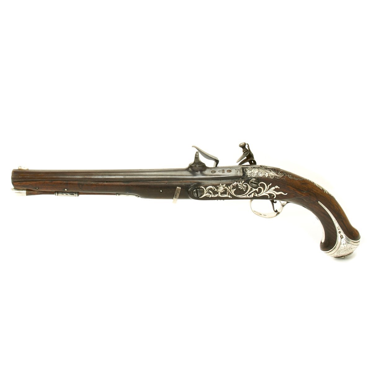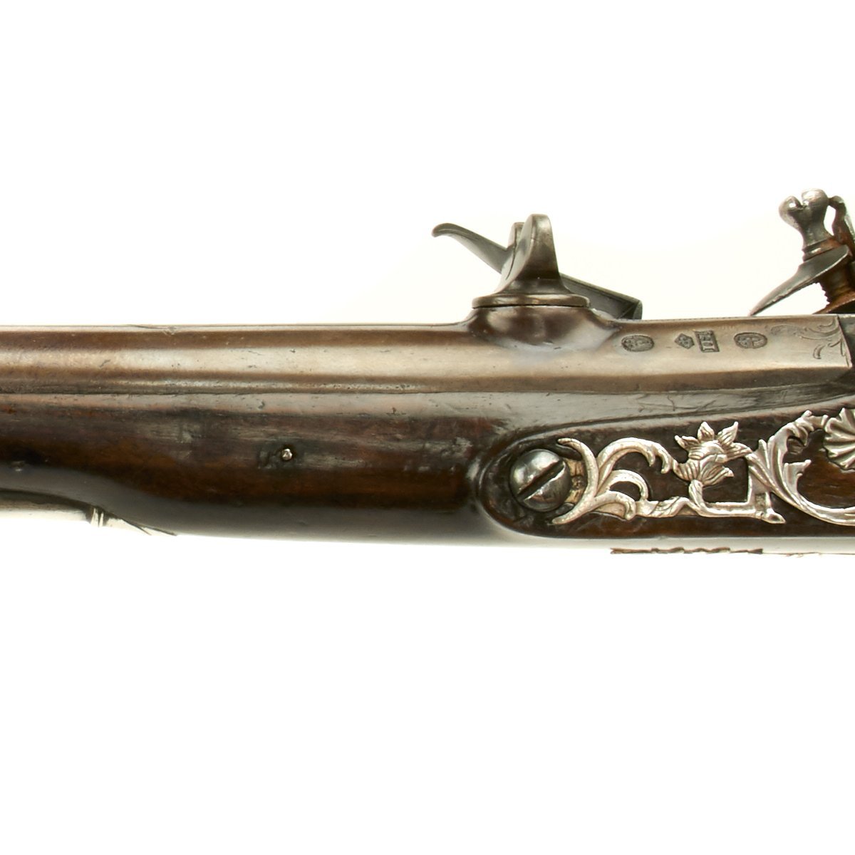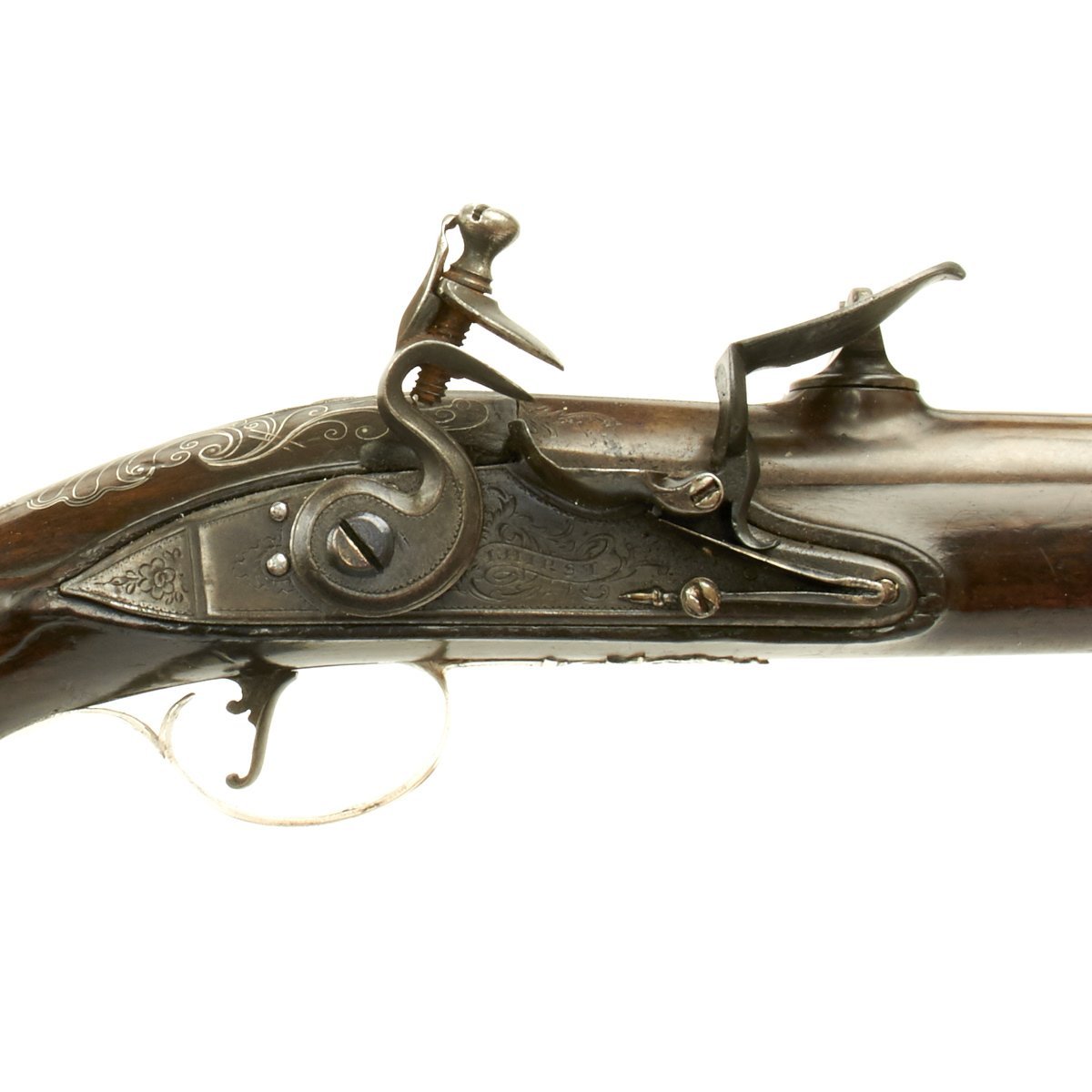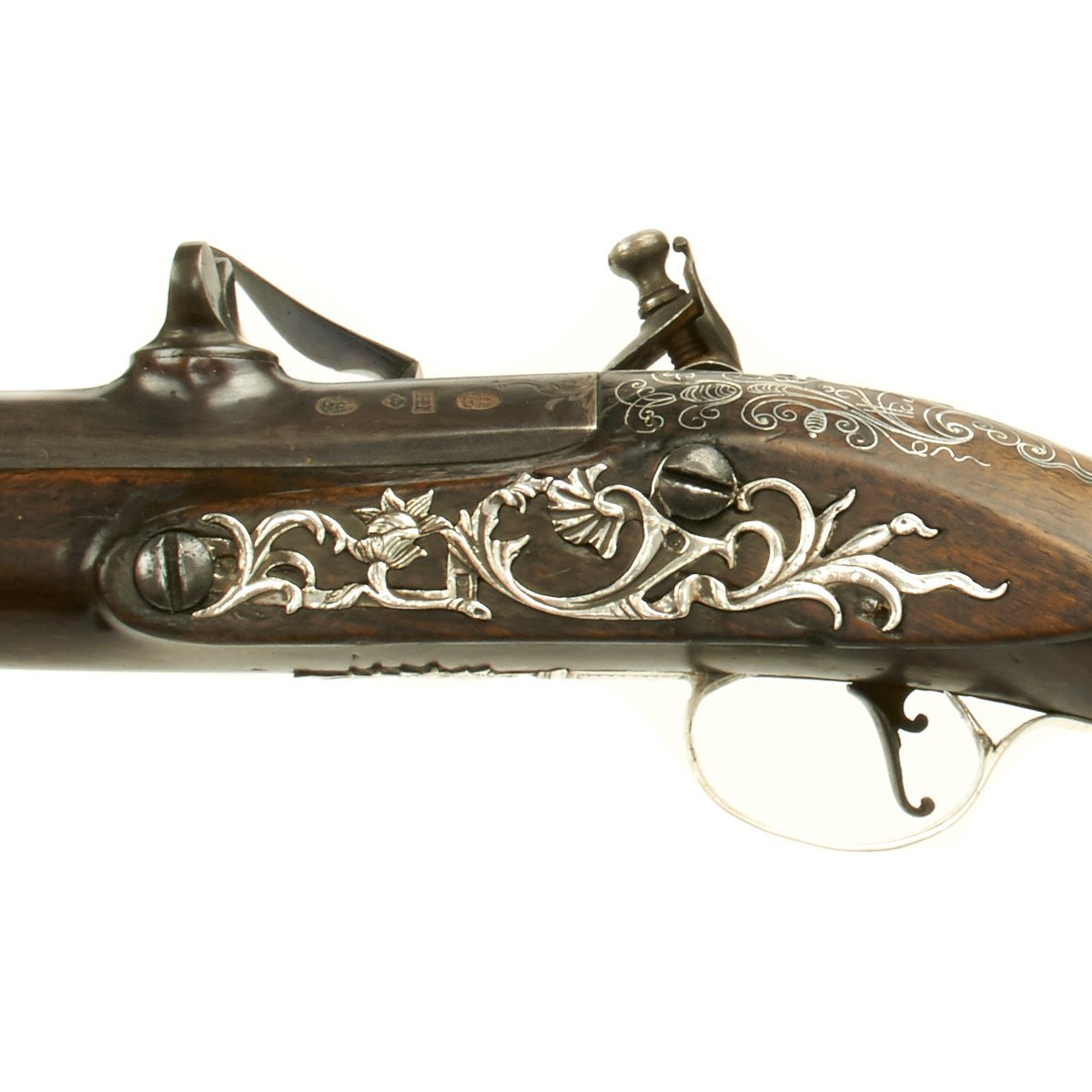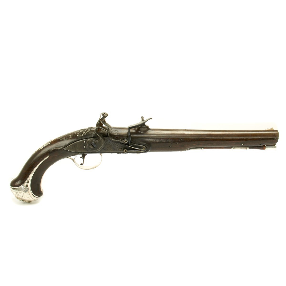 Original Items: One-of-a-kind set. As seen on the History Channel! These exquisite incredibly rare pistols were manufactured in the later portion of the 18th century by the gun maker Jonathan Hirst. Hirst was located at Tower Hill, London and worked from 1760 until 1805. These are incredibly rare due to the fact that each barrel has an elaborately eared back sight. These back sights are also plugs that unscrew allowing access to the barrel which allow these pistols to be loaded from the breech! The advantages of a breech loading weapon include speed of loading and the ability to load an oversize ball inside a rifled barrel. The shooter could load a ball that would otherwise not fit through the muzzle, at least not easily. A tighter ball inside a rifled barrel meant far improved accuracy as the soft lead ball would "grip" the internal rifling grooves causing the ball to spin faster and fly straighter. Breech loading weapons of the late 18th century were intended for marksmen.