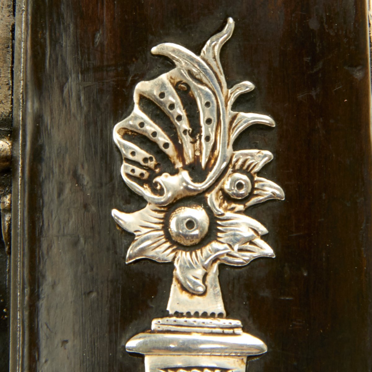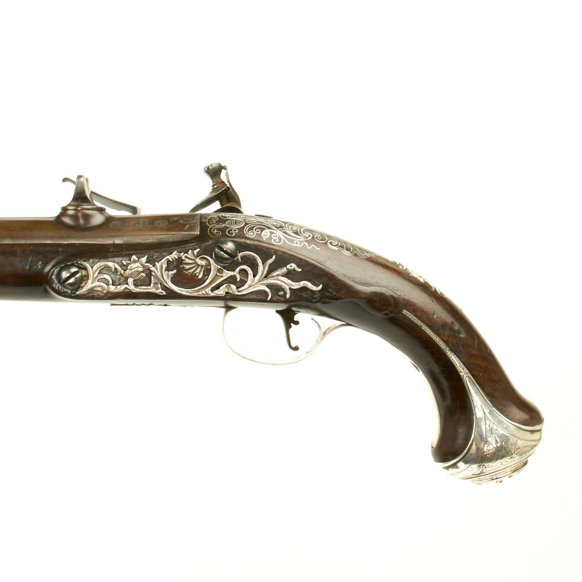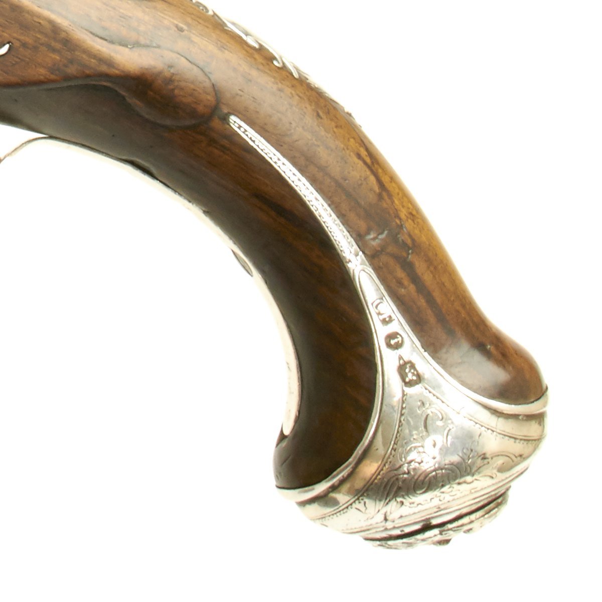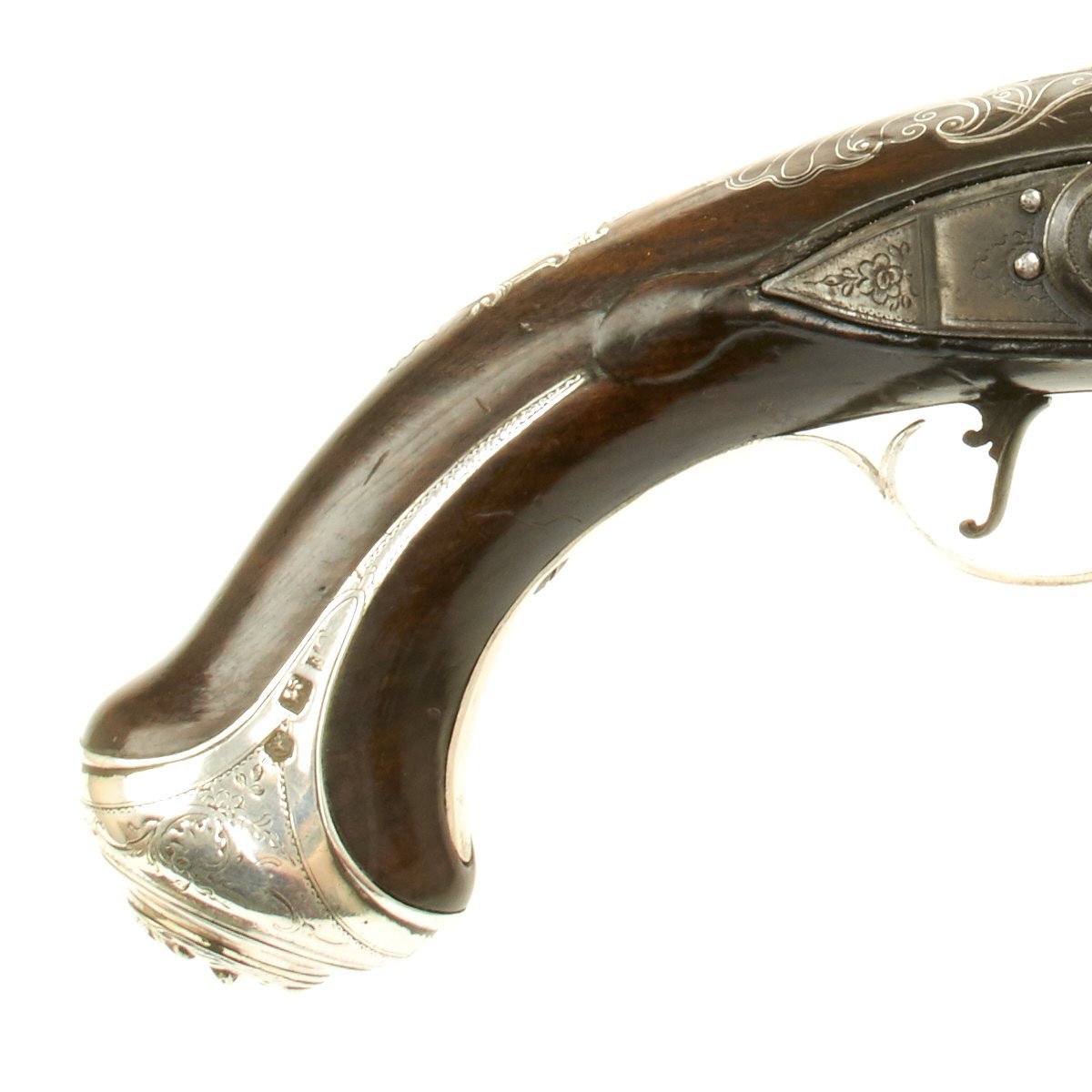 This matched pair measure 16 inches in overall length with 10 inch barrels. They feature elaborate gorgeous silver mounts that are Hallmarked to Birmingham in the late 18th century. The butt caps feature The stunning hardwood stocks are meticulously inlaid with silver wire with intricate designs behind and around the barrel tang. The mechanics of the barrel plugs are near perfect with one pistol allowing the plug to overturn slightly. The barrels are crisply proof marked, the locks are both marked J. Hirst and the the barrels are both marked London. Hirst was known for constructing breach loading flintlock weapons including pistols and the Ferguson rifle, however, very few examples of Hirst breech loading pistols exist.