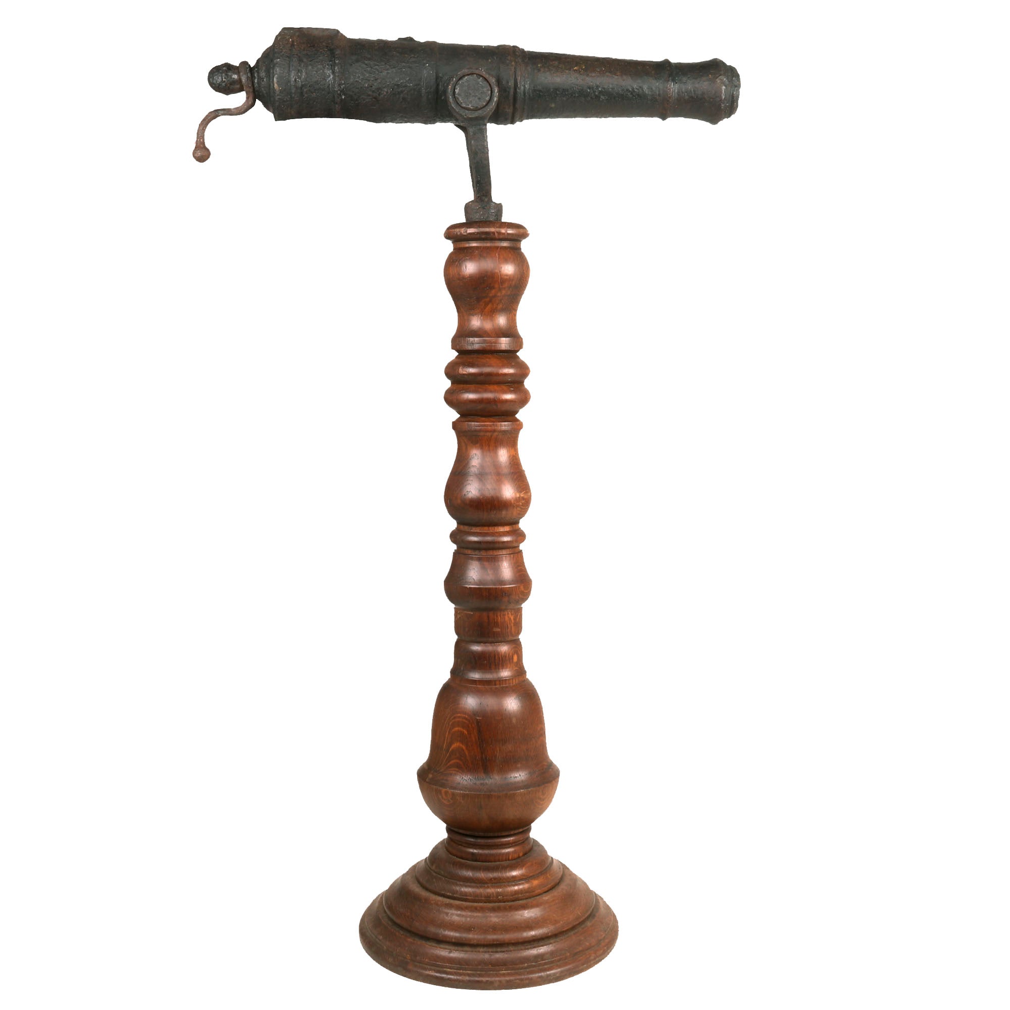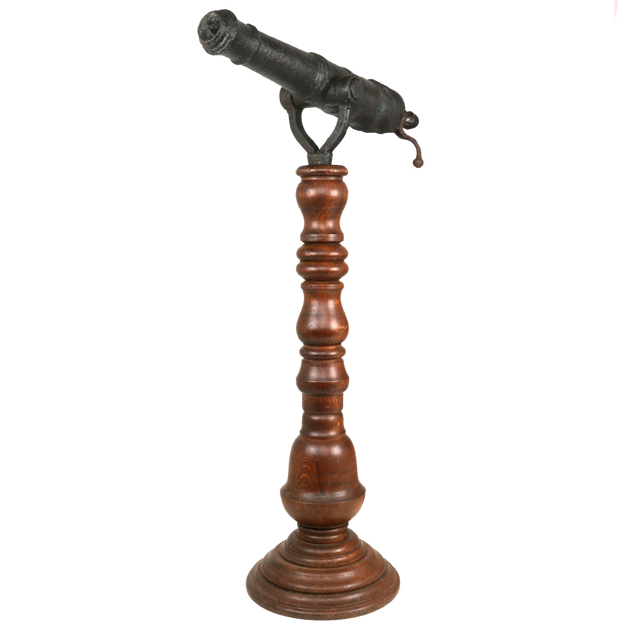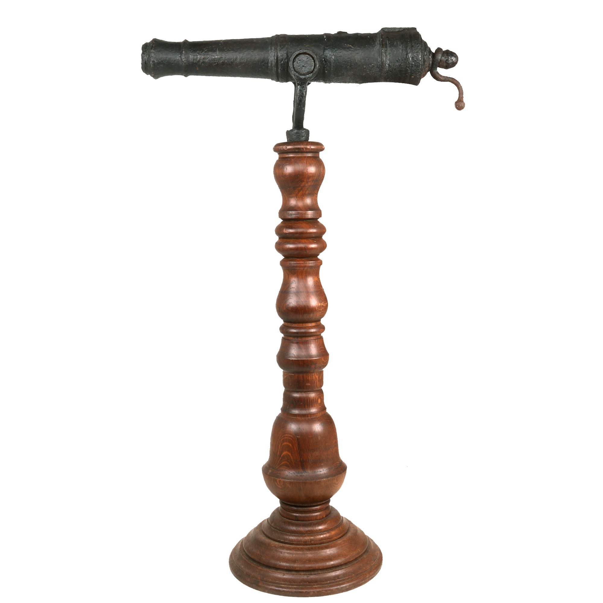 This is a typical gun that would be found on many maritime vessels in the late 18th century and early 19th century to protect cargo against pirates or other risks. Maritime insurers of the era such as Lloyds Bank of London required merchant vessels to be armed with such a cannon. This is a fine cannon that displays well on its original swivel yoke that is not often retained. Also included is an un-associated 3 foot tall antique wooden church candle holder that makes the gun present exceptionally well, which weighs approximately 24 lbs.