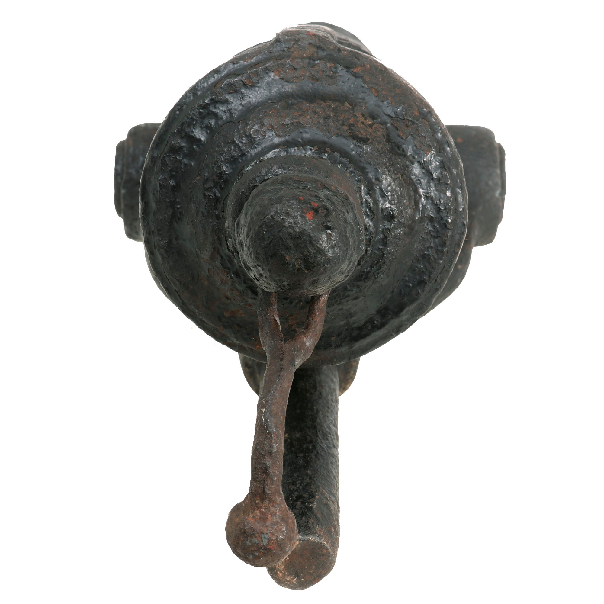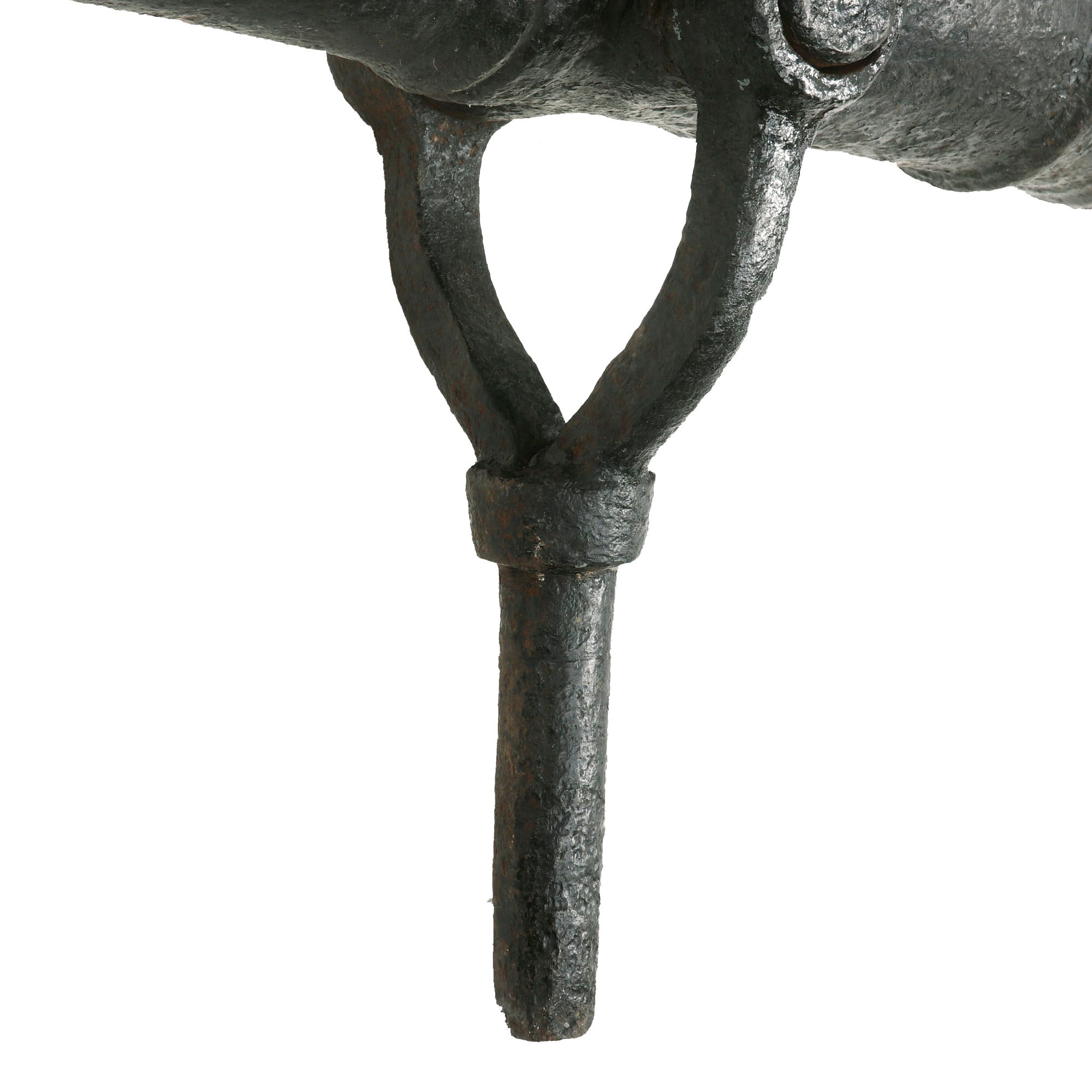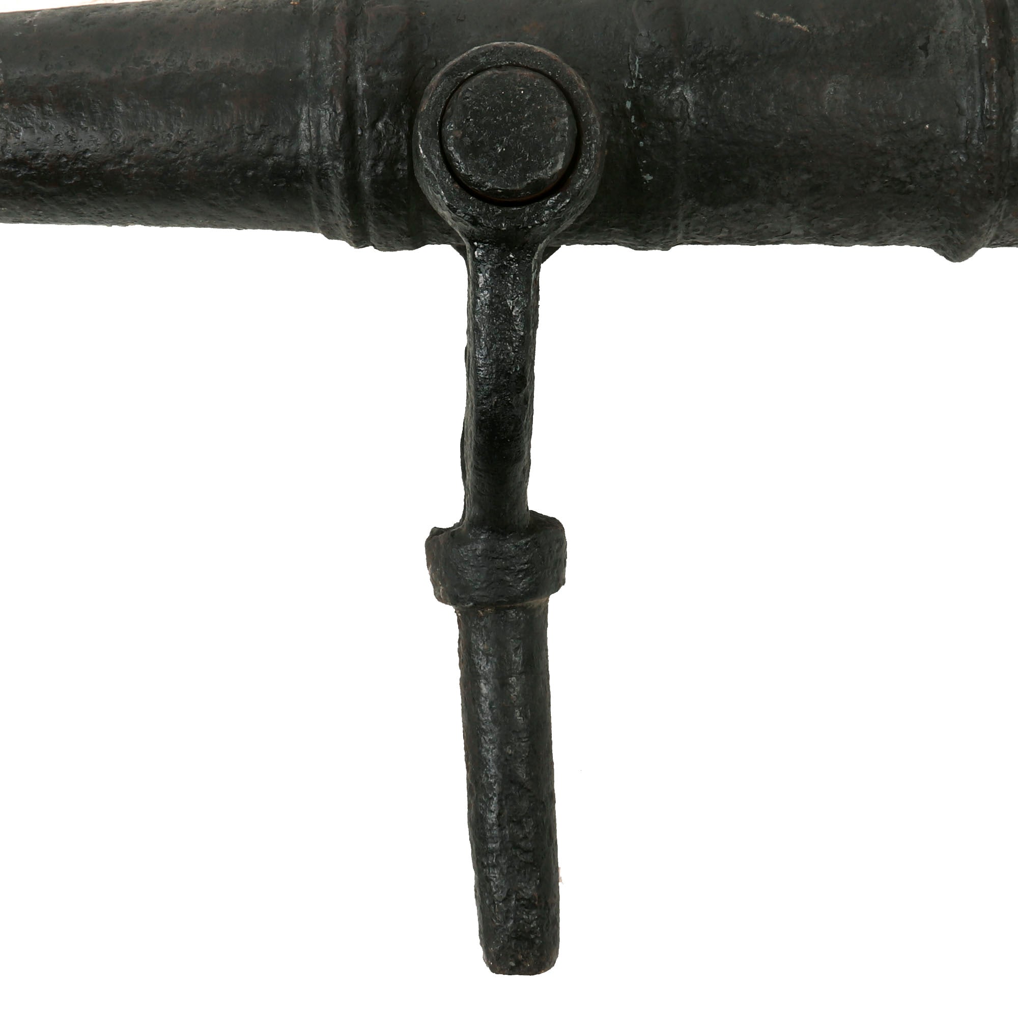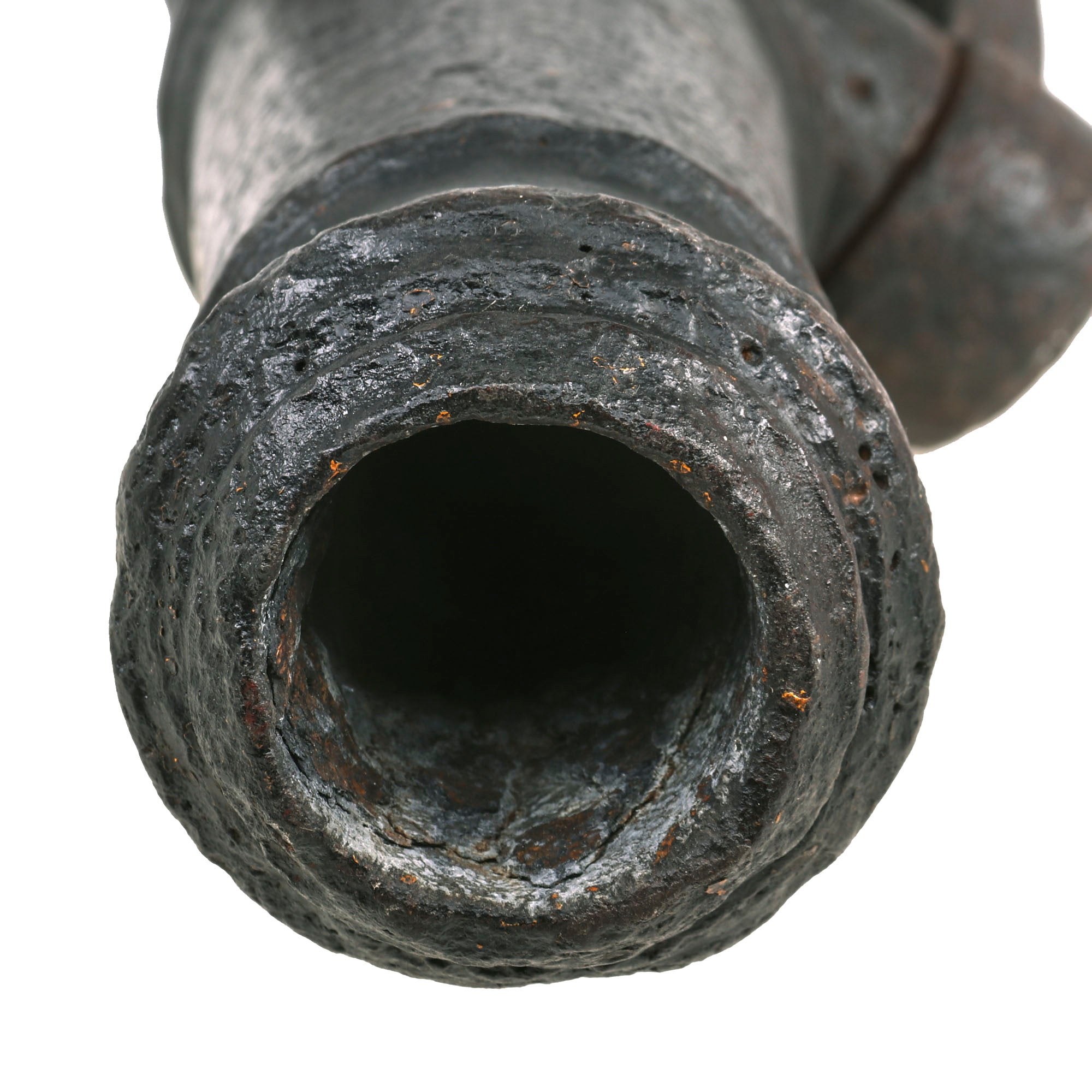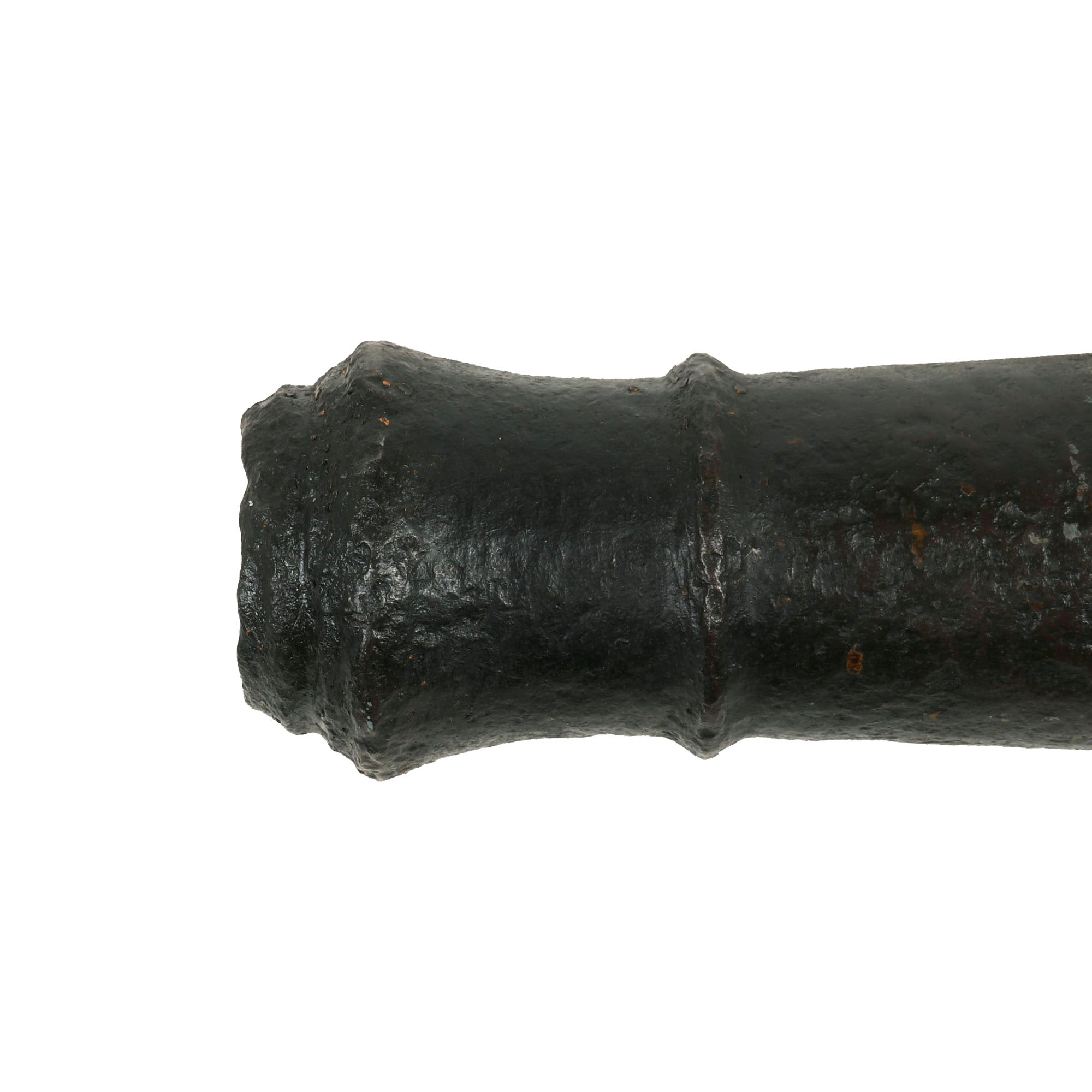 Banded tapered tube measures 24” and about 26.5” including cascabel. Measures 8.5” wide at trunnions with a 12” yoke. Also included is the iron tiller that measures 4" in length. The tiller was a period produced accessory to aid in the maneuverability of the gun. Bore measures 2" making this quite a powerful little gun. Overall weight of the gun with yoke is approximately 60 Lbs.