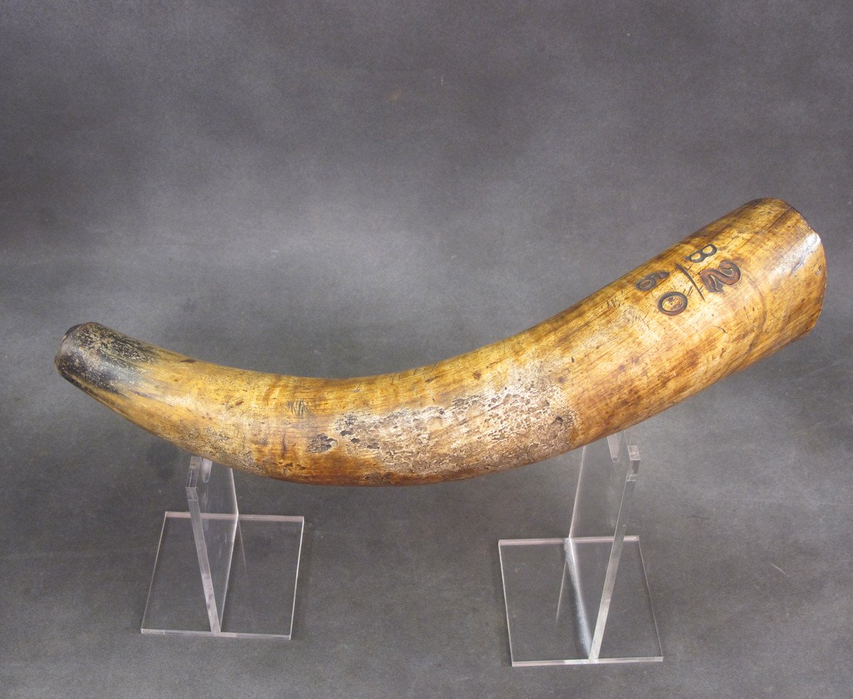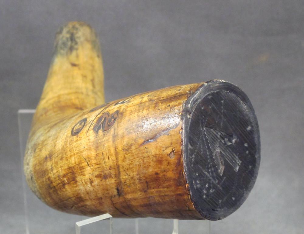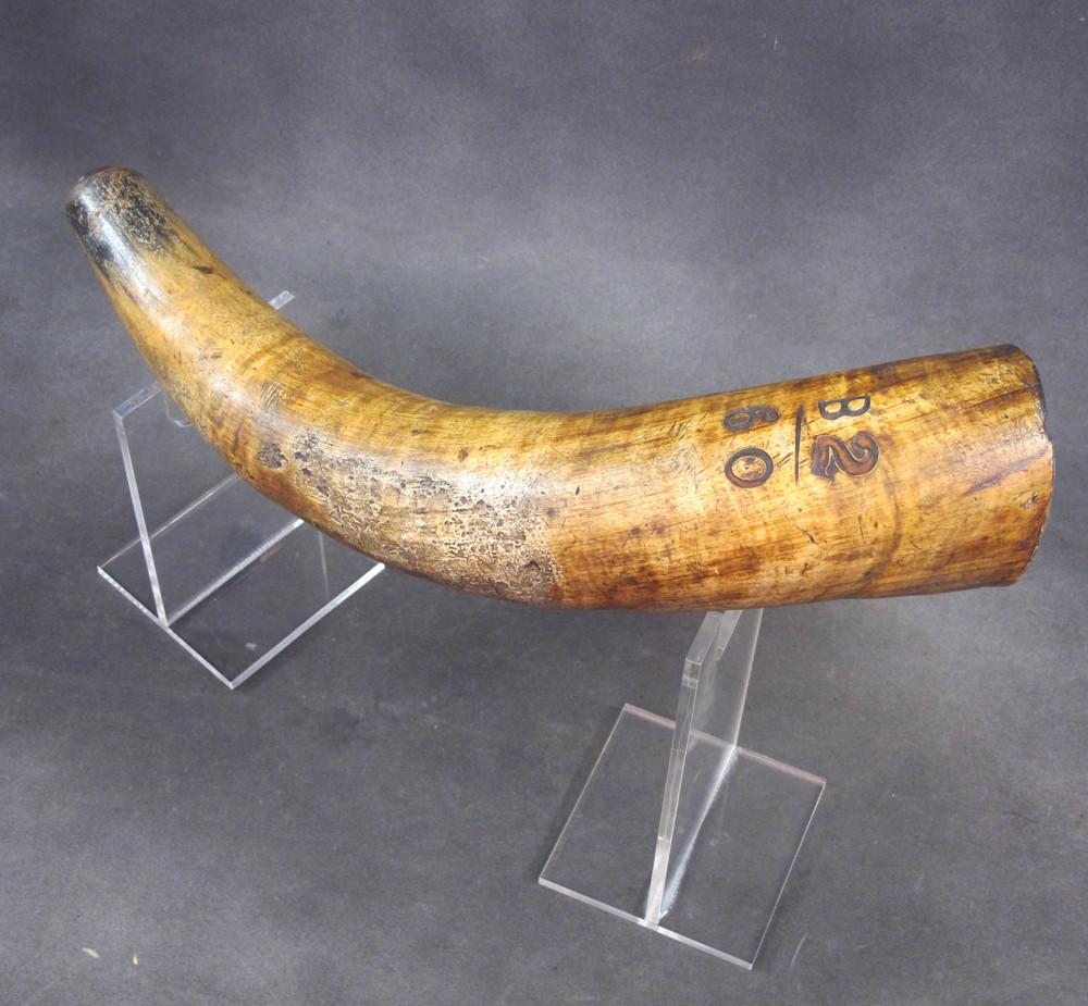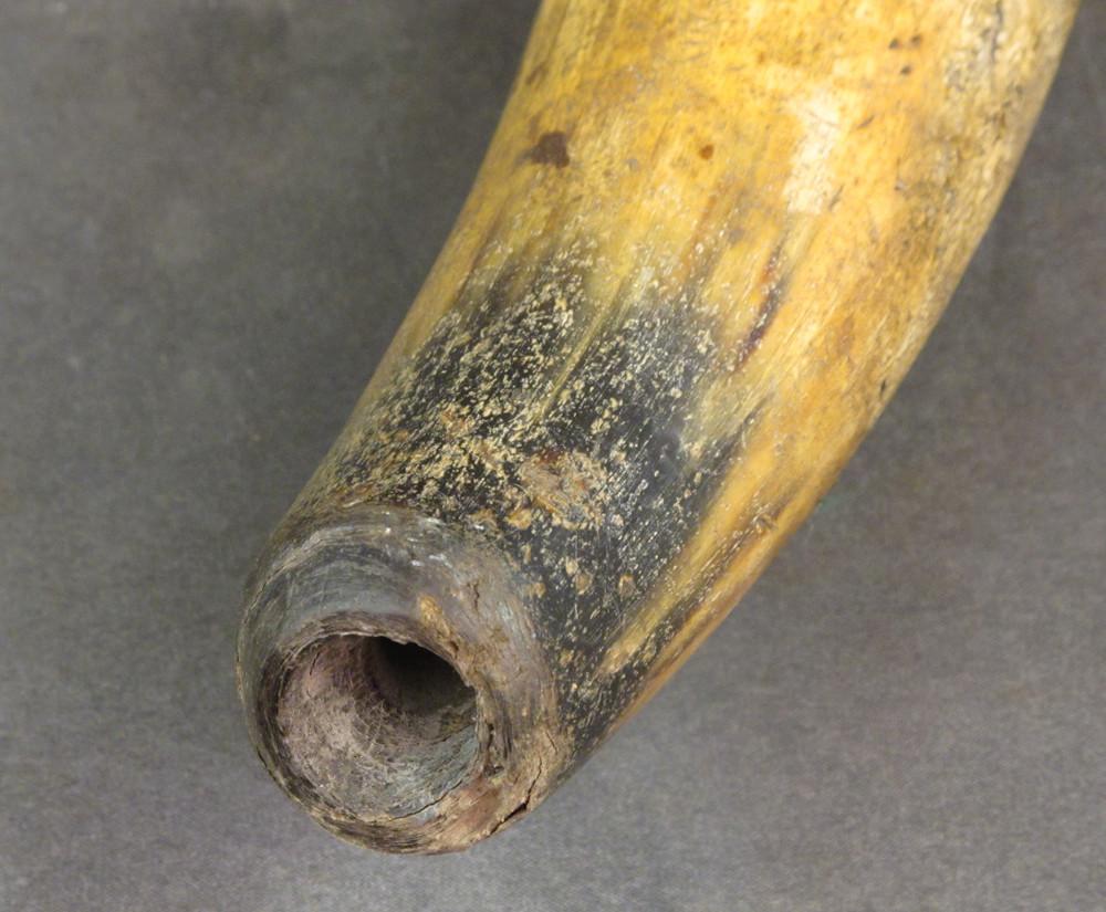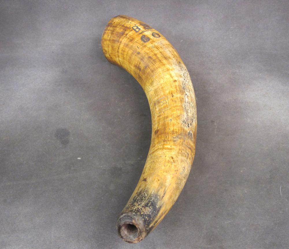 Original Item: Only One Available. This is a massive cow horn powder flask that measures over 18 inches in length. Designed for use with cannon in the late 18th century.