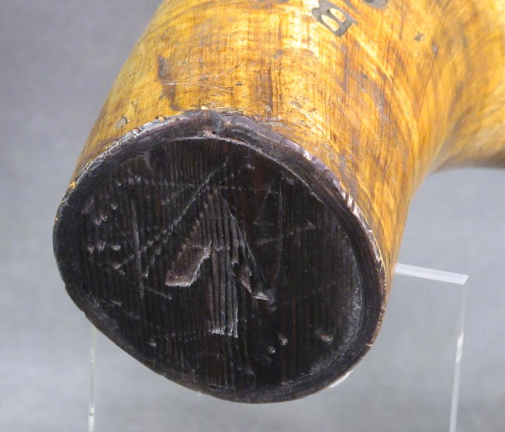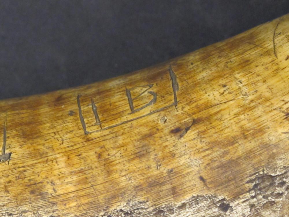 Bears branded markings in the horn of "B2/60", perhaps 2nd Battery, 60th Regimen? The wood base plug has a large Broad Arrow stamp indicating British military use. A truly massive gunner's horn and well marked indicating historical use.