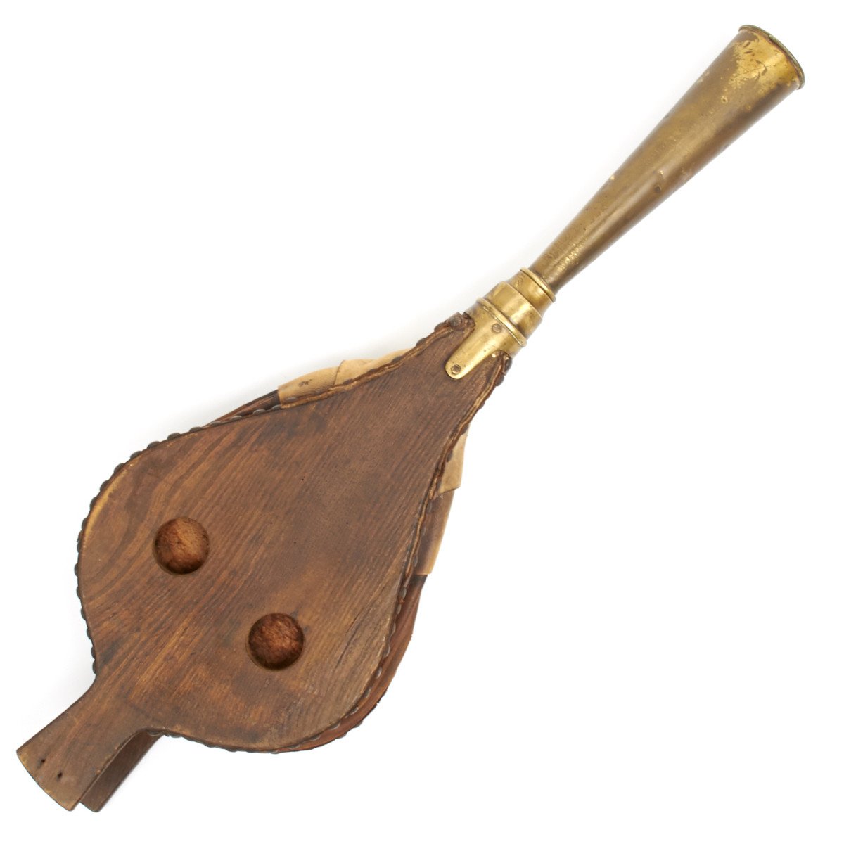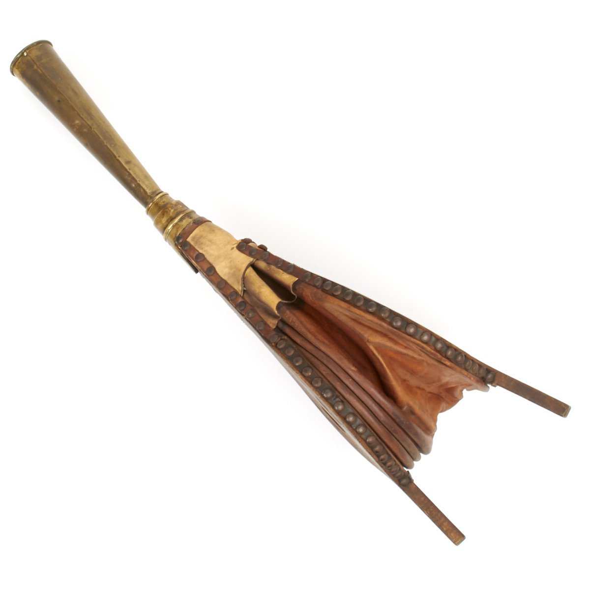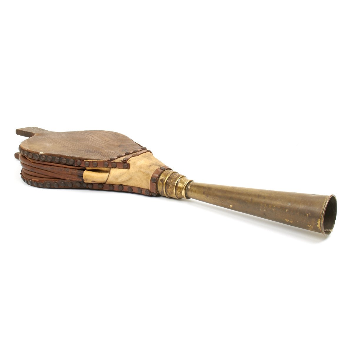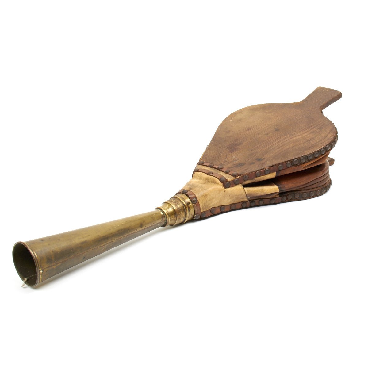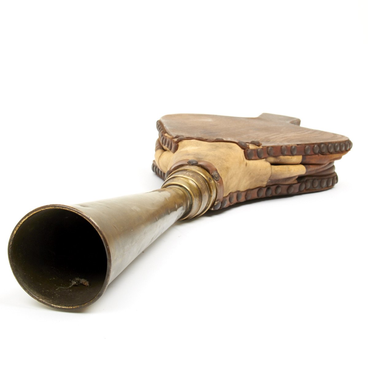 This amazing foghorn measures 33" in length and has a brass blunderbuss style "trumpet" is 11 inches. Like most bellows, the body is of wood with a leather air bag. It is still in excellent working condition but clearly shows it age.
