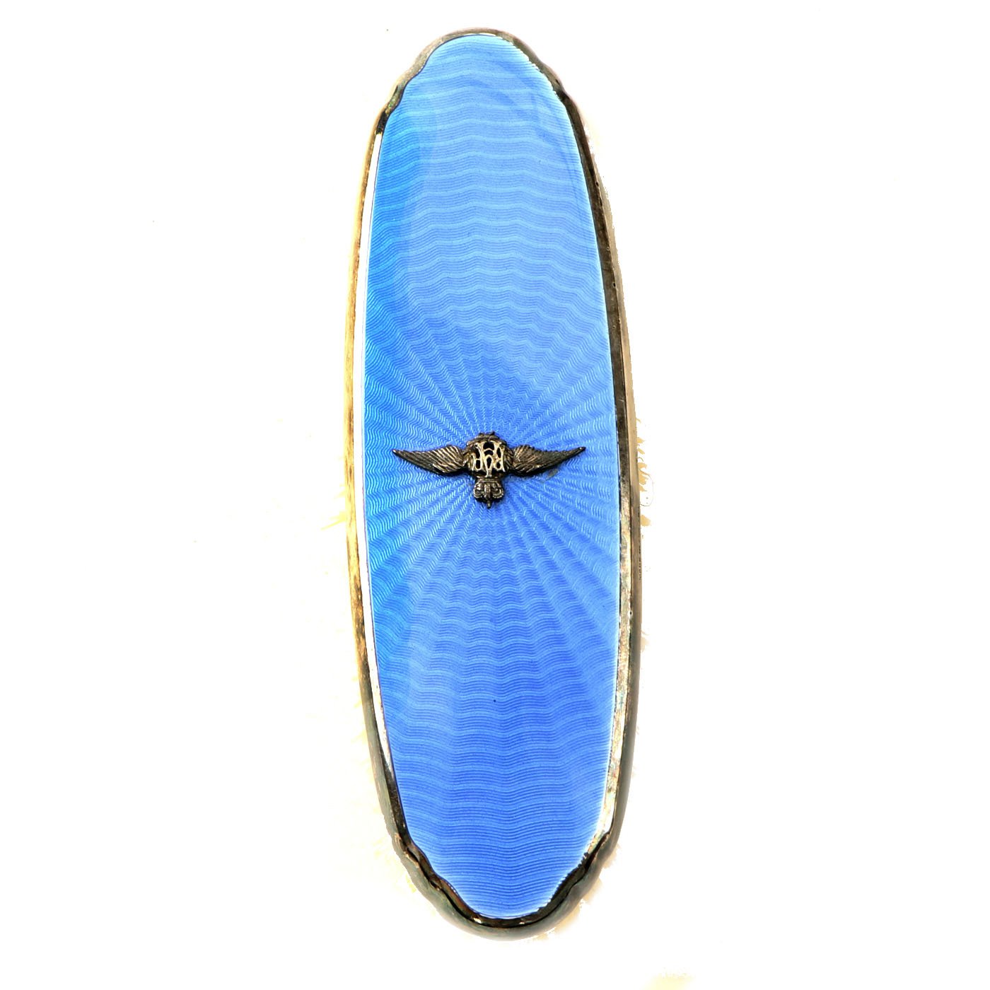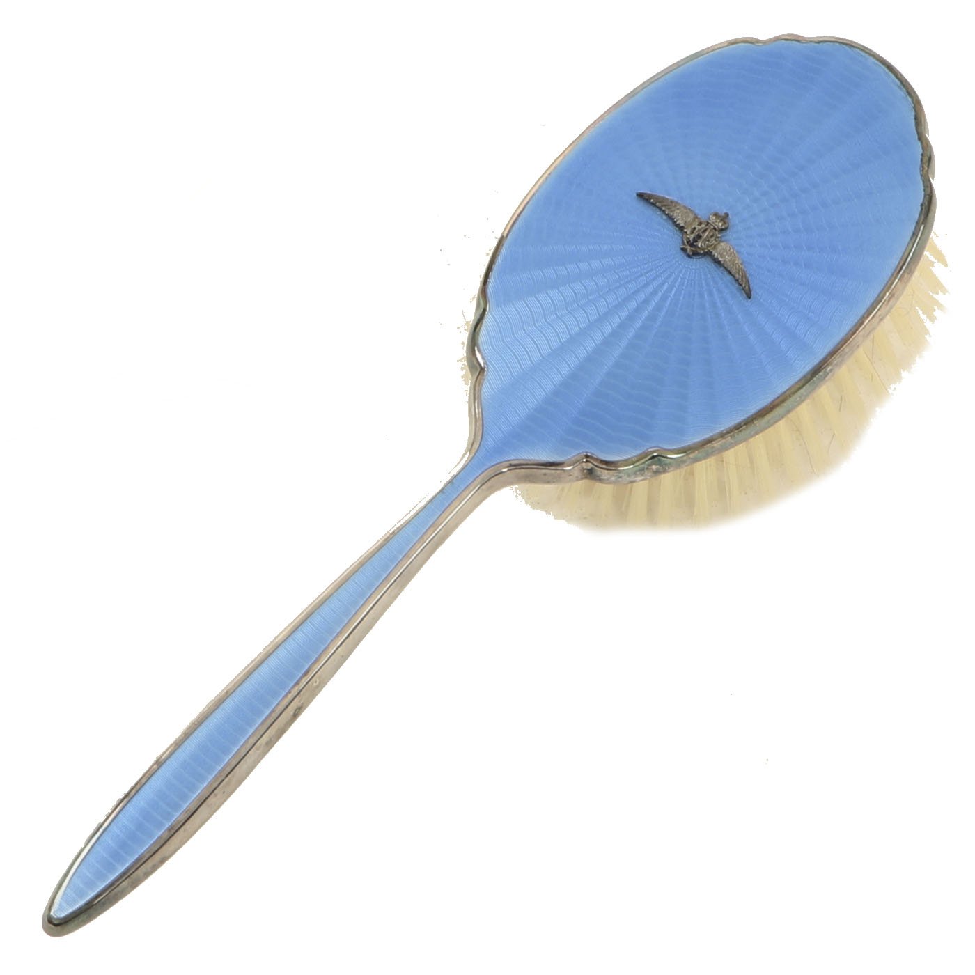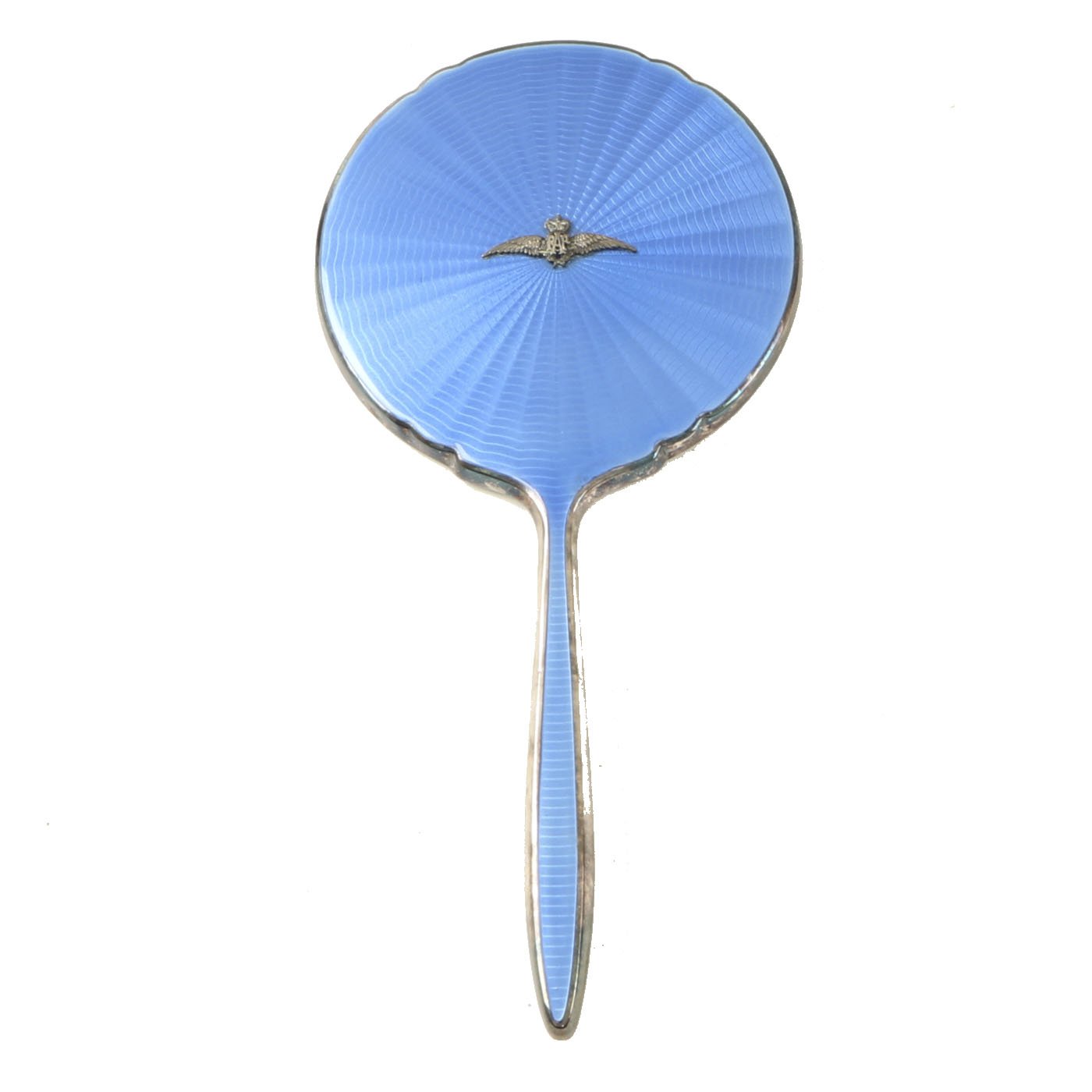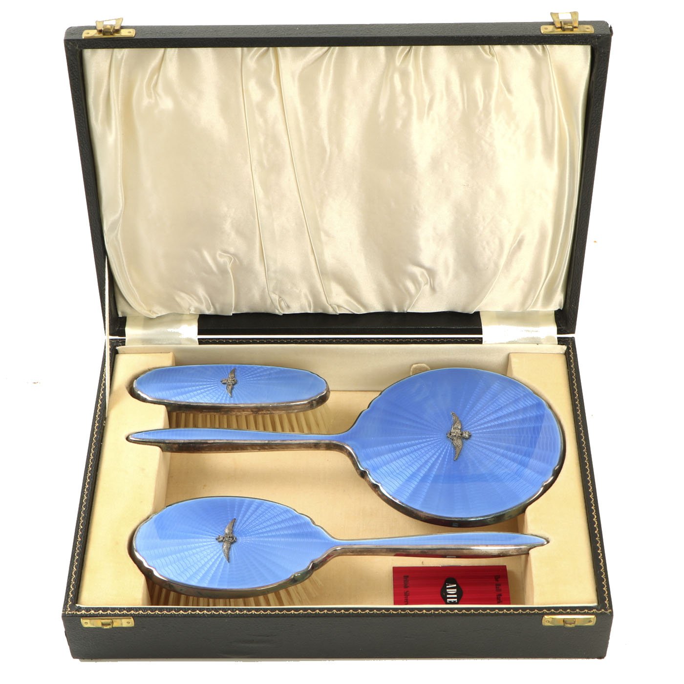 - Original Items: Only One Set Available. A fabulous silver and skyblue guilloche enamel RAF women's vanity set by Adie Brothers Ltd, of Birmingham dating just after World War Two. Each piece of this delightful three part set has a face of subtle skyblue guilloche enameled with overlaid silver Queen's Crown RAF insignia to the center. The two hairbrushes and mirror are each fully hallmarked along with the Adie maker mark. These pretty pieces were given to wives and girlfriends by RAF servicemen as a way of remembering them, and are known as "sweetheart" gifts. All pieces are offered in excellent condition, the only possible upgrade would to polish the silver. All of this is contained in a customer leather bound box with interior cream colored felt lining and custom cutouts for each piece. The box measures 12.5" x 9" x 2.5". Also included is the original Aide Bros small pamphlet which describes the hallmarks ("A" for 1950) and guarantee. A high quality beautiful set from just after the World War Two period.