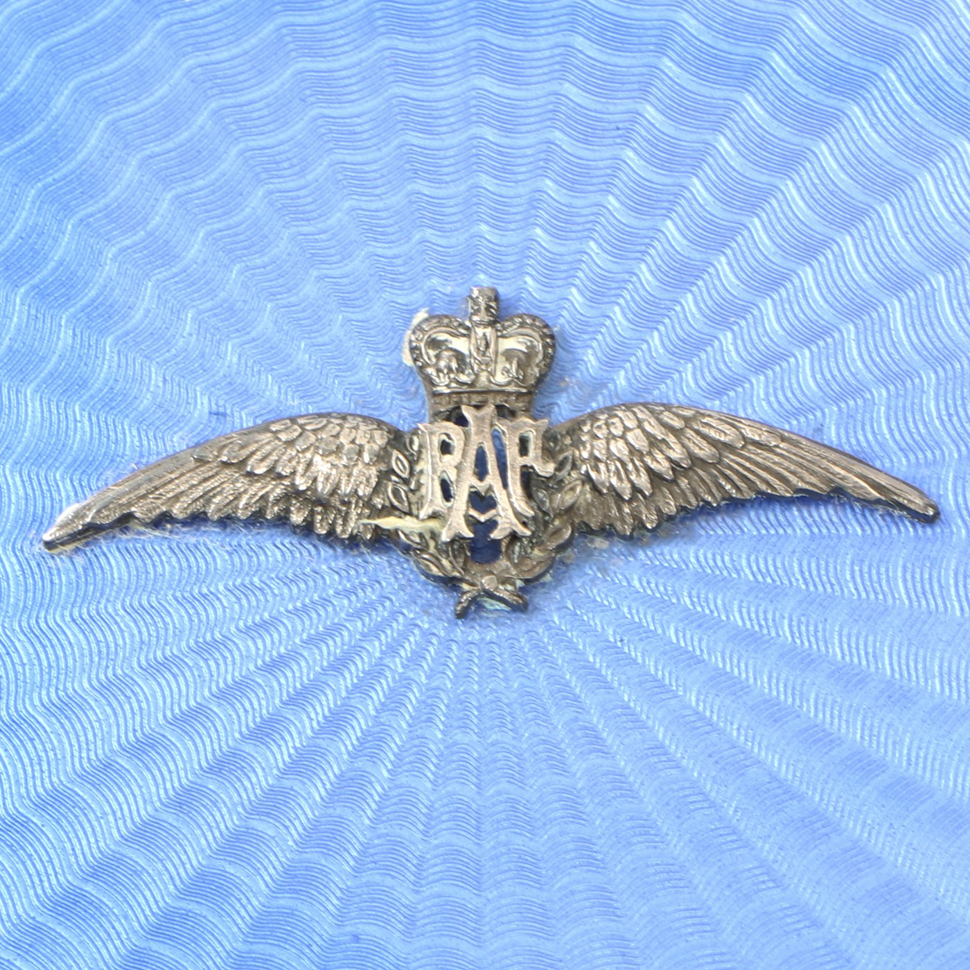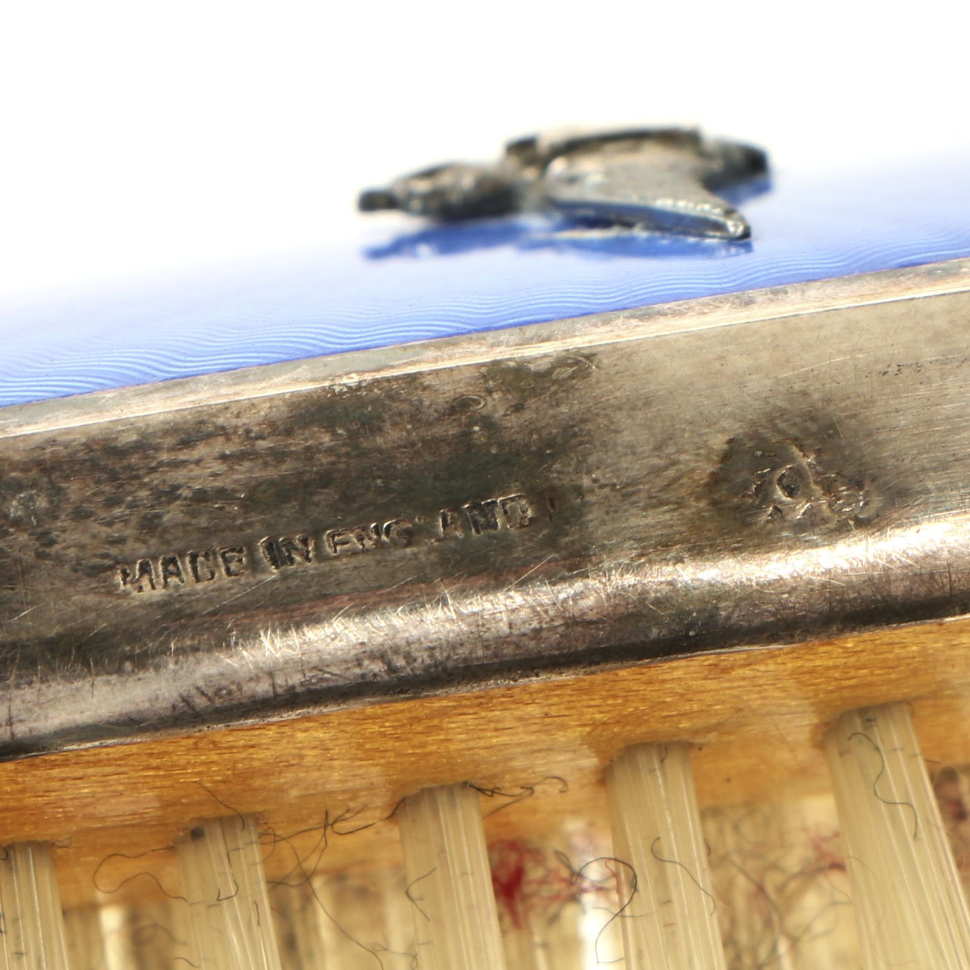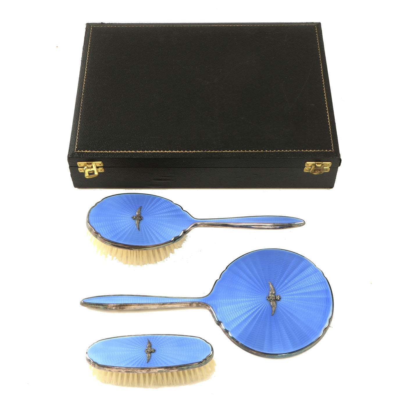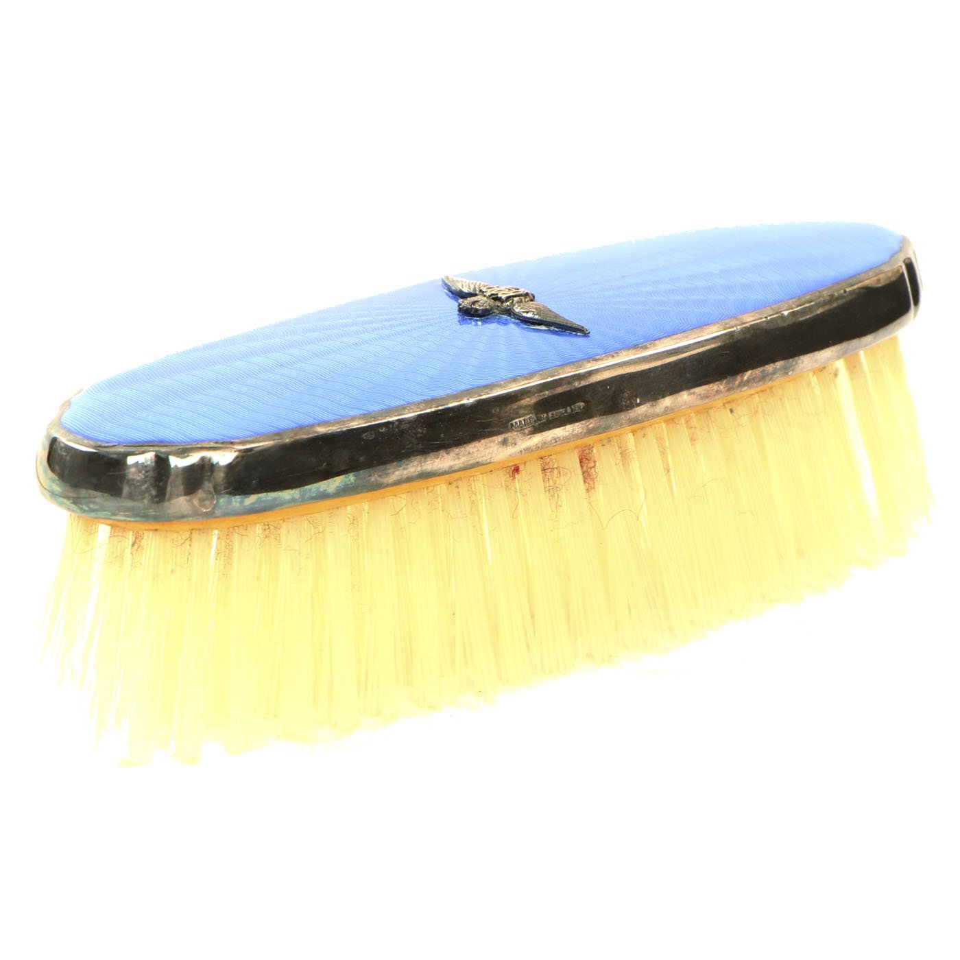 - Original Items: Only One Set Available. A fabulous silver and skyblue guilloche enamel RAF women's vanity set by Adie Brothers Ltd, of Birmingham dating just after World War Two. Each piece of this delightful three part set has a face of subtle skyblue guilloche enameled with overlaid silver Queen's Crown RAF insignia to the center. The two hairbrushes and mirror are each fully hallmarked along with the Adie maker mark. These pretty pieces were given to wives and girlfriends by RAF servicemen as a way of remembering them, and are known as "sweetheart" gifts. All pieces are offered in excellent condition, the only possible upgrade would to polish the silver. All of this is contained in a customer leather bound box with interior cream colored felt lining and custom cutouts for each piece. The box measures 12.5" x 9" x 2.5". Also included is the original Aide Bros small pamphlet which describes the hallmarks ("A" for 1950) and guarantee. A high quality beautiful set from just after the World War Two period.