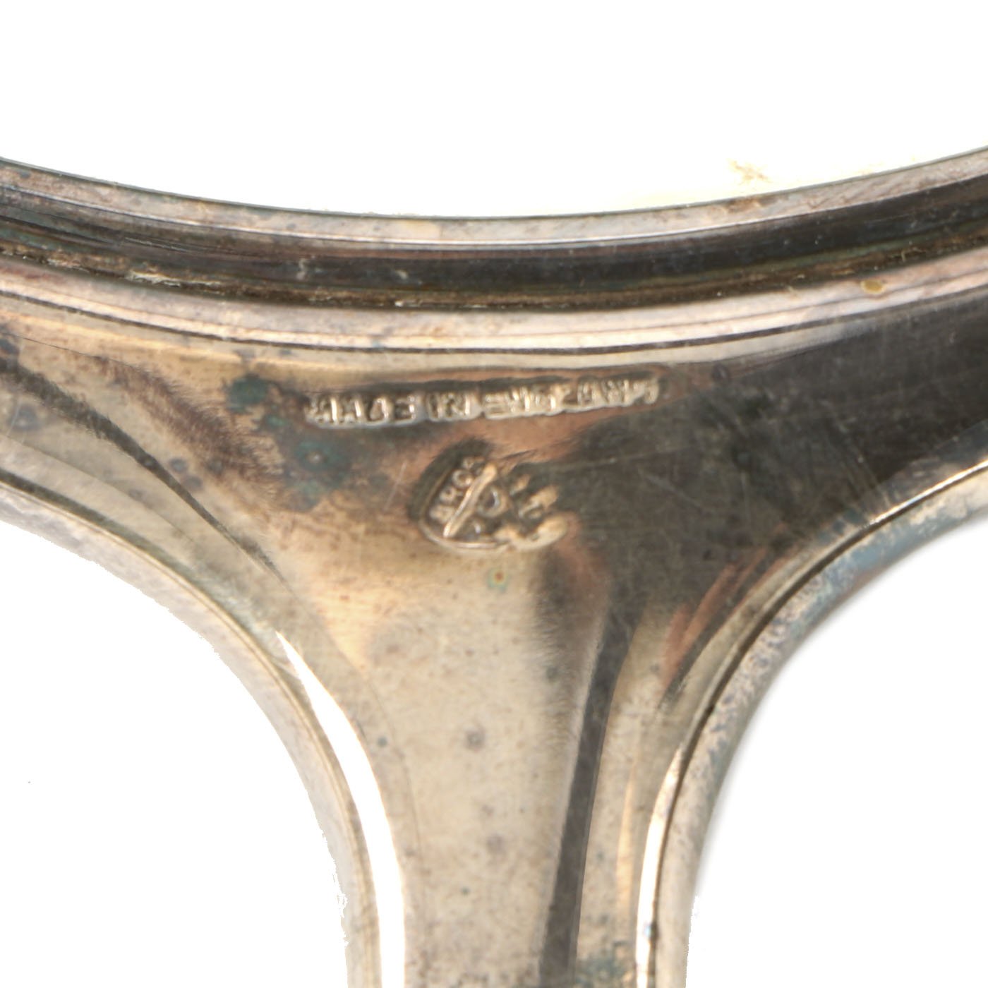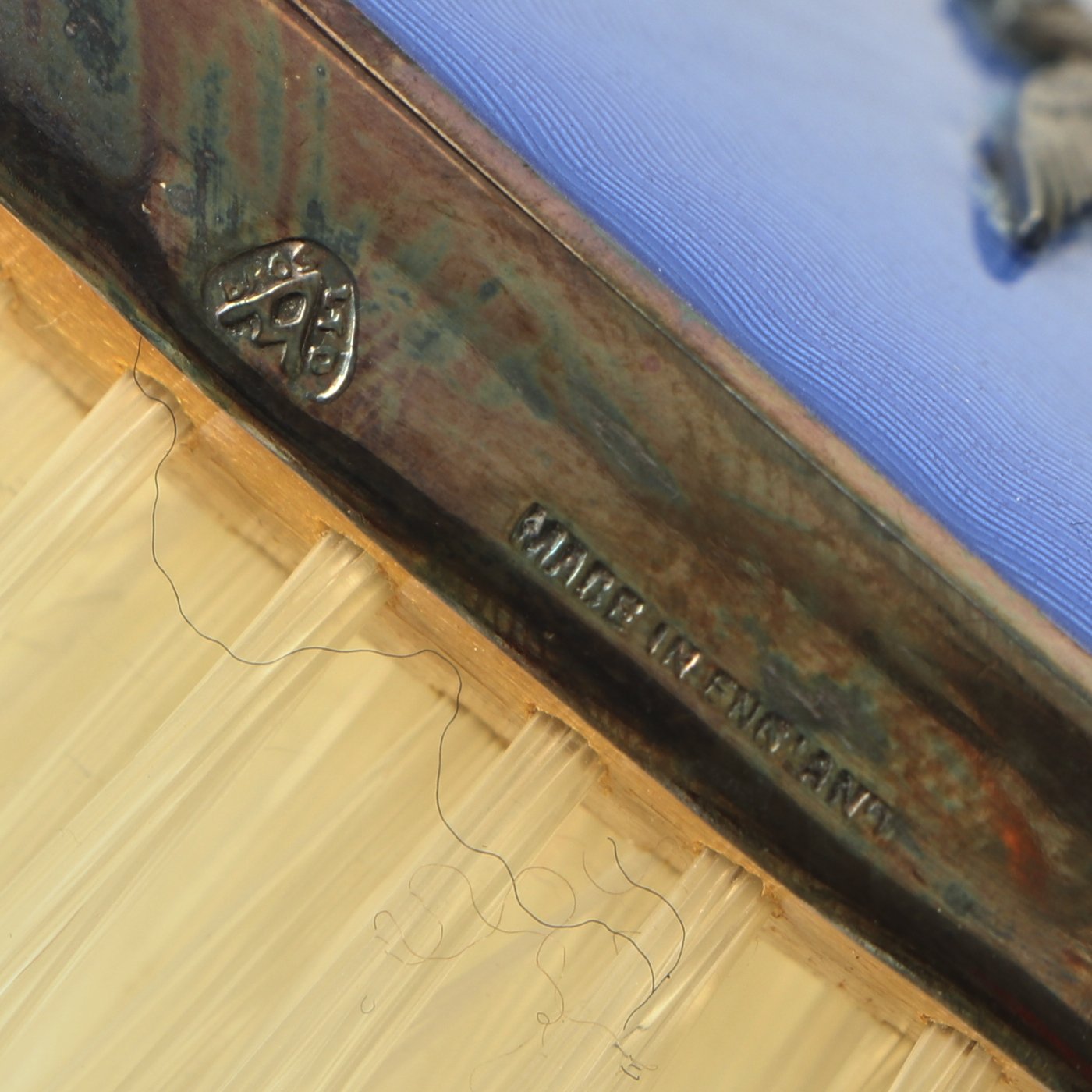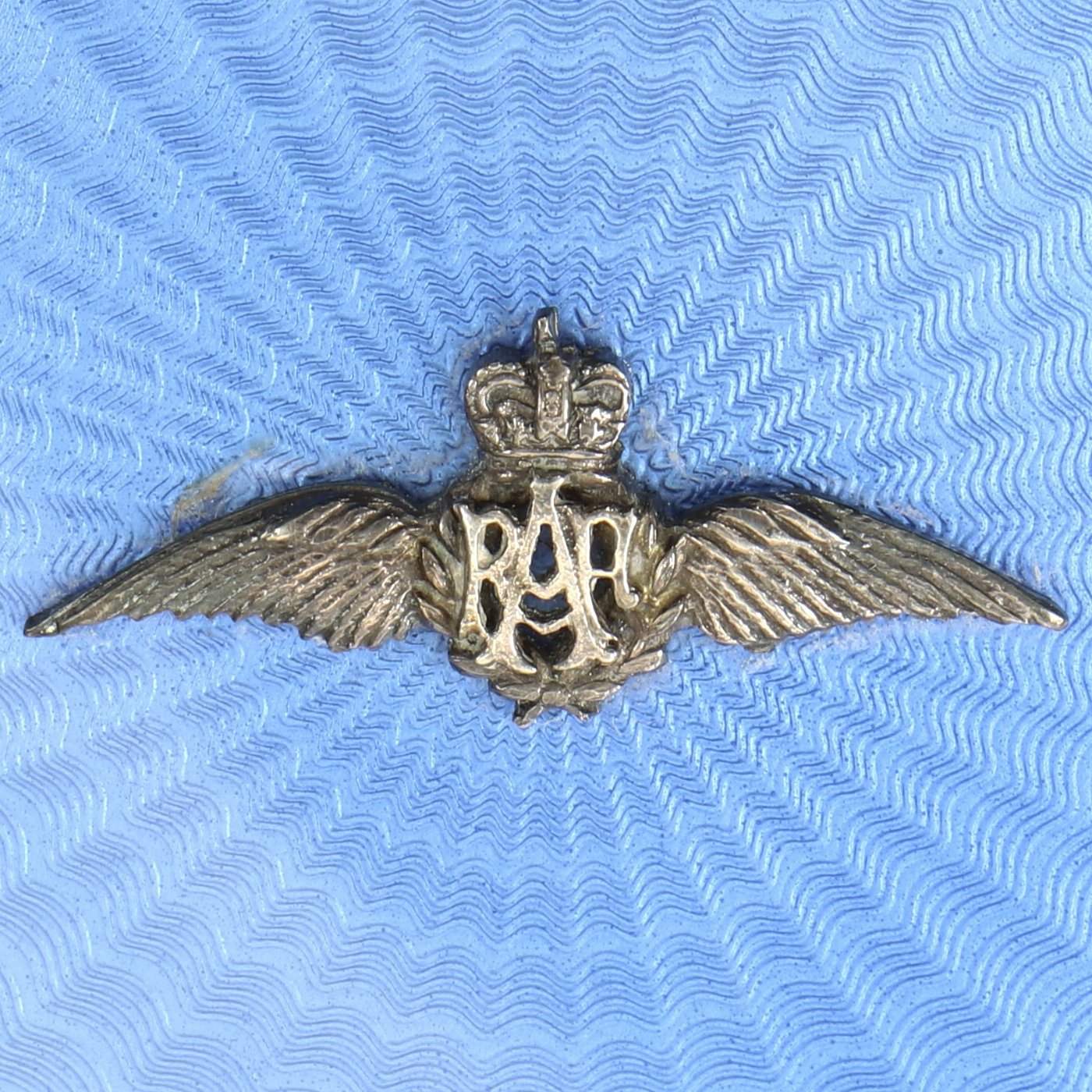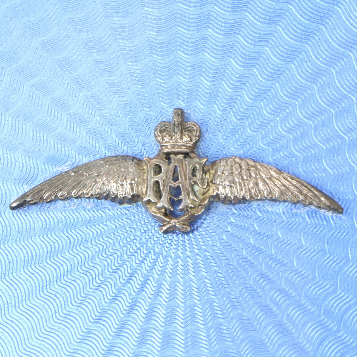 - Original Items: Only One Set Available. A fabulous silver and skyblue guilloche enamel RAF women's vanity set by Adie Brothers Ltd, of Birmingham dating just after World War Two. Each piece of this delightful three part set has a face of subtle skyblue guilloche enameled with overlaid silver Queen's Crown RAF insignia to the center. The two hairbrushes and mirror are each fully hallmarked along with the Adie maker mark. These pretty pieces were given to wives and girlfriends by RAF servicemen as a way of remembering them, and are known as "sweetheart" gifts. All pieces are offered in excellent condition, the only possible upgrade would to polish the silver. All of this is contained in a customer leather bound box with interior cream colored felt lining and custom cutouts for each piece. The box measures 12.5" x 9" x 2.5". Also included is the original Aide Bros small pamphlet which describes the hallmarks ("A" for 1950) and guarantee. A high quality beautiful set from just after the World War Two period.