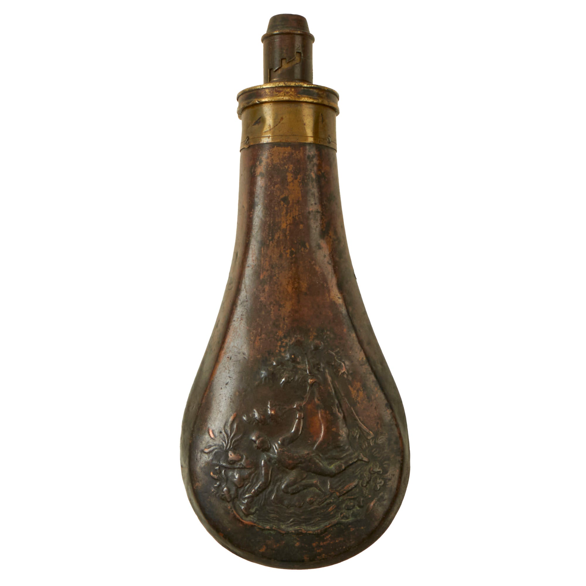 Original Item. Only One Available. This is a gorgeous Civil War Era powder flask featuring a decorative pattern on the exterior. The flask was made by James Barlow & Co. of Birmingham, one of the British manufacturers of the Industrial Revolution. James Barlow & Co was a scissors partnership, which included James Barlow, Henry Longden, and Sarah Barlow. In 1786, the latter withdrew. In 1787, the Sheffield directory listed James Barlow & Co, fine scissors maker, at Meadow Street, using the trade mark ‘BARLOW’.The flask measures approximately 8” long. The cap still screws on and off without issue, but the spring to hold the hole closed when not in use is very weak, so there isn’t much tension, but it still moves. The spout can no longer be adjusted to change the amount of powder. There were originally rings on the sides of the flask to hold a carrying strap, but the rings are now gone and there are holes at the sides. There is no powder remaining in the flask. This example dates to the American Civil War period. A very beautiful flask that will fit well into any Civil War or 19th Century firearm collection!