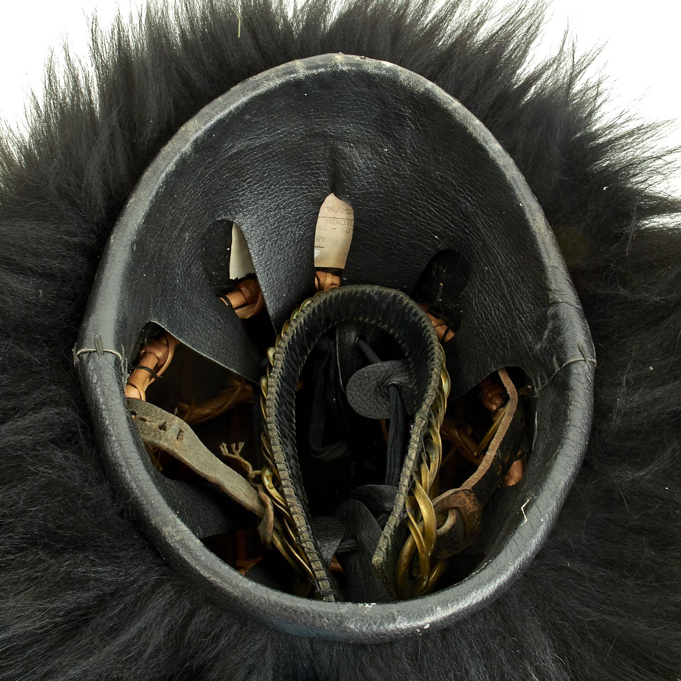 It most likely dates from the 1960s-1970s, and has the standard wicker basket inside supporting the bear skin. The helmet still retains it's original heavy brass chin scales, with both attachment hooks inside the helmet intact. The helmet still has the original manufacture label, which is marked with the military asset numbers and size: