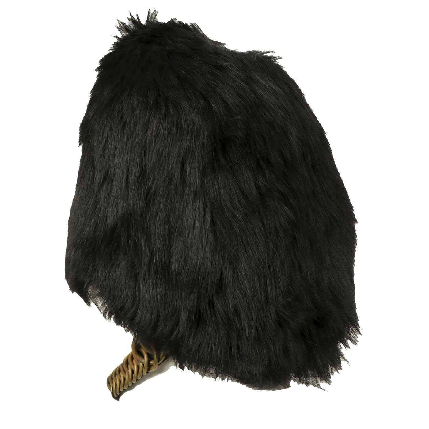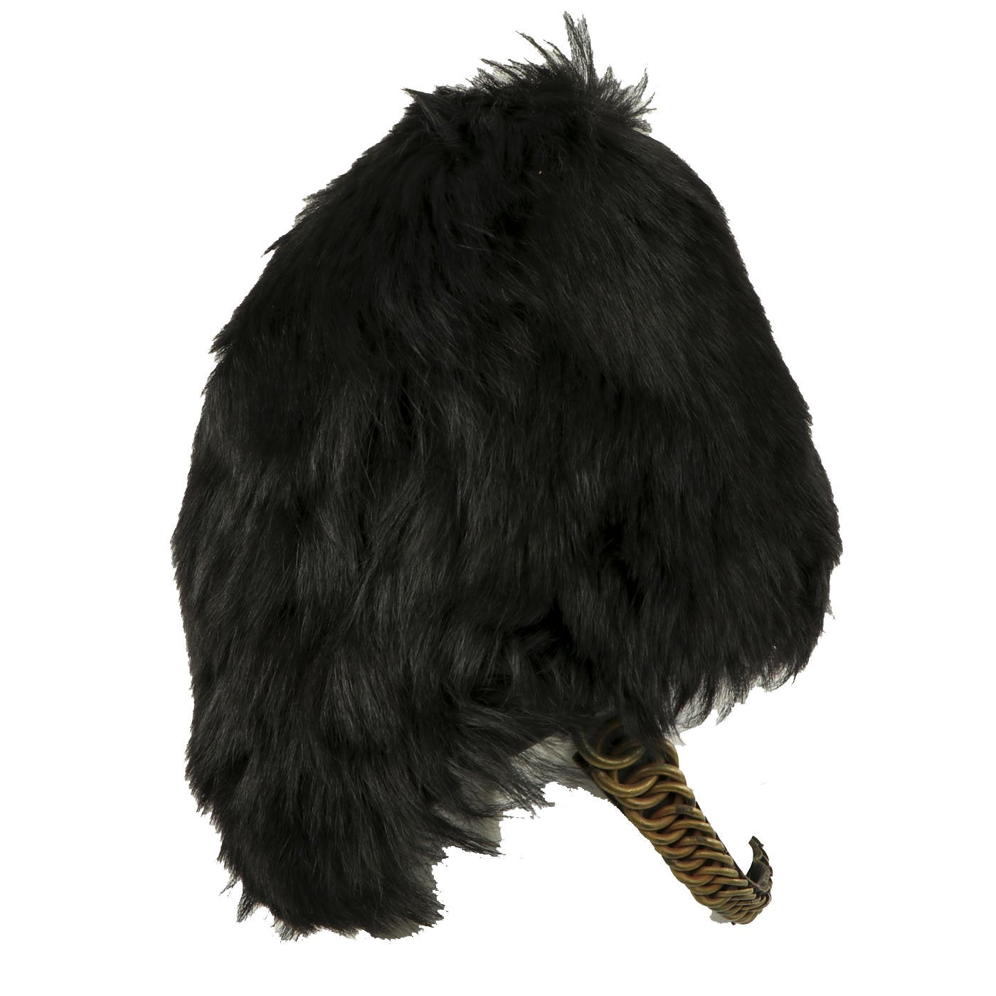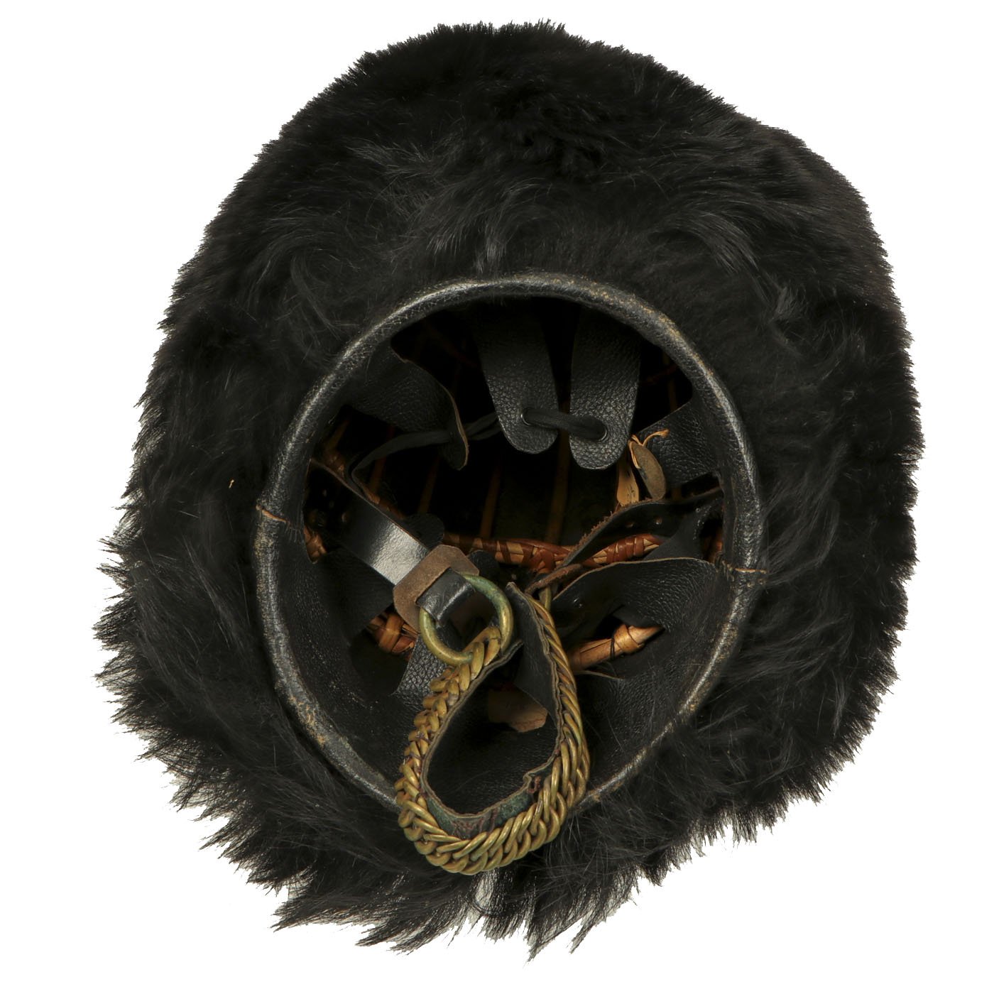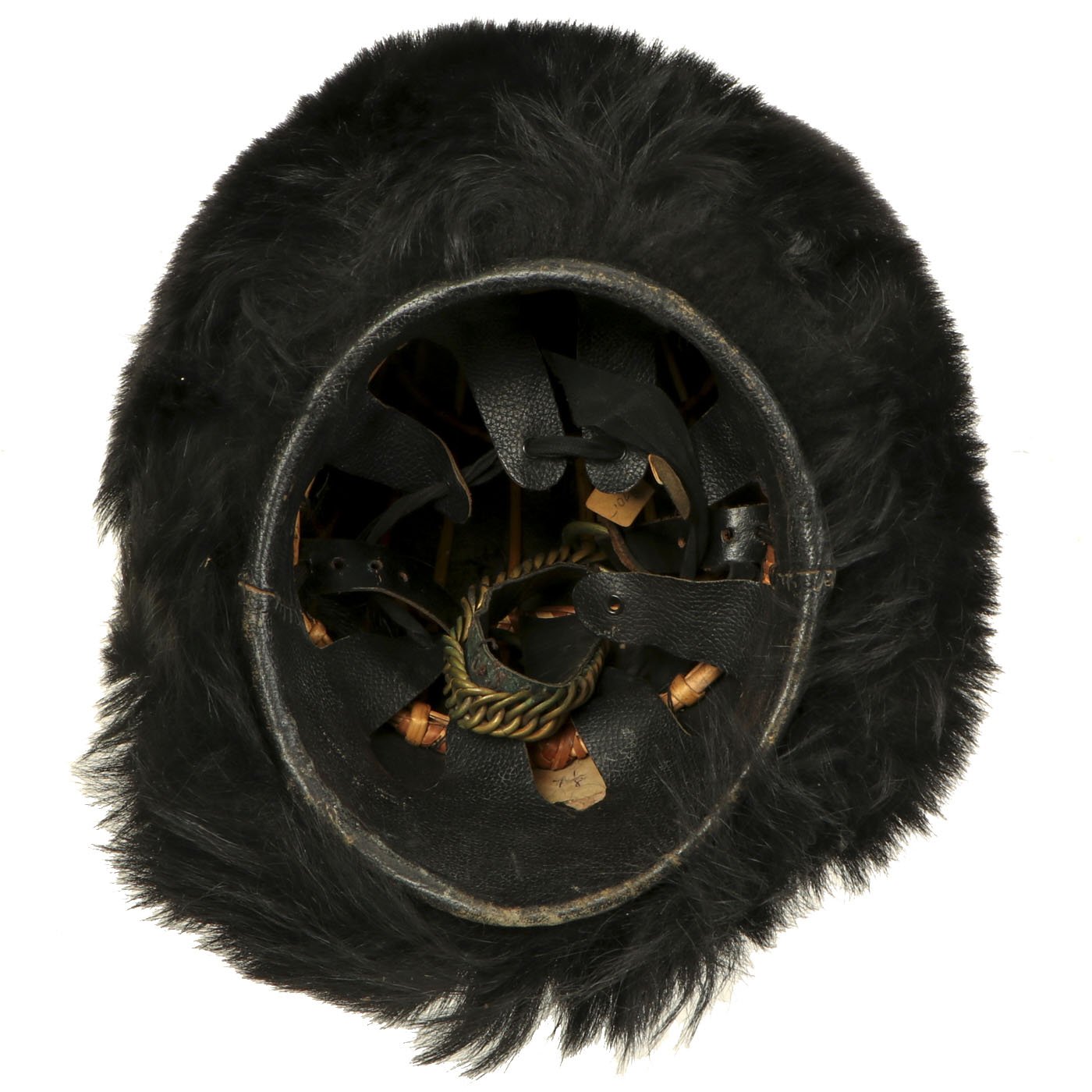 It most likely dates from the 1960s-1970s, and has the standard wicker basket inside supporting the bear skin. The helmet still retains it's original heavy brass chin scales, with both attachment hooks inside the helmet intact. The original helmet manufacture label degraded at some point, but it does have a handwritten label with size 7 1/8 written on it. Overall condition is very nice, with little wear or degradation.