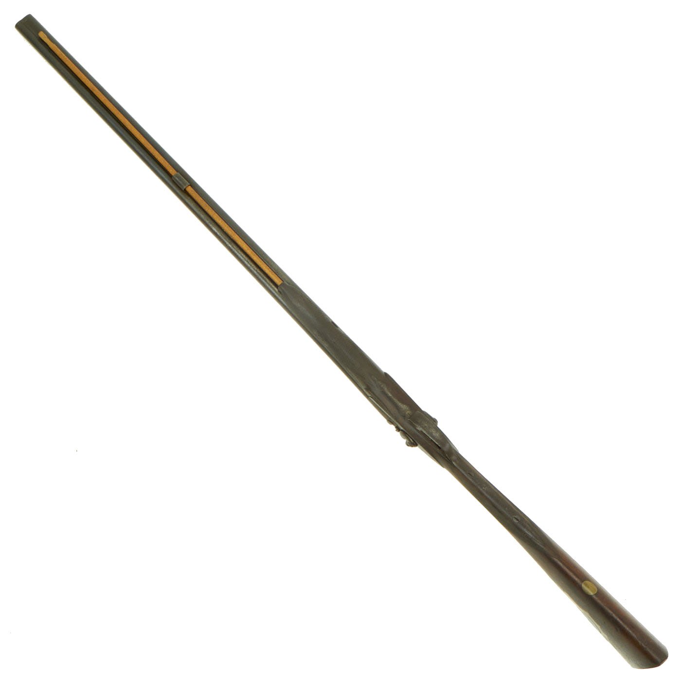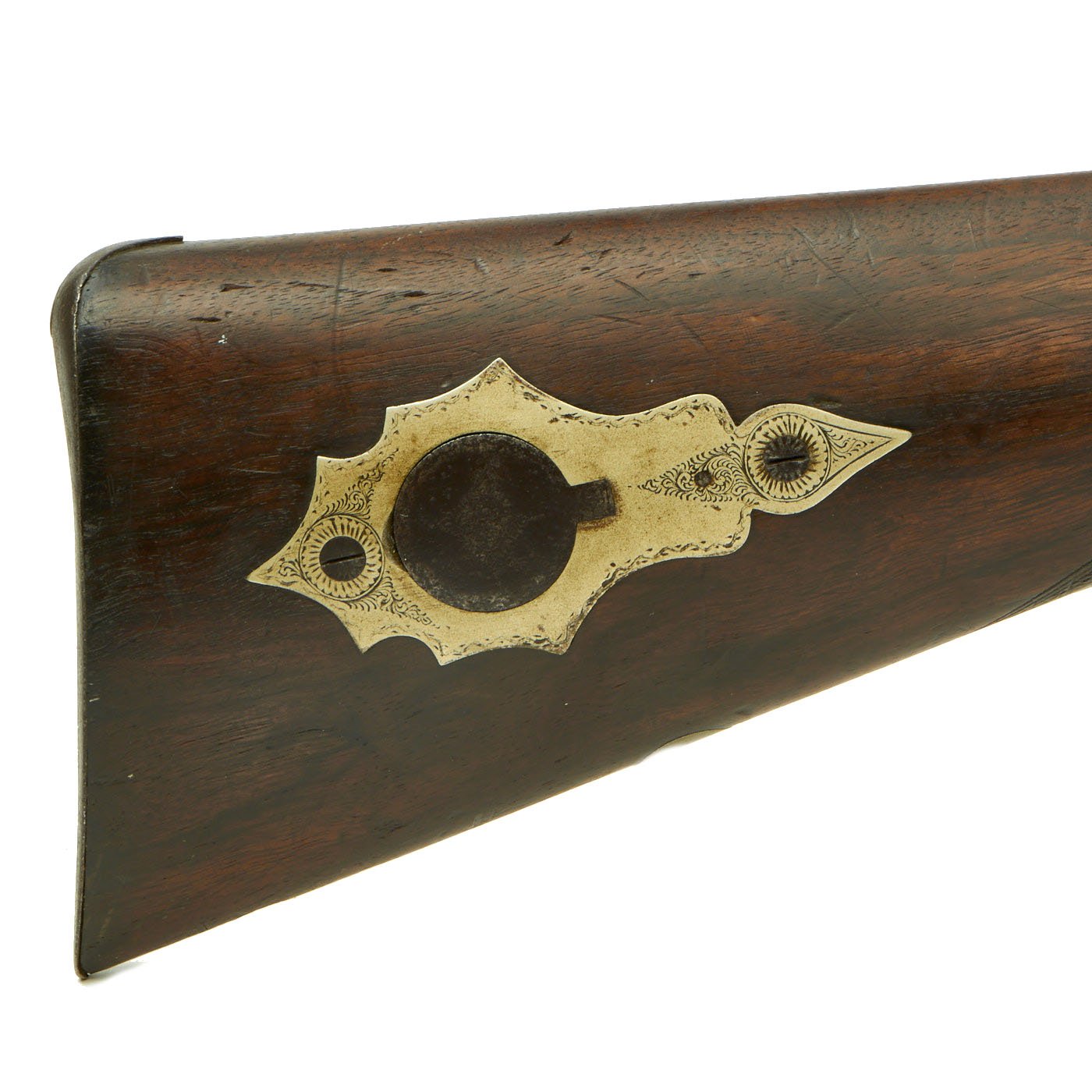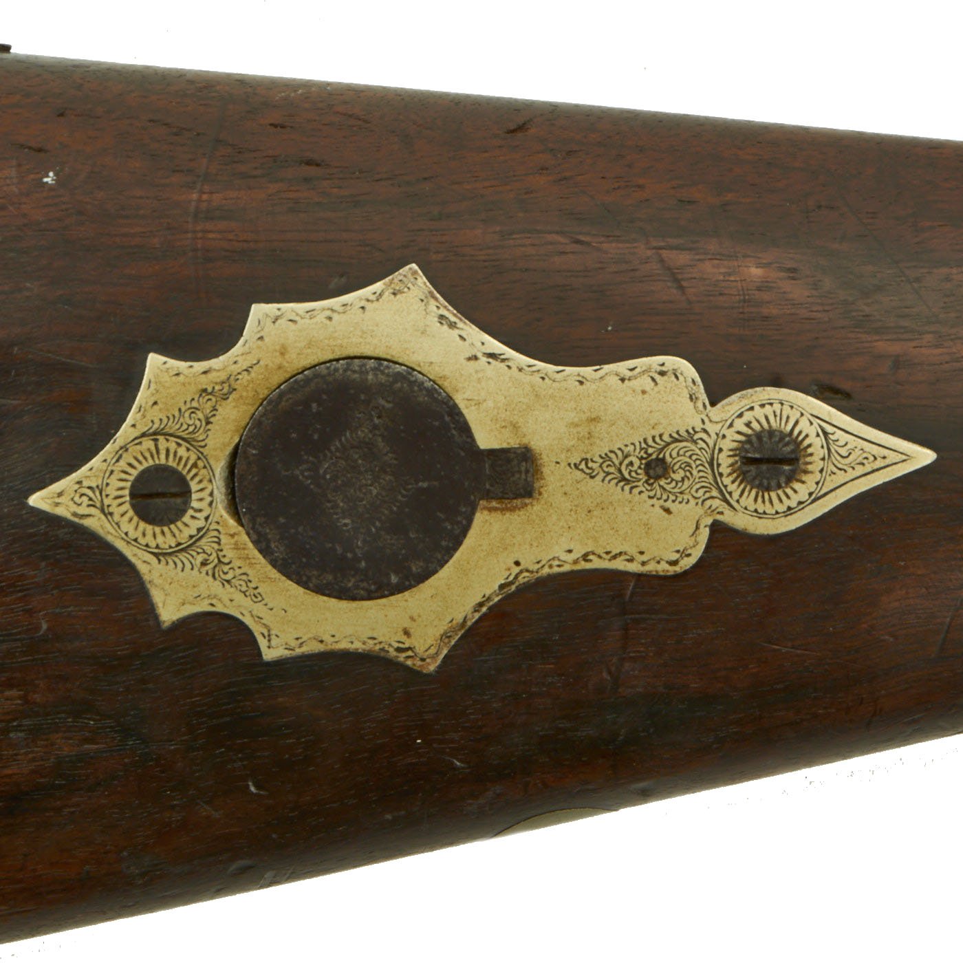 The locks both function correctly, holding at half cock and firing at full. Both cap nipples are present, but look to be working life replacements. The wood stock is in very good condition, with no major cracking or damage that we can see. There is some lovely checkering present on the wrist, which is still strong. The right side of the butt stock has a nickel silver cap or patch box, with an iron lid. The original ramrod is unfortunately missing, now replaced with a wooden dowel with a slot in one end.