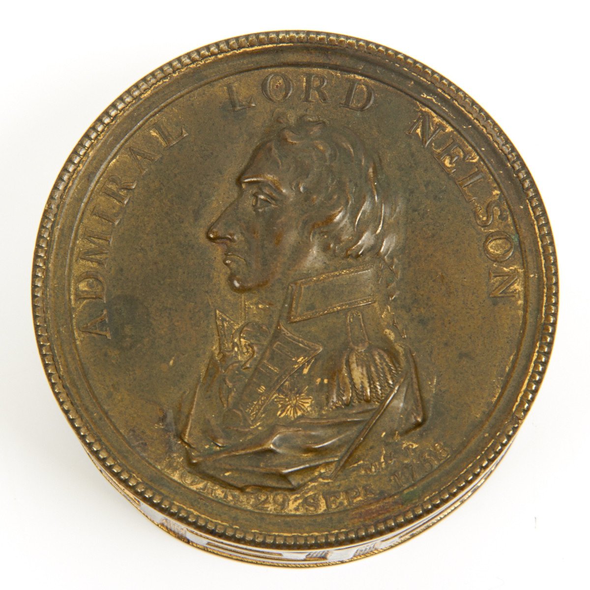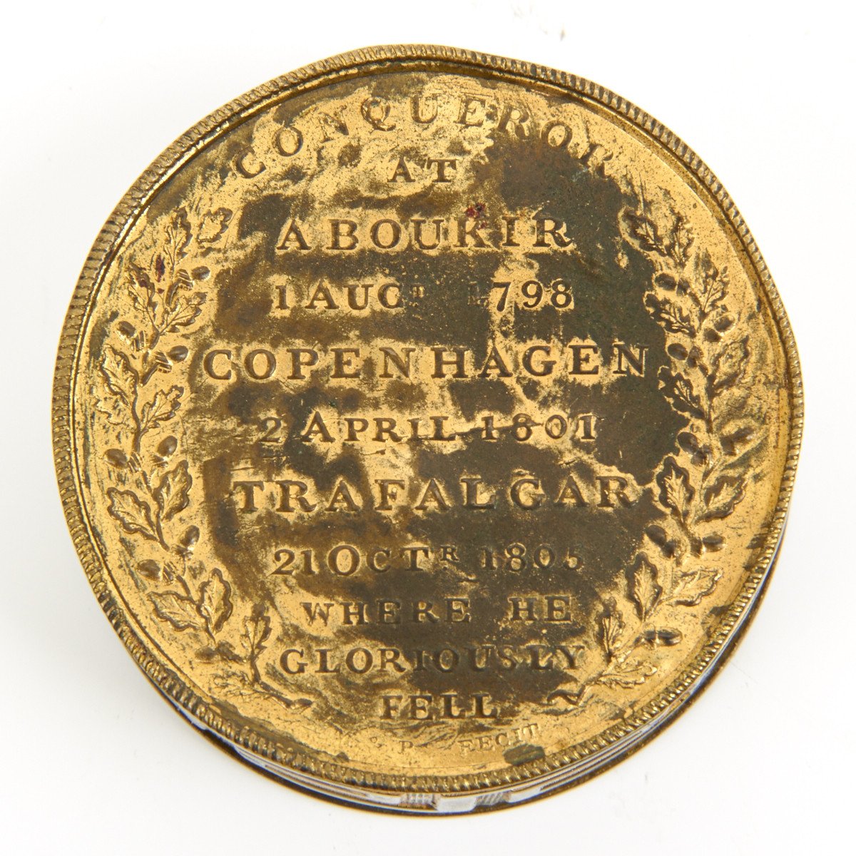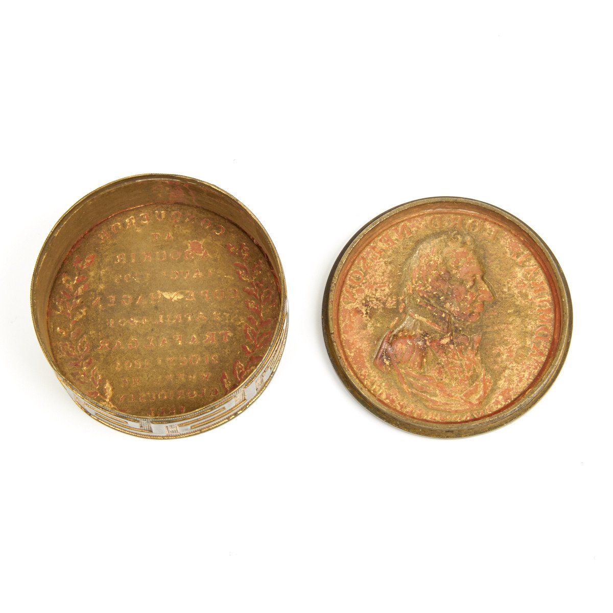 This is a very upmarket snuff box of gilt copper or brass fully embossed with the actions of Admiral Lord Nelson. The top has an embossed image in great detail and his date of birth September 29th 1758. The rear panel listing his three great Naval Victories as outlined above naming him as "Conqueror" and of Trafalgar "Where he Gloriously Fell".