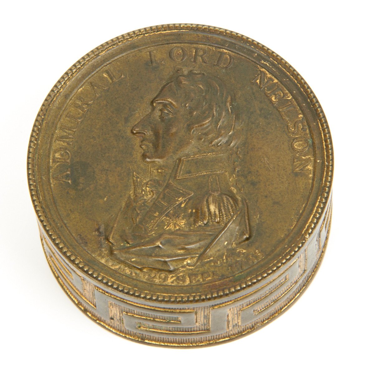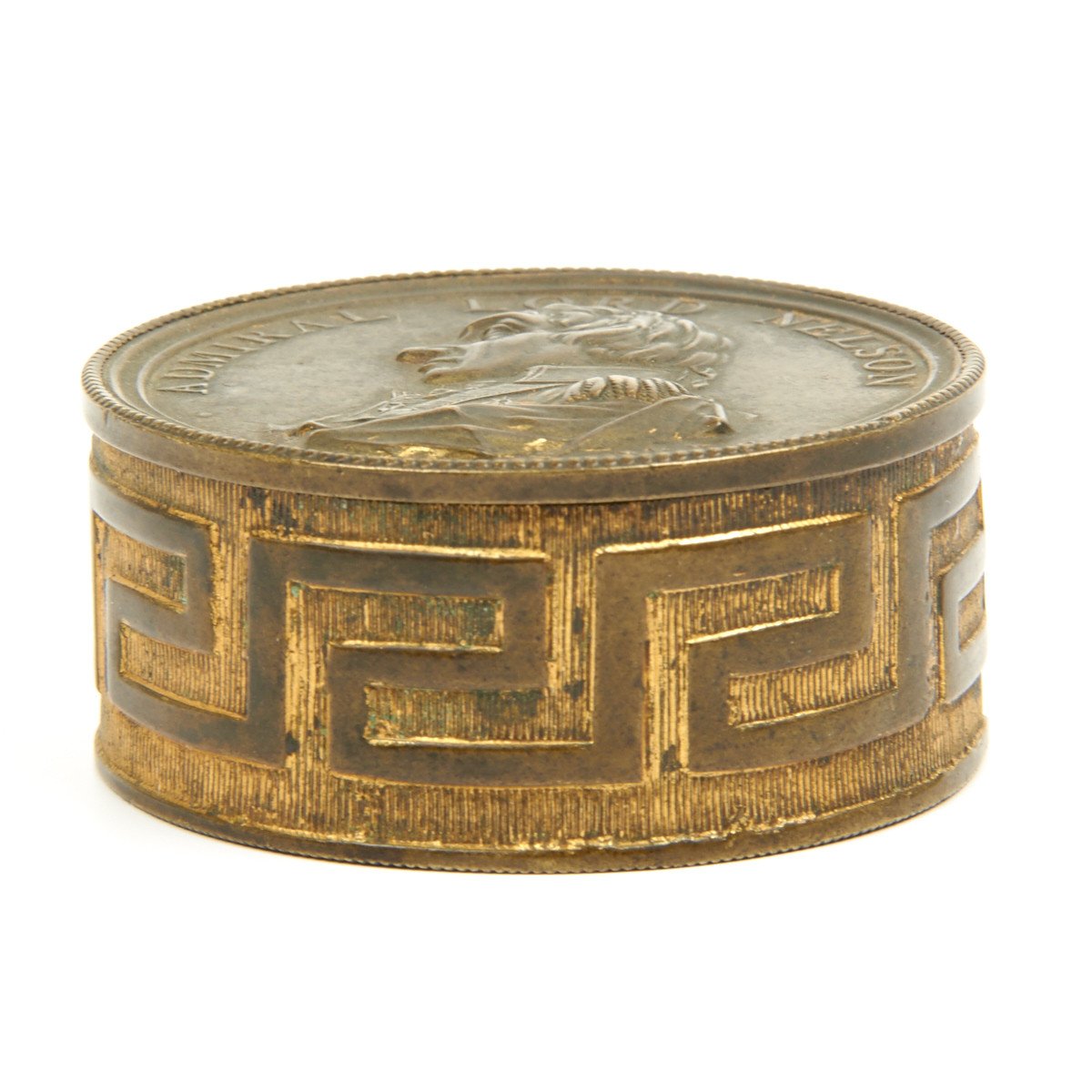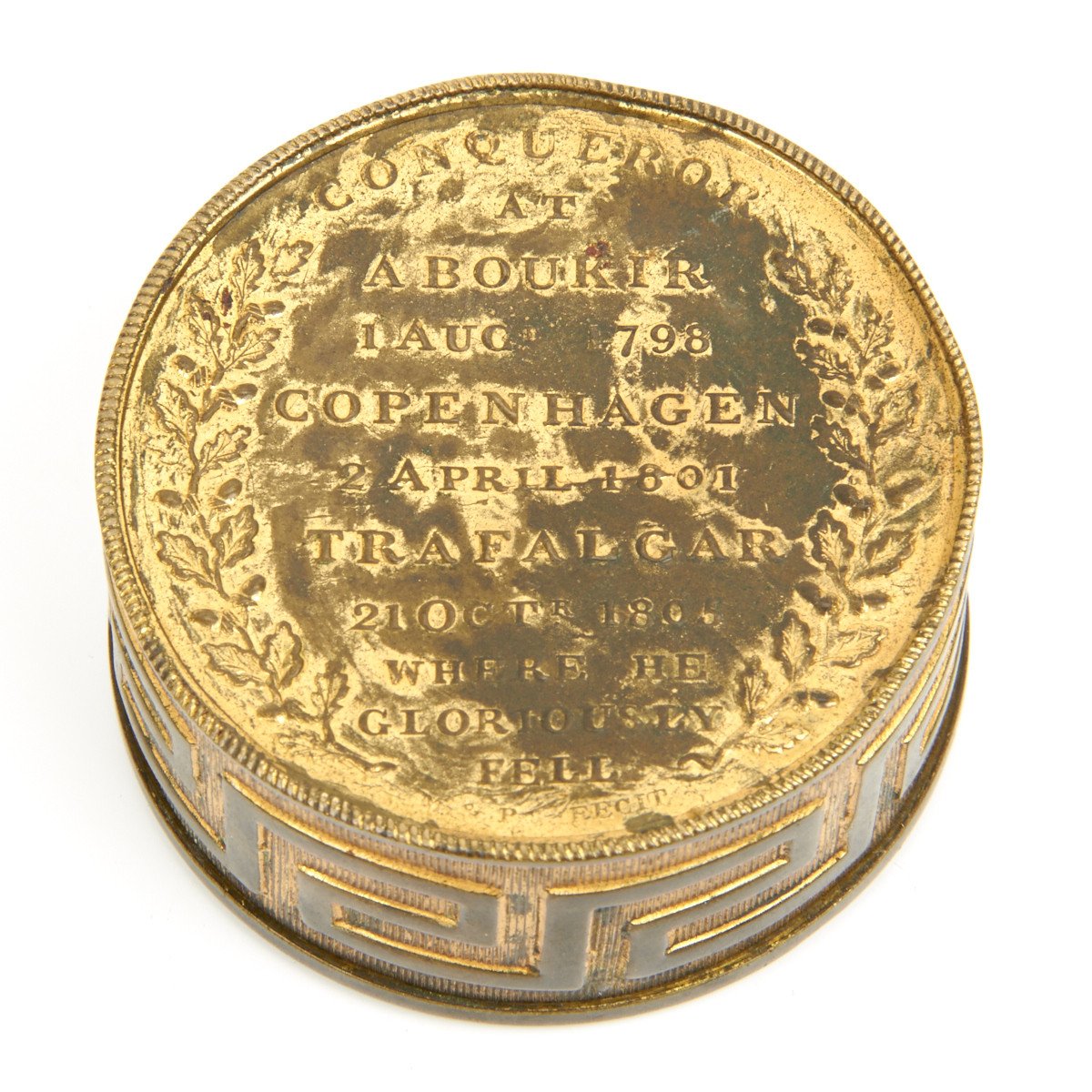 This is a very upmarket snuff box of gilt copper or brass fully embossed with the actions of Admiral Lord Nelson. The top has an embossed image in great detail and his date of birth September 29th 1758. The rear panel listing his three great Naval Victories as outlined above naming him as "Conqueror" and of Trafalgar "Where he Gloriously Fell".