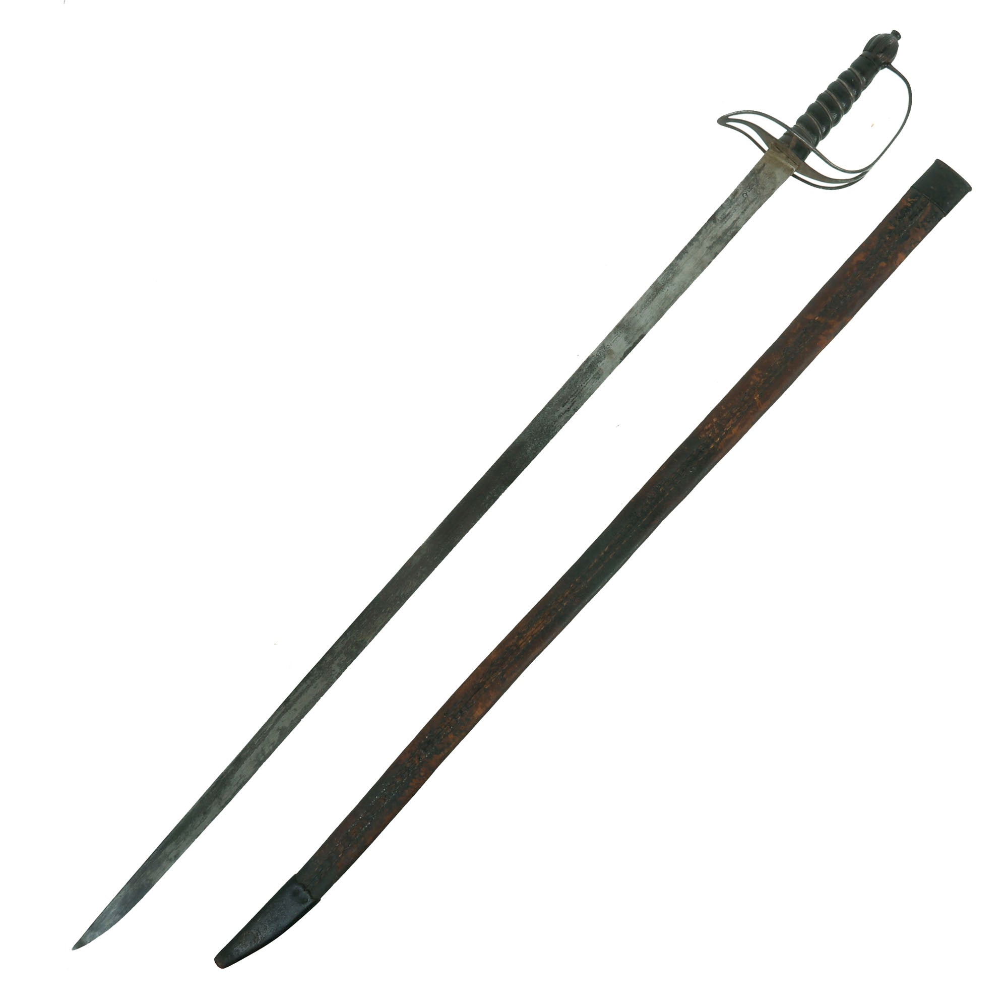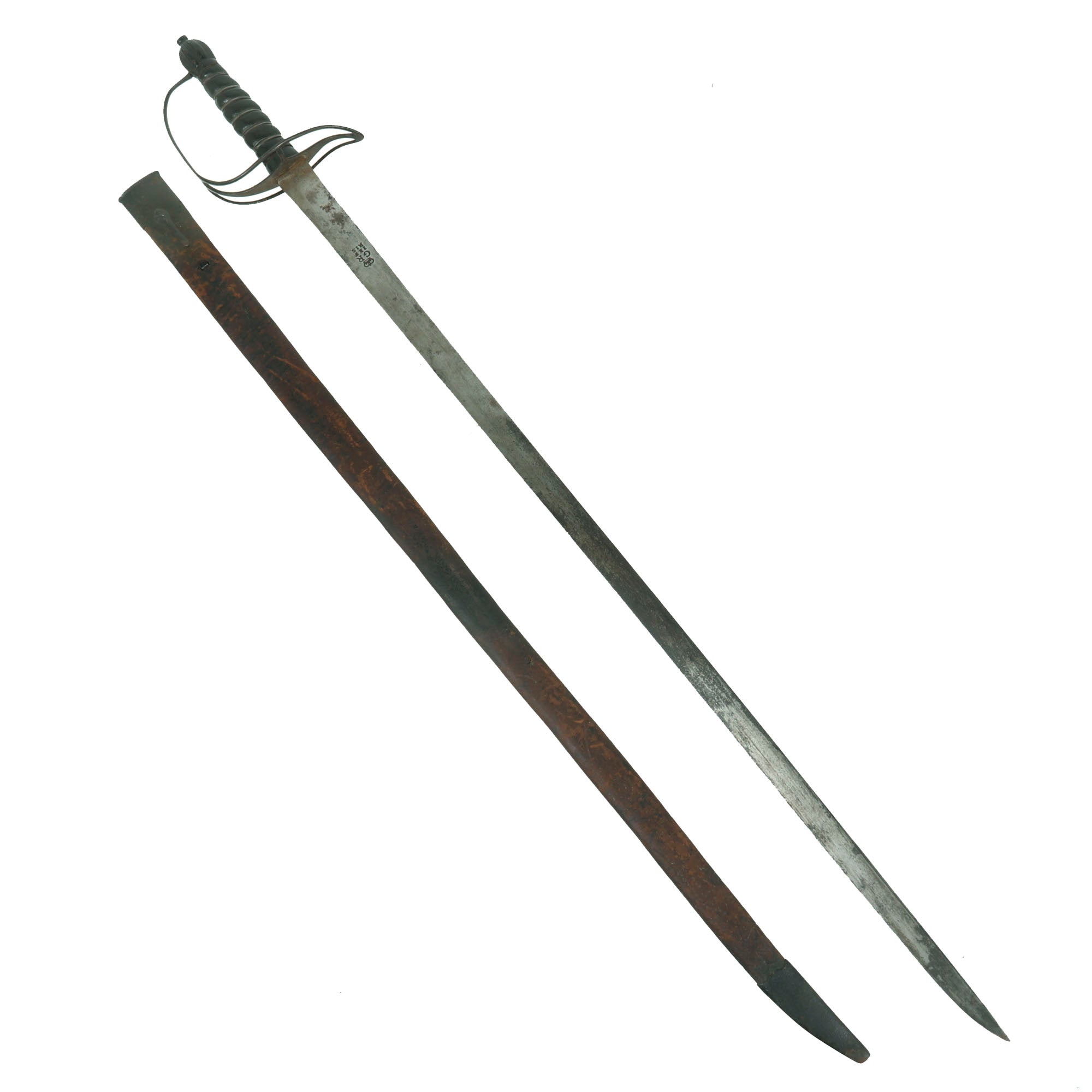 This is an extraordinary example of a Pattern 1759 Light Dragoon Saber, which was a noted improvement from the Pattern 1756, with a 36¾” straight blade rather than the previous curved 33”. However, these were not universal patterns, and were chosen by regiments based on the style they personally favored. This example comes with its scarce iron-mounted leather scabbard. The blade is well marked on both sides with: