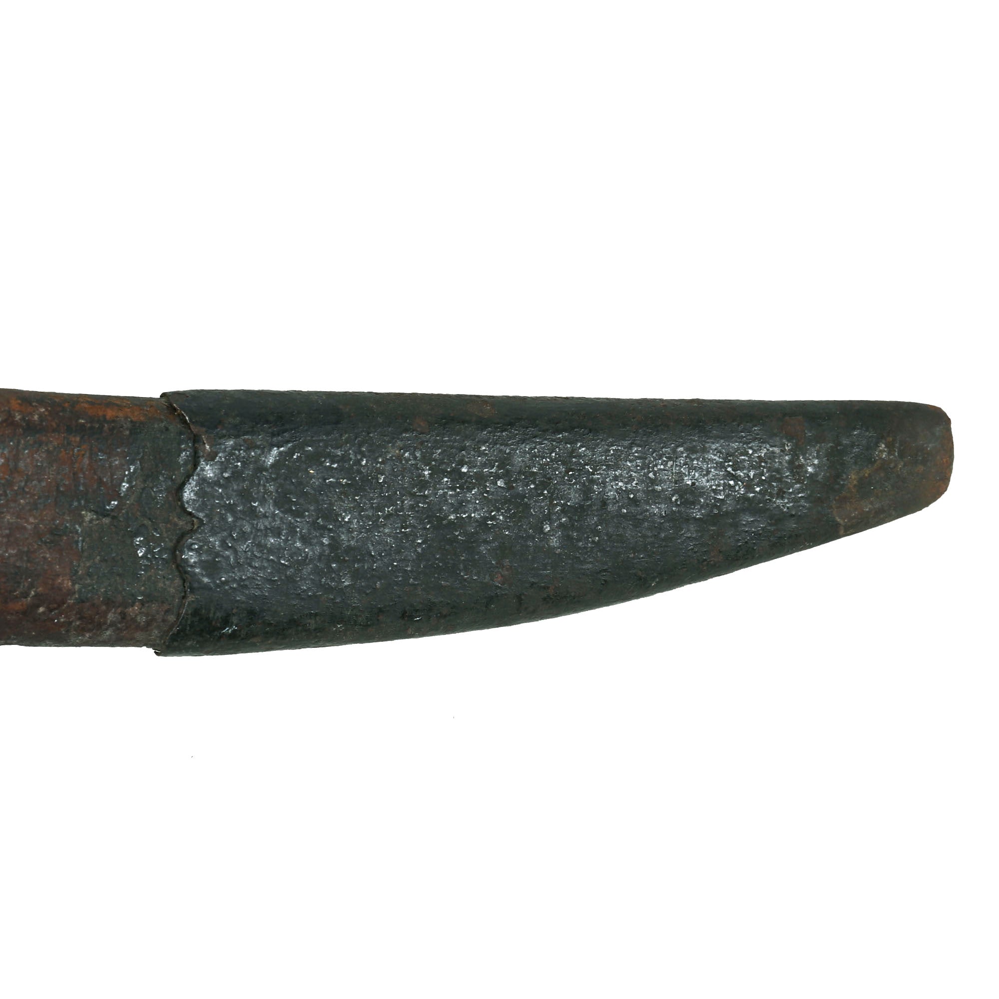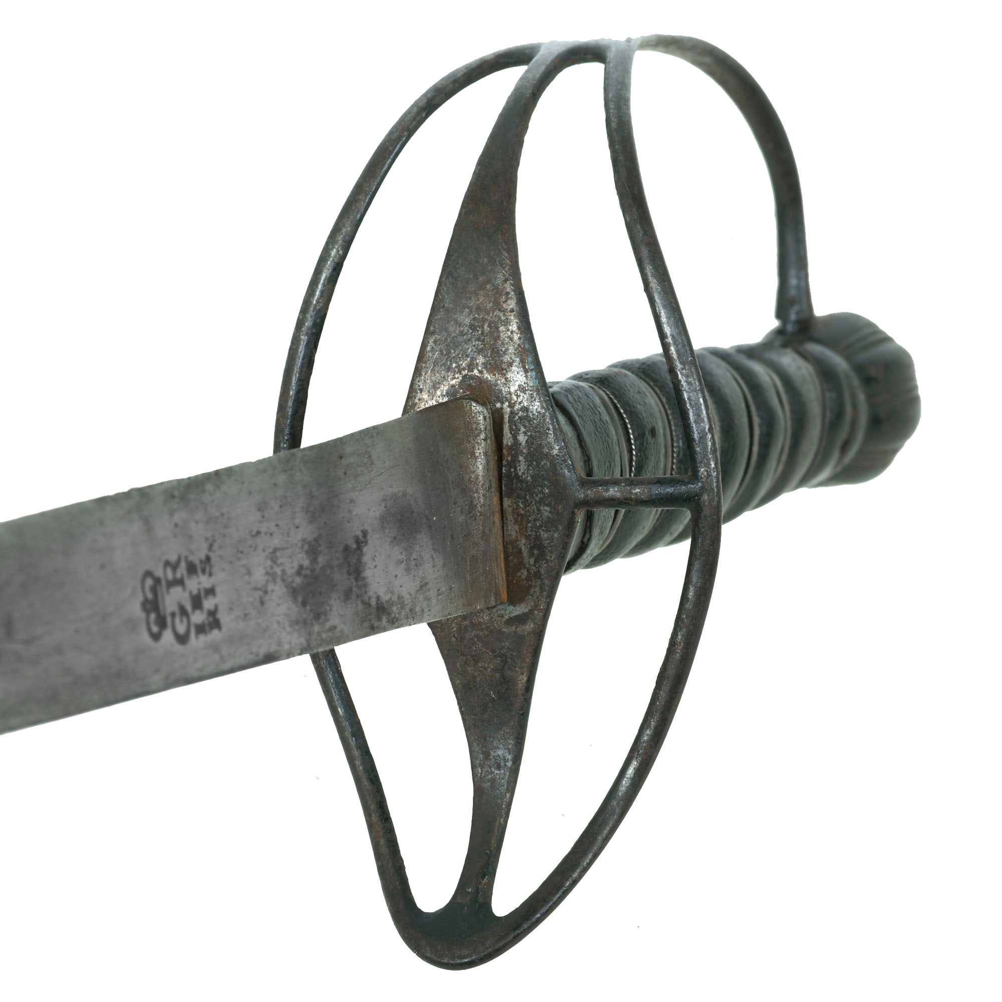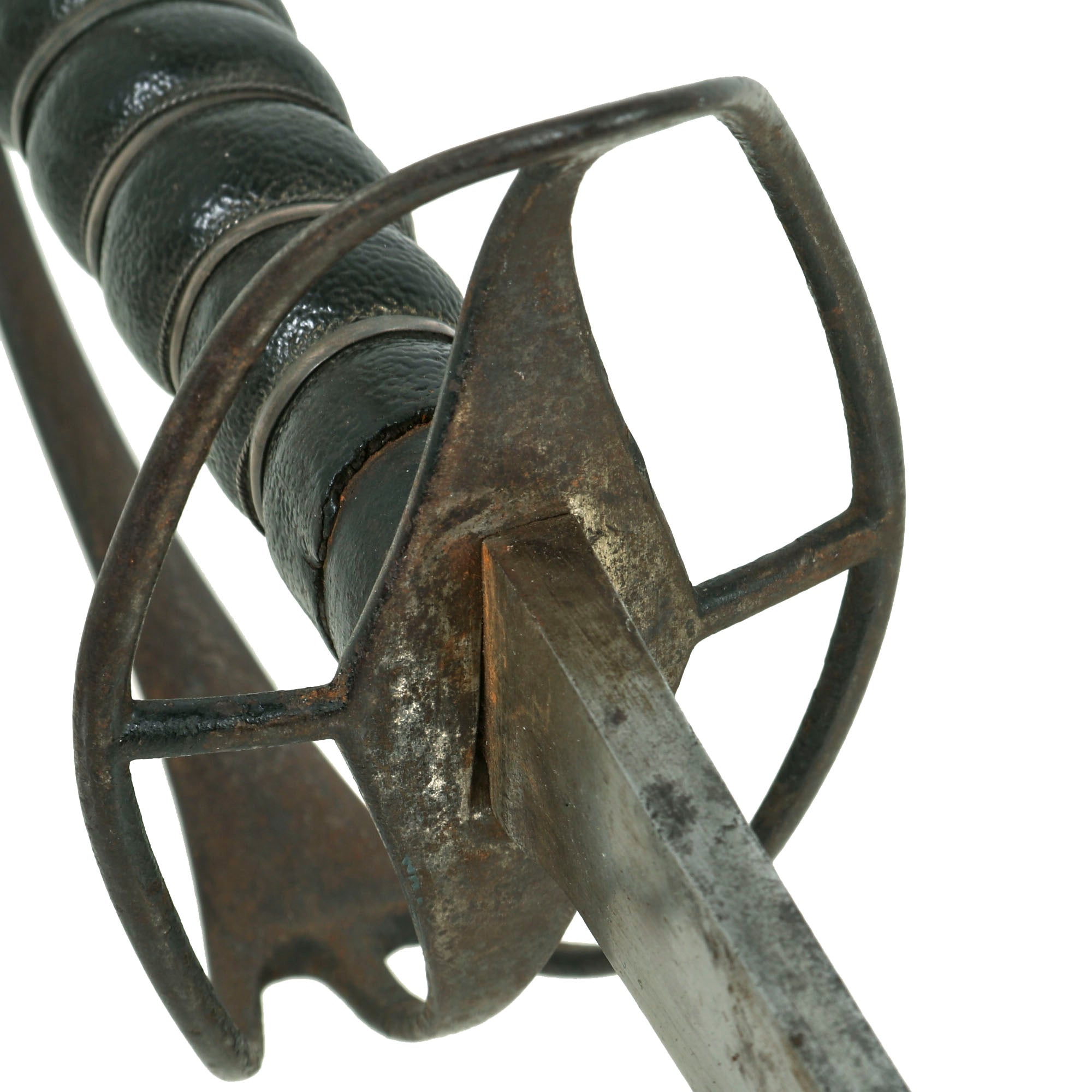 The only thing more difficult to find than this Pattern of saber is its scabbard, which this example retains fully. The iron-mounted leather scabbard measures 37⅜” long. The throat of the scabbard has a small bit of play, as they often do due to the small piece sticking out of the leather above the knob. The drag is tight to the scabbard, and the heavy stitching on the back is extremely well-retained. The leather shows crazing and some cracking in spots, to be expected from 265+ year old leather. The leather has shrunken a bit over time, so the scabbard does not extend to the final ¾” of the blade.
