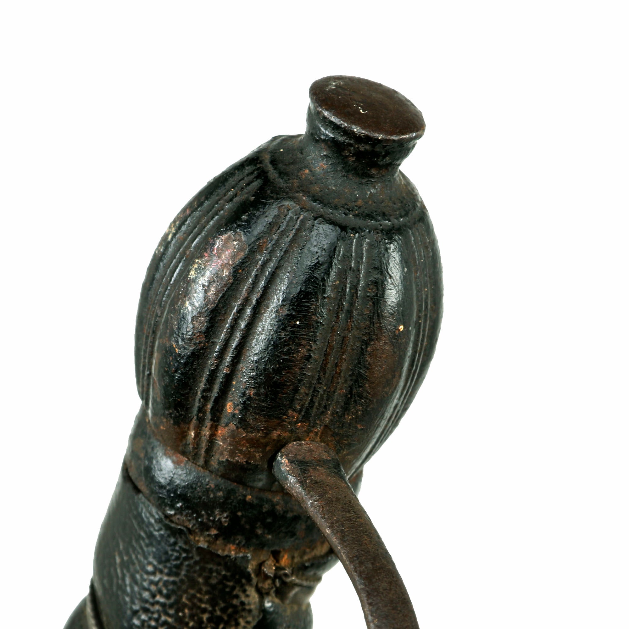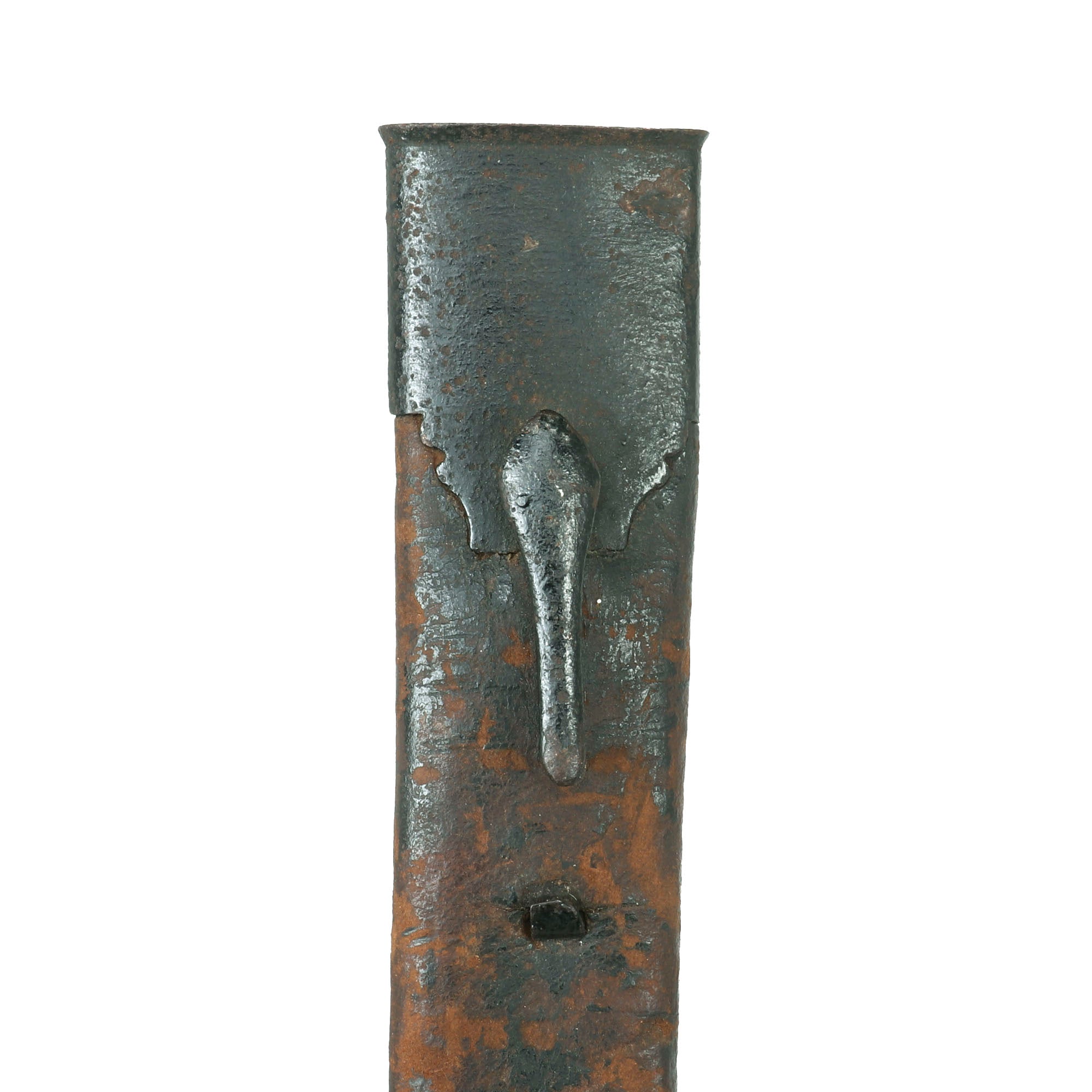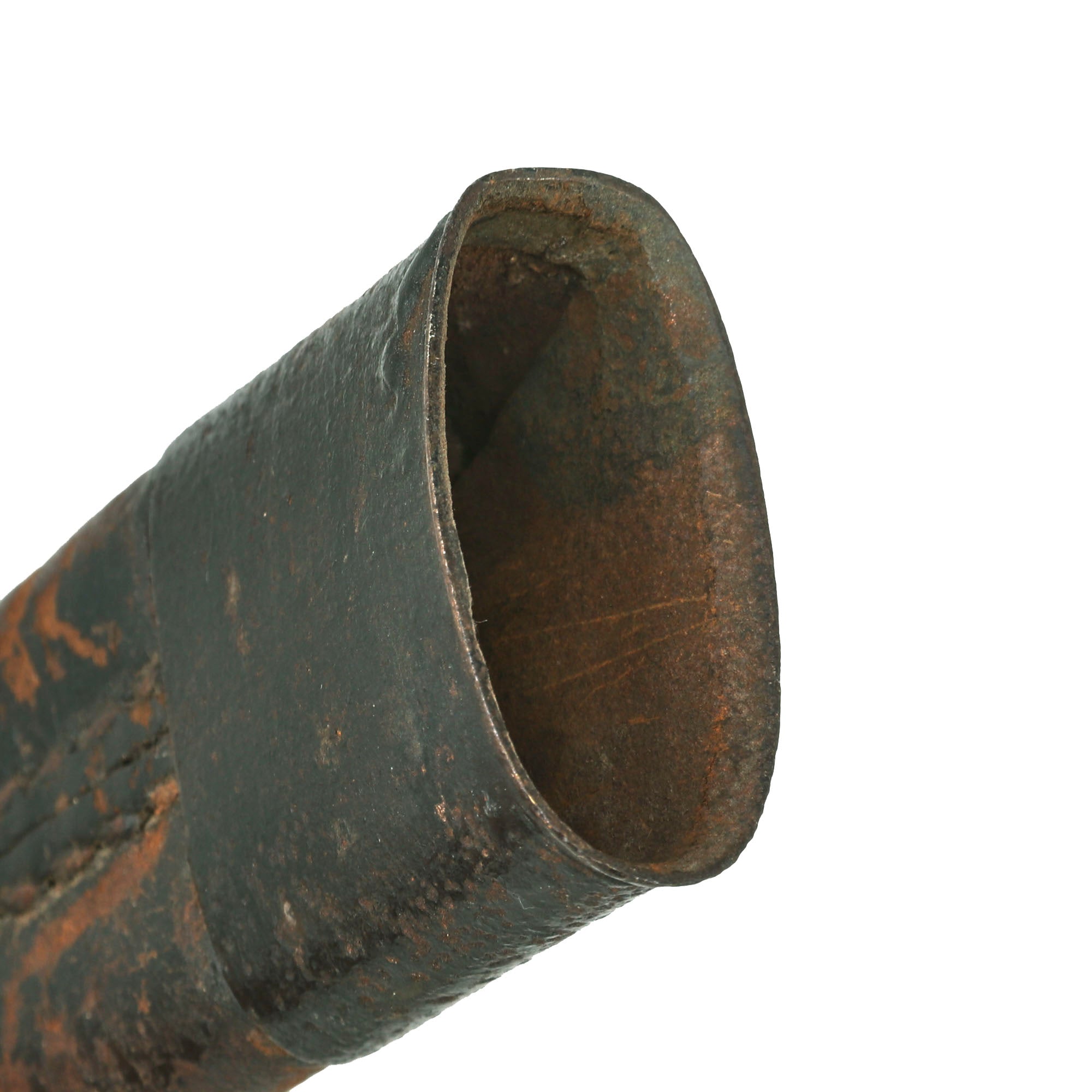 The only thing more difficult to find than this Pattern of saber is its scabbard, which this example retains fully. The iron-mounted leather scabbard measures 37⅜” long. The throat of the scabbard has a small bit of play, as they often do due to the small piece sticking out of the leather above the knob. The drag is tight to the scabbard, and the heavy stitching on the back is extremely well-retained. The leather shows crazing and some cracking in spots, to be expected from 265+ year old leather. The leather has shrunken a bit over time, so the scabbard does not extend to the final ¾” of the blade.