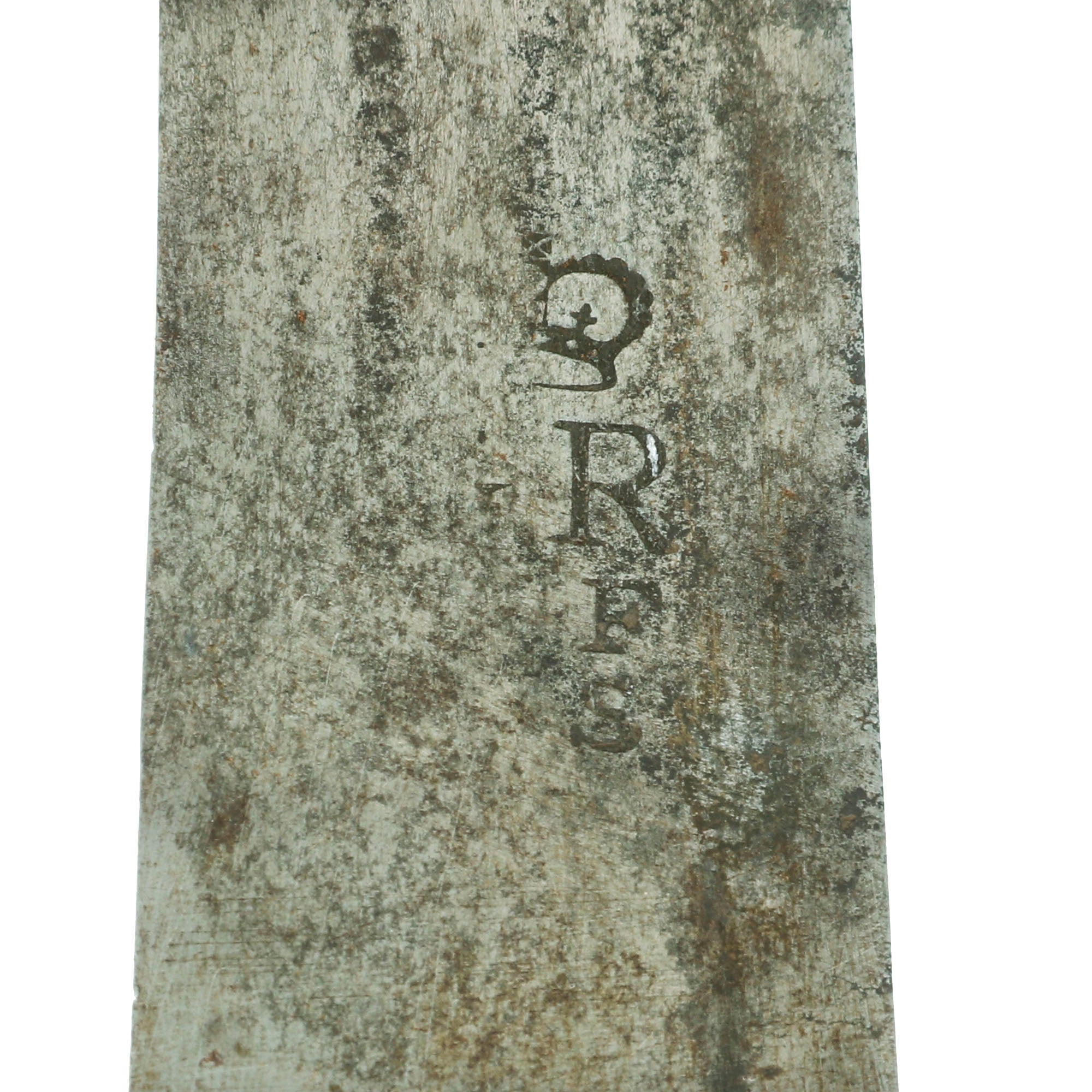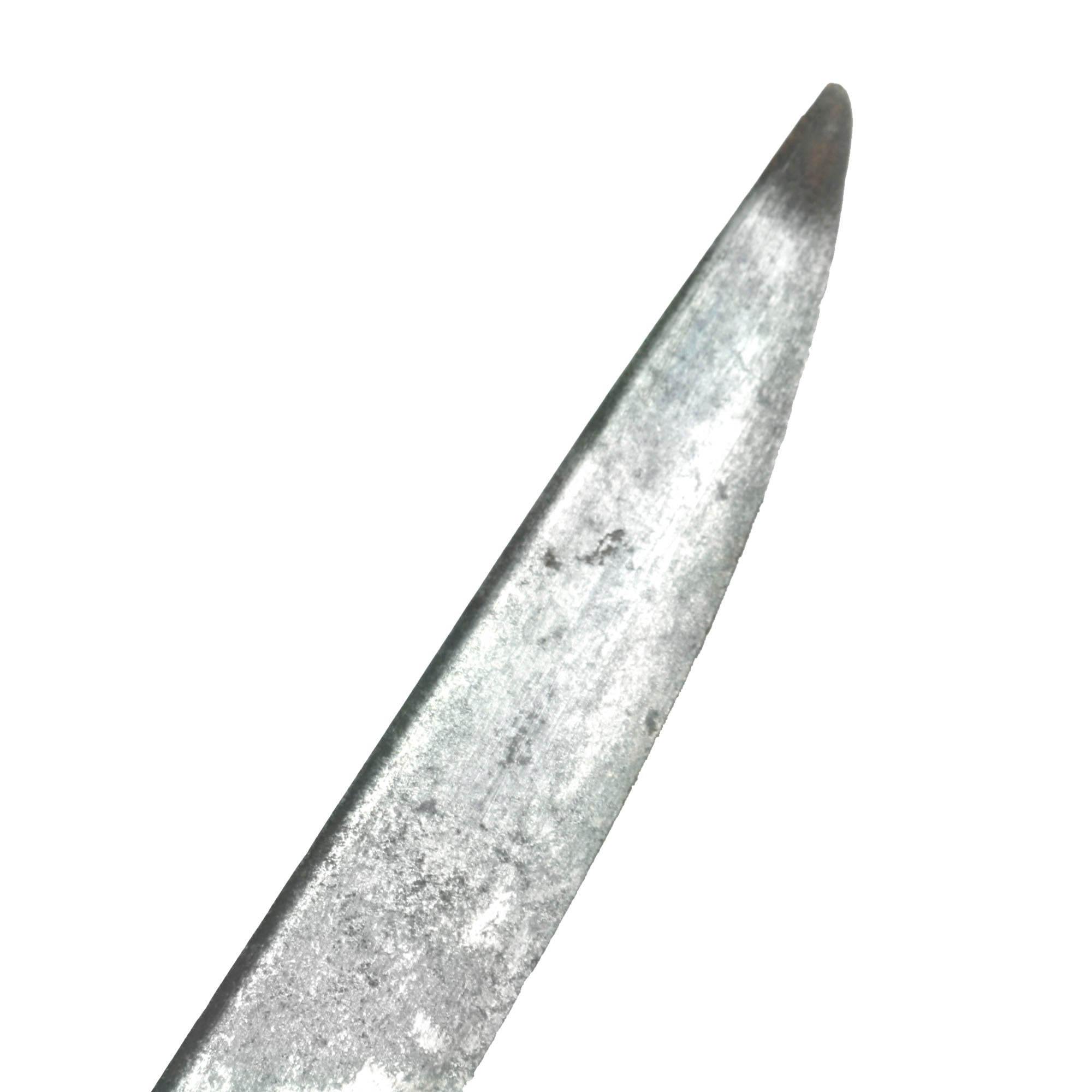 The blade is mostly straight, with a very small bend at the tip as shown. The blade shows heavy service-wear along with some small nicks in the blade that could be from sword impact. The markings are fully retained on one side and half-retained on the other.