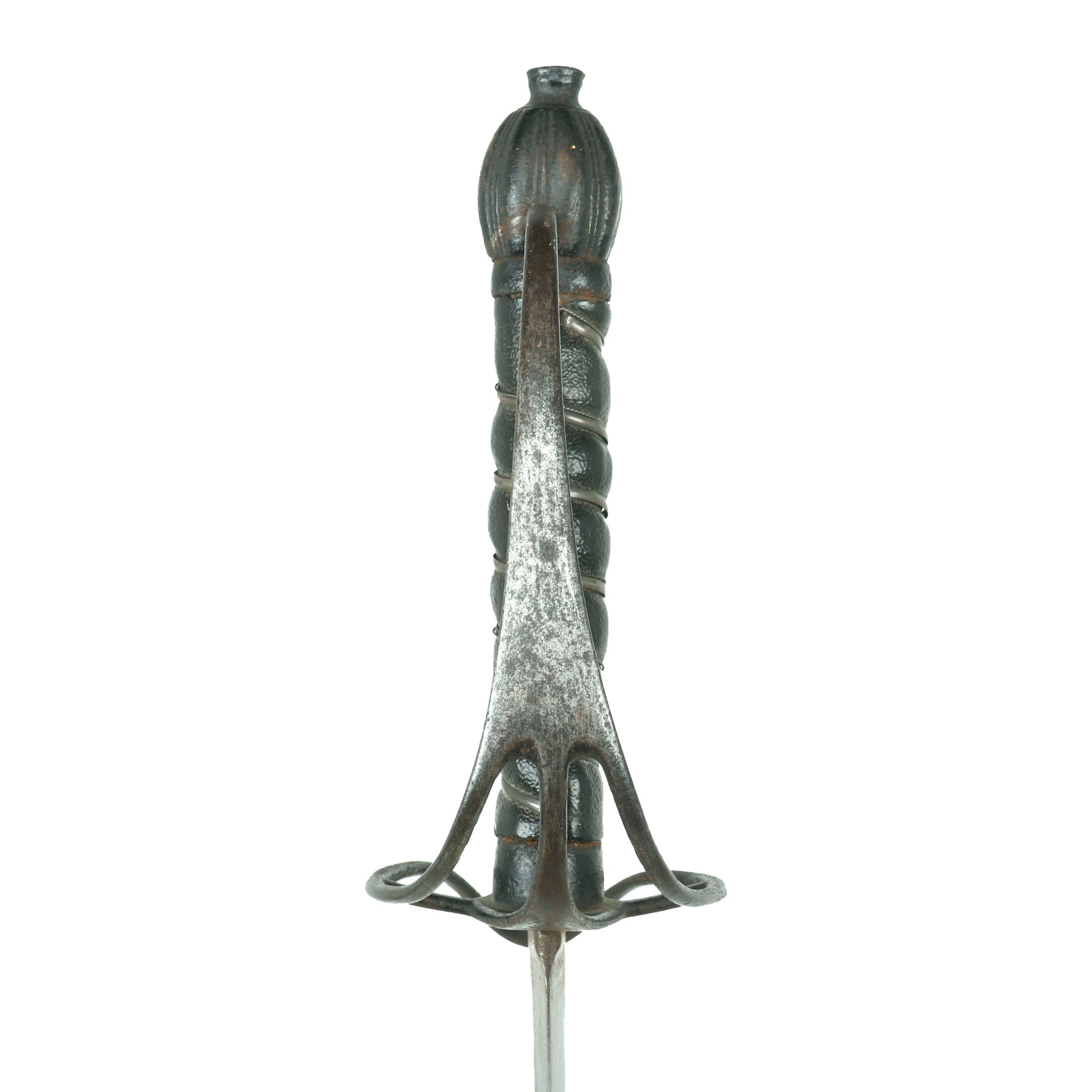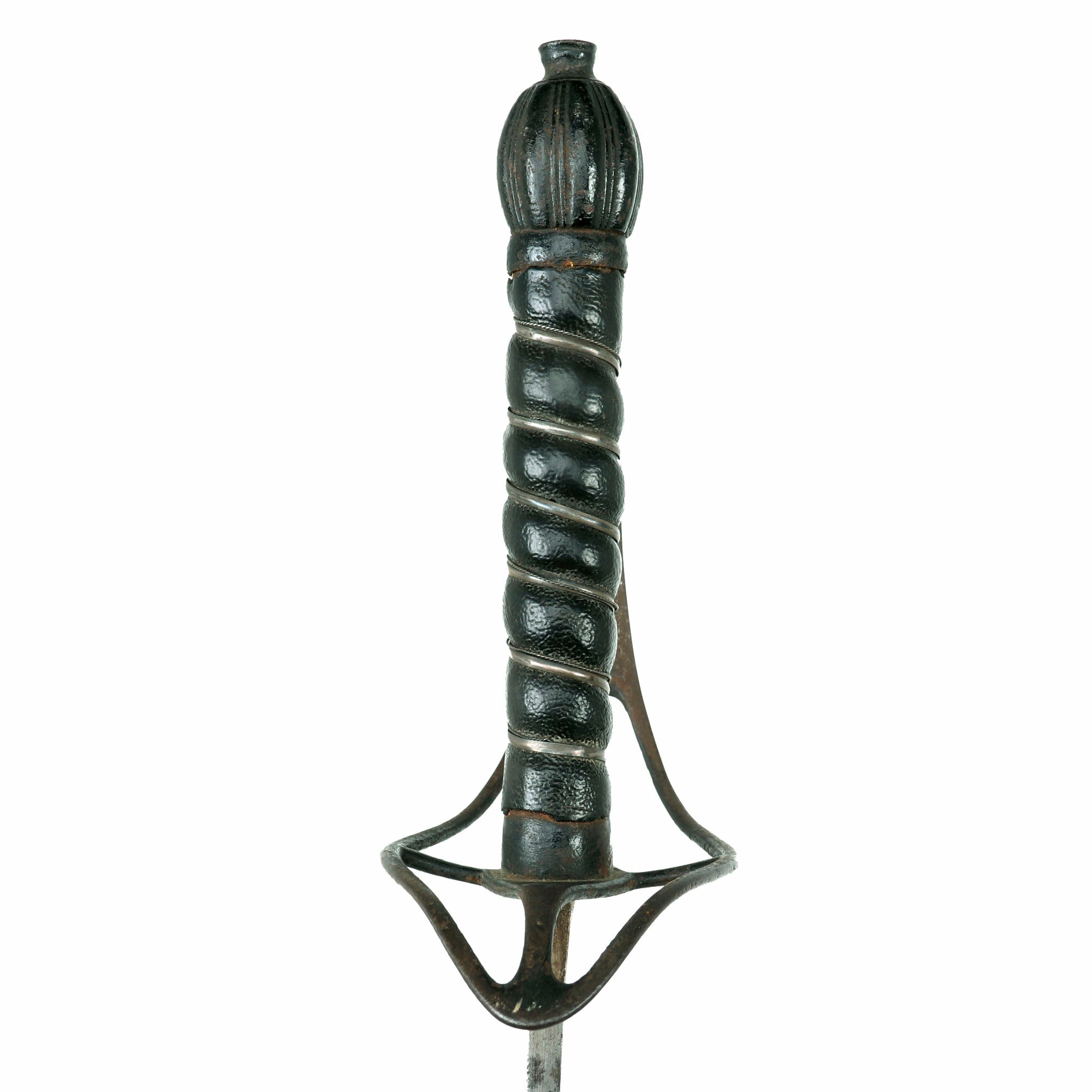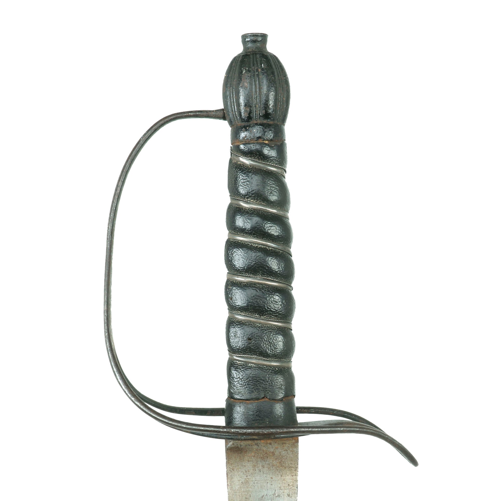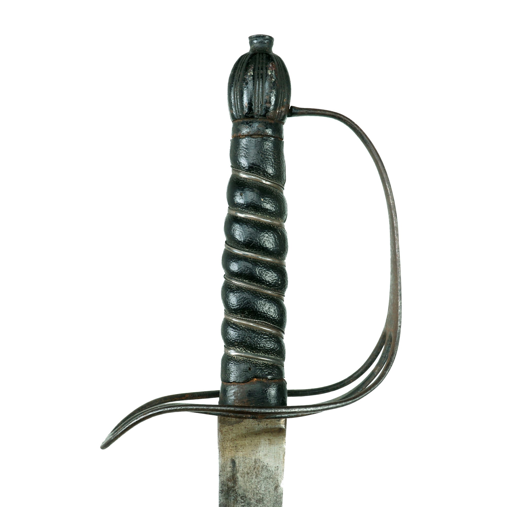 The hilt of this example is of japanned-iron rather than brass as seen with the Pattern 1756, and bears a lovely silver ribbon & twisted wire-wrapped lacquered-sharkskin grip, with the same stirrup-style guard as found on the Pattern 1756. The lacquering of the sharkskin is an interesting design choice and was done during the period. The sharkskin has held up tremendously with just a few small woodworm-sized holes. The pommel is well-faceted. The hilt has light oxidation spotting but has held up very well overall. The overall length of the saber is 43⅞”. The silver ribbon & twisted wire wrap suggests issue to a non-commissioned officer rather than a trooper.