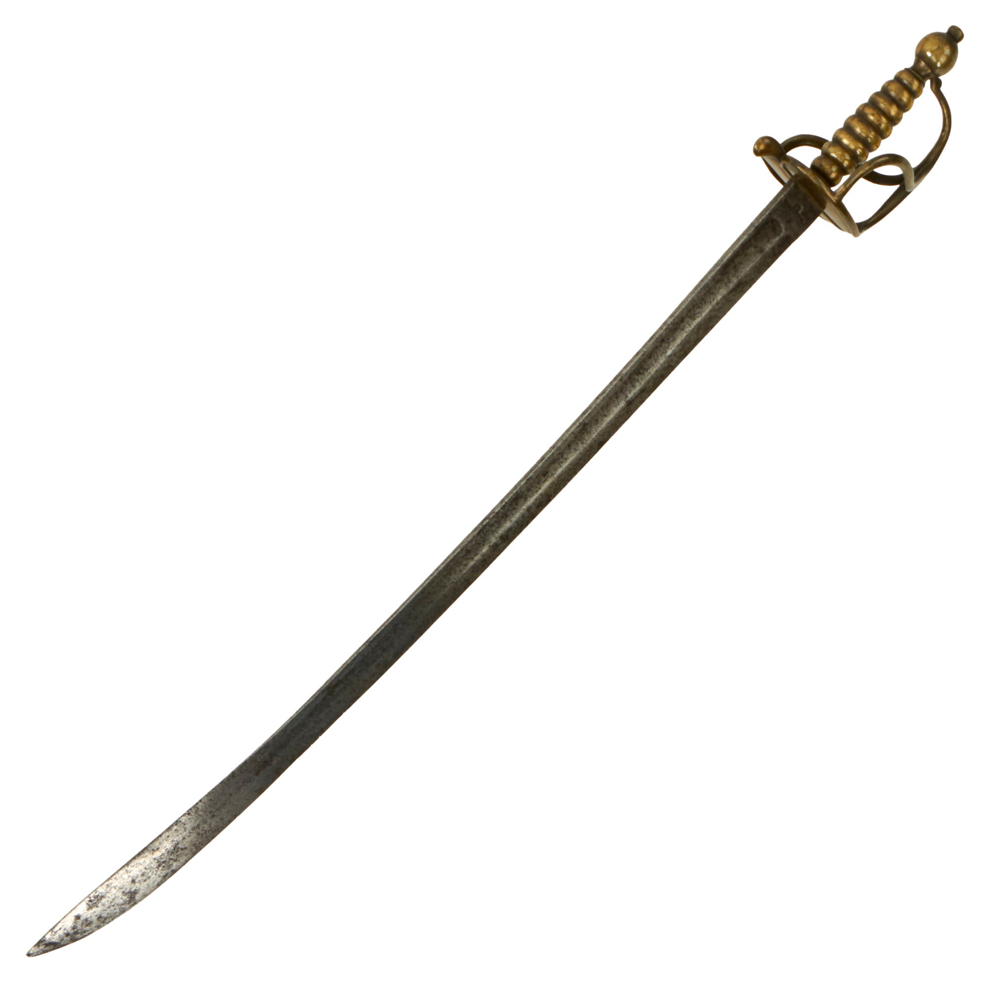 This is a very nice matured English Pattern of 1742 Infantry Hanger, or Sword, correct to the pattern with a distinctive "heart" shaped guard bearing a small protrusion at the top. It features a 27 1/4" curved blade. The brass hilt of this hanger consists of a heart-shaped crossguard with reinforced borders, flattened globular quillon and a curved knuckle-guard joined on both sides by scrolled side branches emanating from the crossguard. The hollow, brass grip was cast in two pieces and is grooved or channeled, terminating in an integral, ball-shaped pommel. A near identical example of this scarce pattern is in the Royal Collection at Windsor Castle.