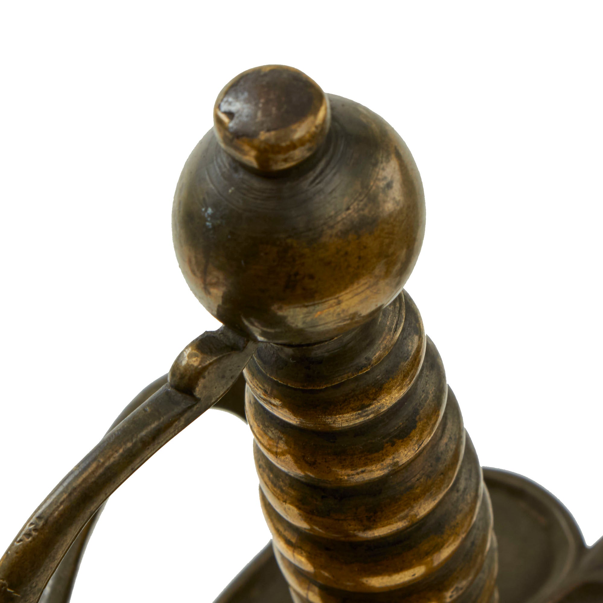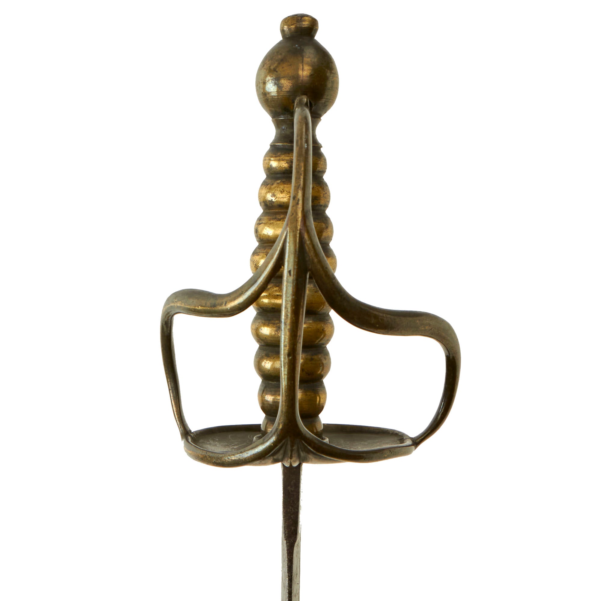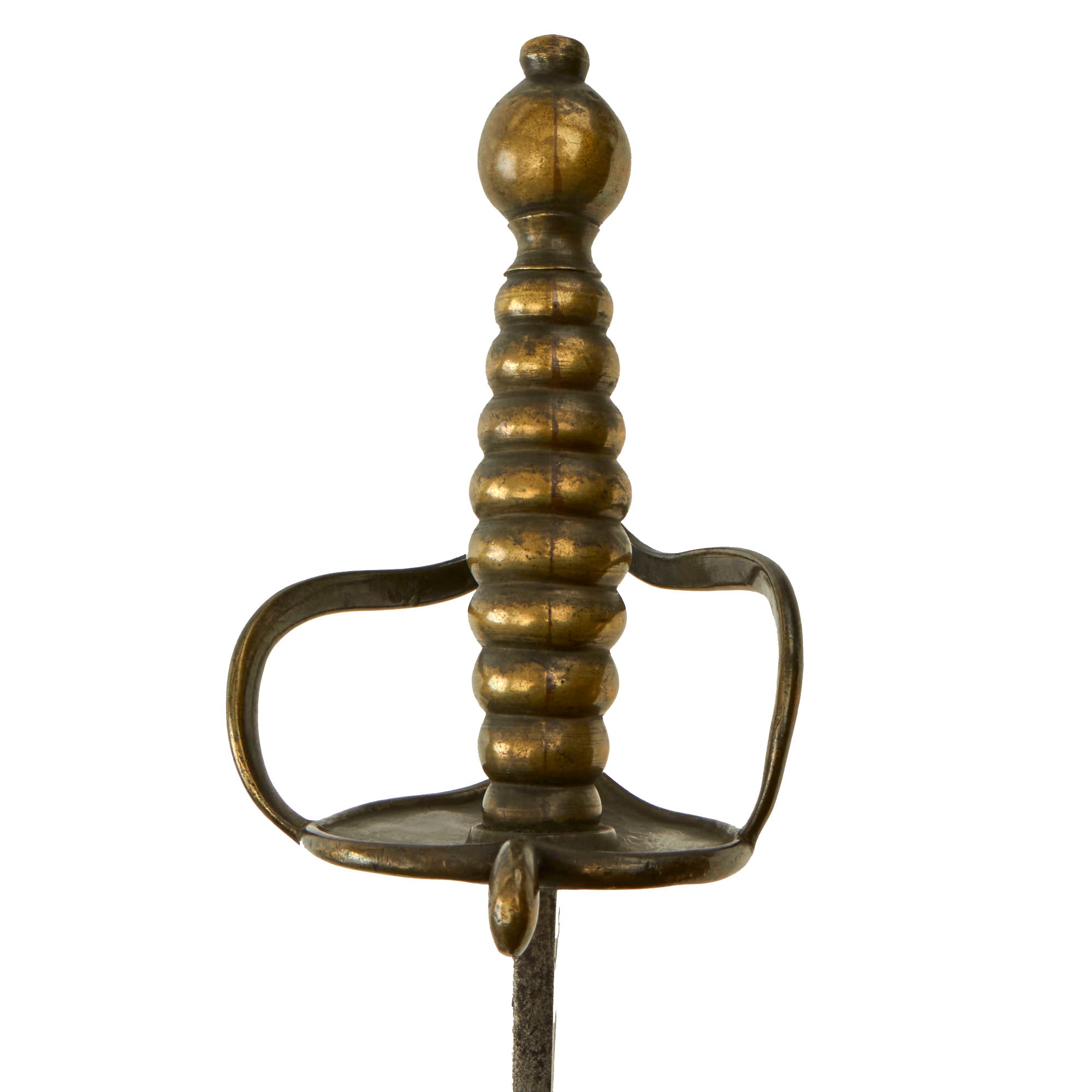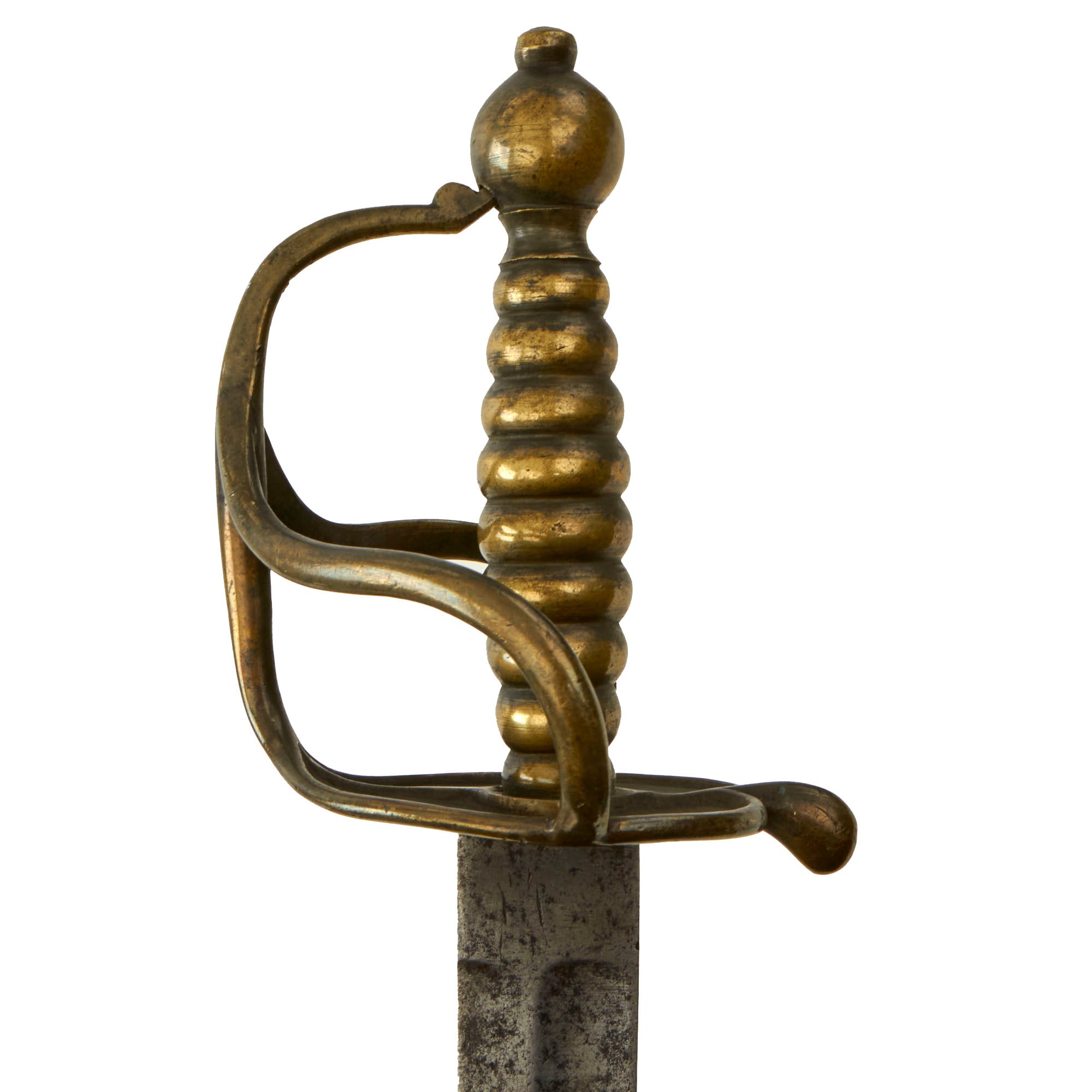 These feature a brass hilt cast in two pieces, the brass grip and pommel, and the counter guard with knuckle bow. The guard is quite distinctive, spreading into a heart shape with a raised border and center ridge on both sides, and featuring a small protrusion at the very top. The grip itself is usually bound with twisted brass wire for a more secure grip, but this example has the stepped brass ball grip.