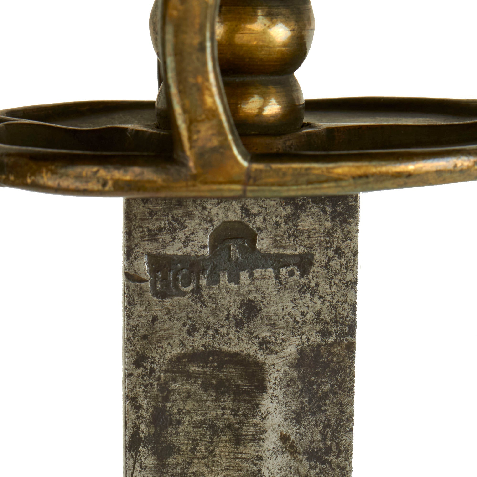 The ricasso of the hanger is deeply stamped with the maker’s touchmark at the ricasso and consists of a cartouche bearing T / HOLLIER within. This identifies the sword as having been manufactured by Thomas Hollier. Thomas Hollier (c. 1680-1754) was a Kentish cutler & a contractor for the British Board of Ordnance, and worked as their tenant armourer at Armoury Mills, Lewisham, London from 1716-1753. Many of these contracts included He is said to be the likely father of the double-disk cutlass design. Sea Service swords (cutlasses) and hangers, most of which were produced on facilities he leased at the Board’s Armoury Mills at Lewisham, London. Blades of this form are also found on the doghead-hilted cutlasses or Sea Service swords that Hollier also produced for the Board of Ordnance during this period.