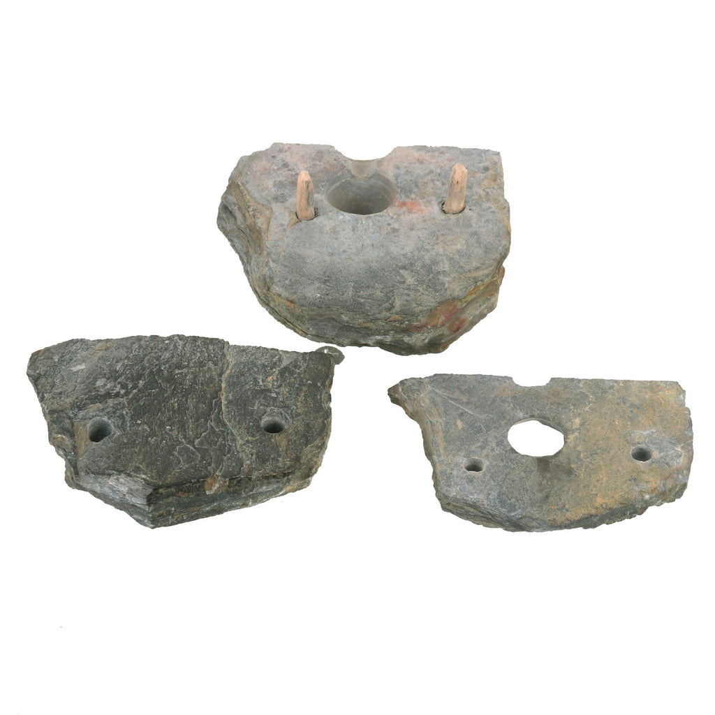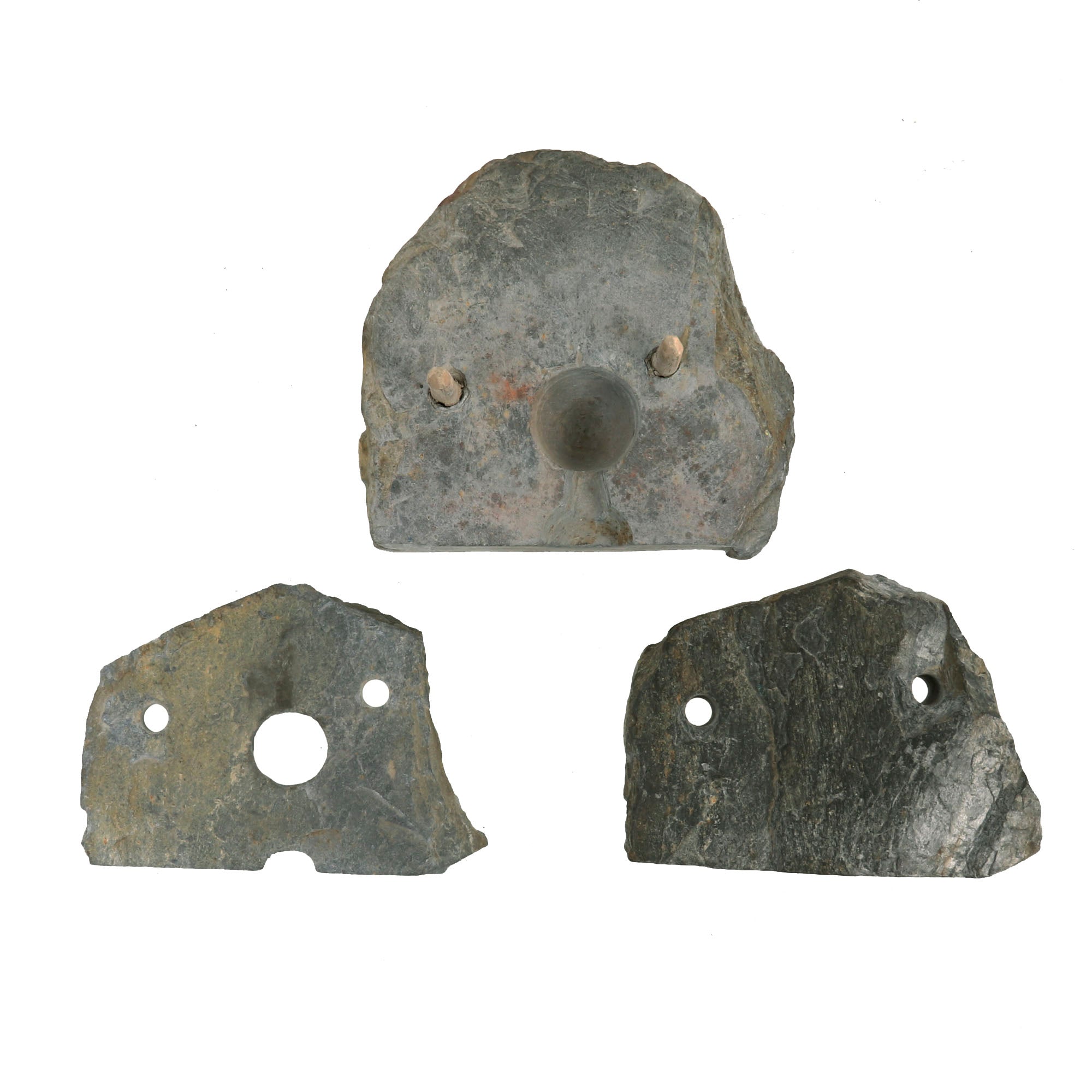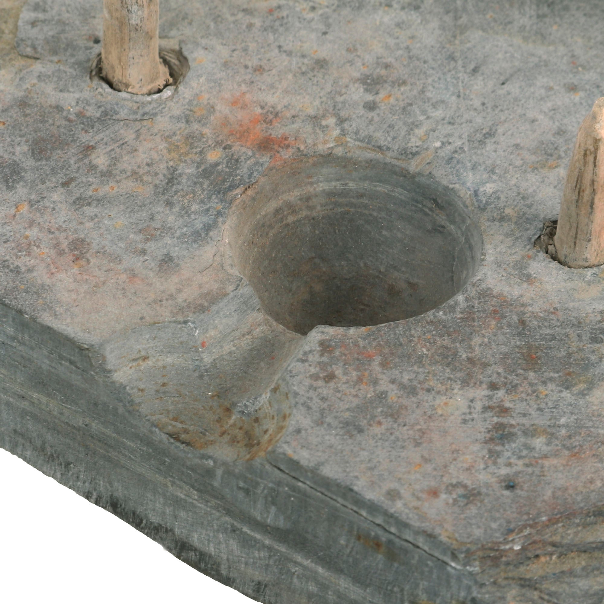 Allowing for up to 1% shrinkage rate when casting soft lead, that still leaves a ball that would be too large for a British Pattern 1738 wall gun, which had a 0.92 caliber barrel. However, this ball is admirably suited for the rifled wall guns being produced by James Hunter's Rappahannock forge, some of which had 1.10 caliber barrels--approximately a 4 bore arm--especially when one bears in mind that patching would be ideally required when loading and firing such a rifled arm. All three pieces of the mold were stacked together and two holes were drilled, one on each side of the cavity. Posts or rods, also carved and filed from shale, were sent into the largest or base piece, allowing the 3 pieces to align properly when casting.