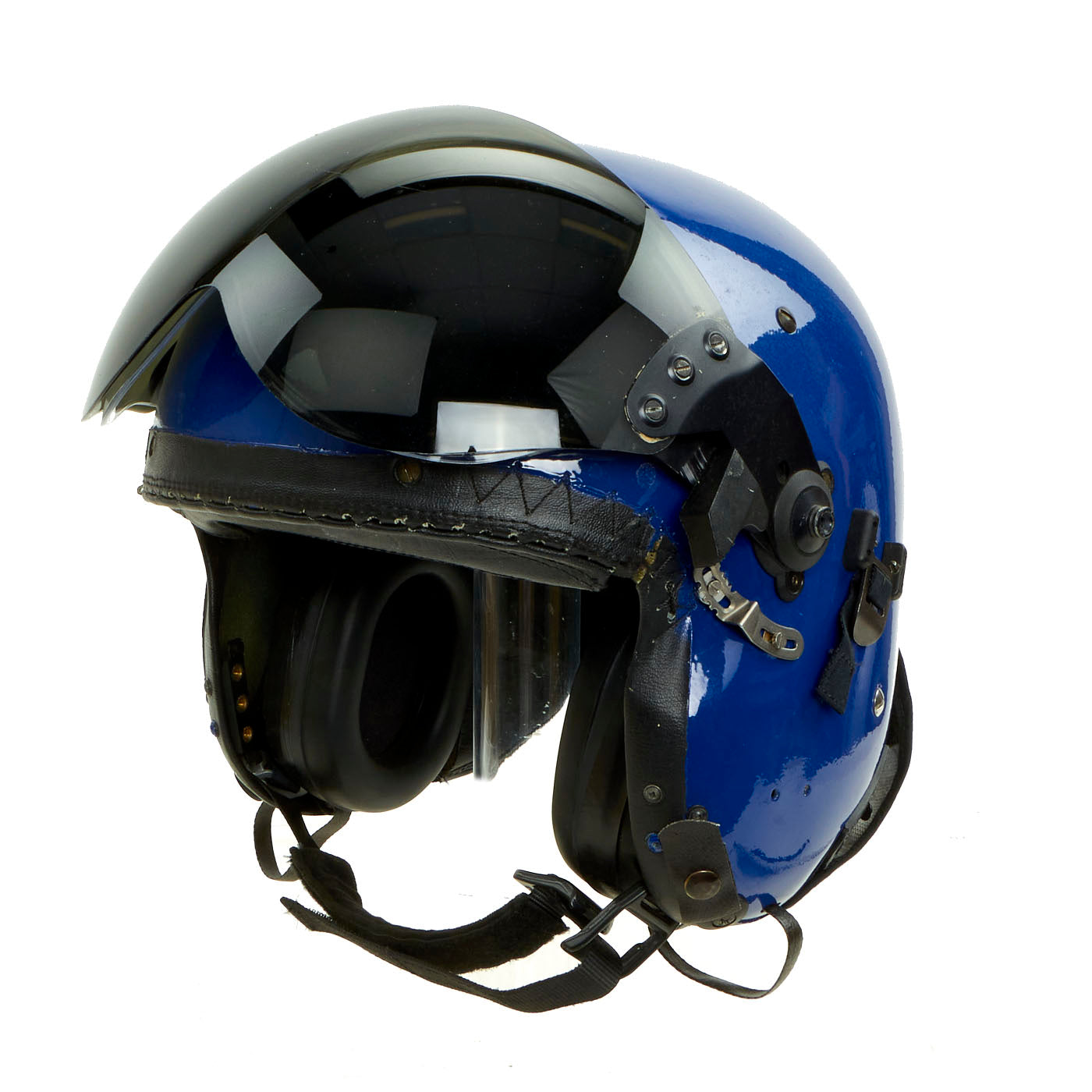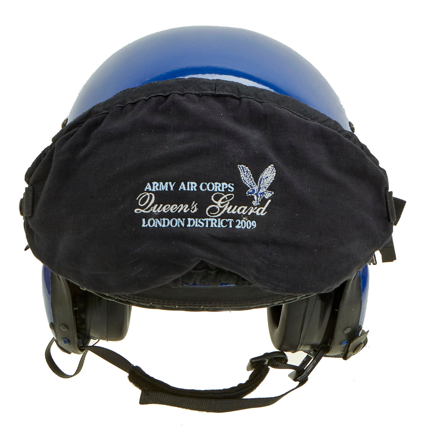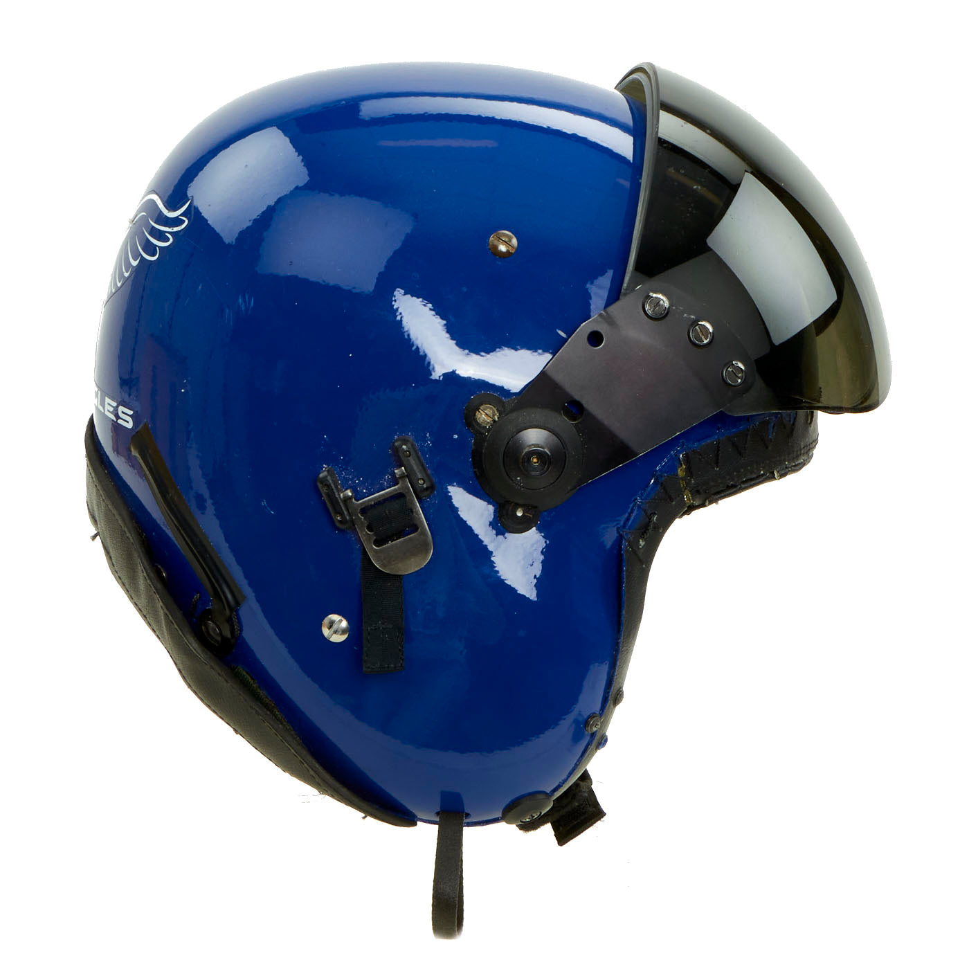 This helmet belonged to a pilot or crewman that was a part of the Blue Eagles Helicopter Aerobatic Team of the British Army Air Corps in 2009! The helmet is a size large and appears to be complete without the electronics for obvious reasons. There is minor wear to the helmet and no extensive damage. The dual visors are both functional and clear. The reverse of the helmet has a lovely Blue Eagles decal with the words Blue Eagles beneath it. The visor cover is free of damage and has the following embroidered on it: