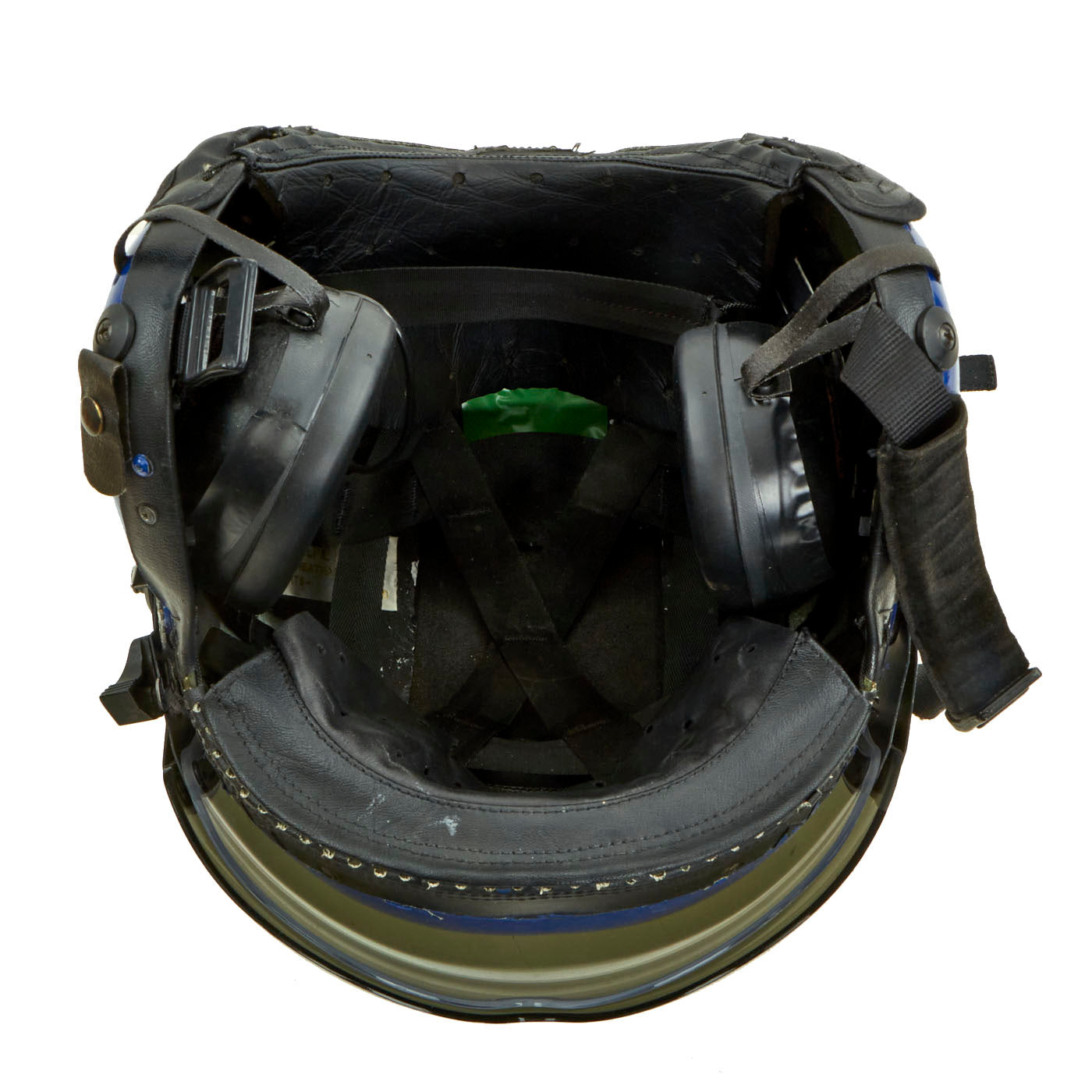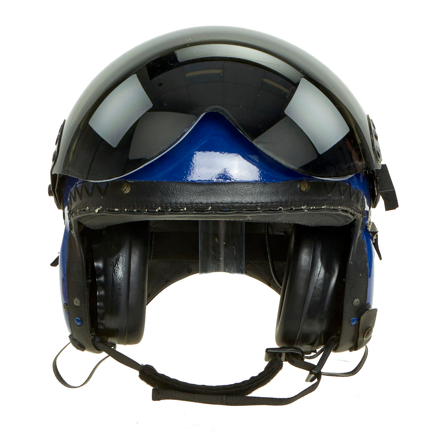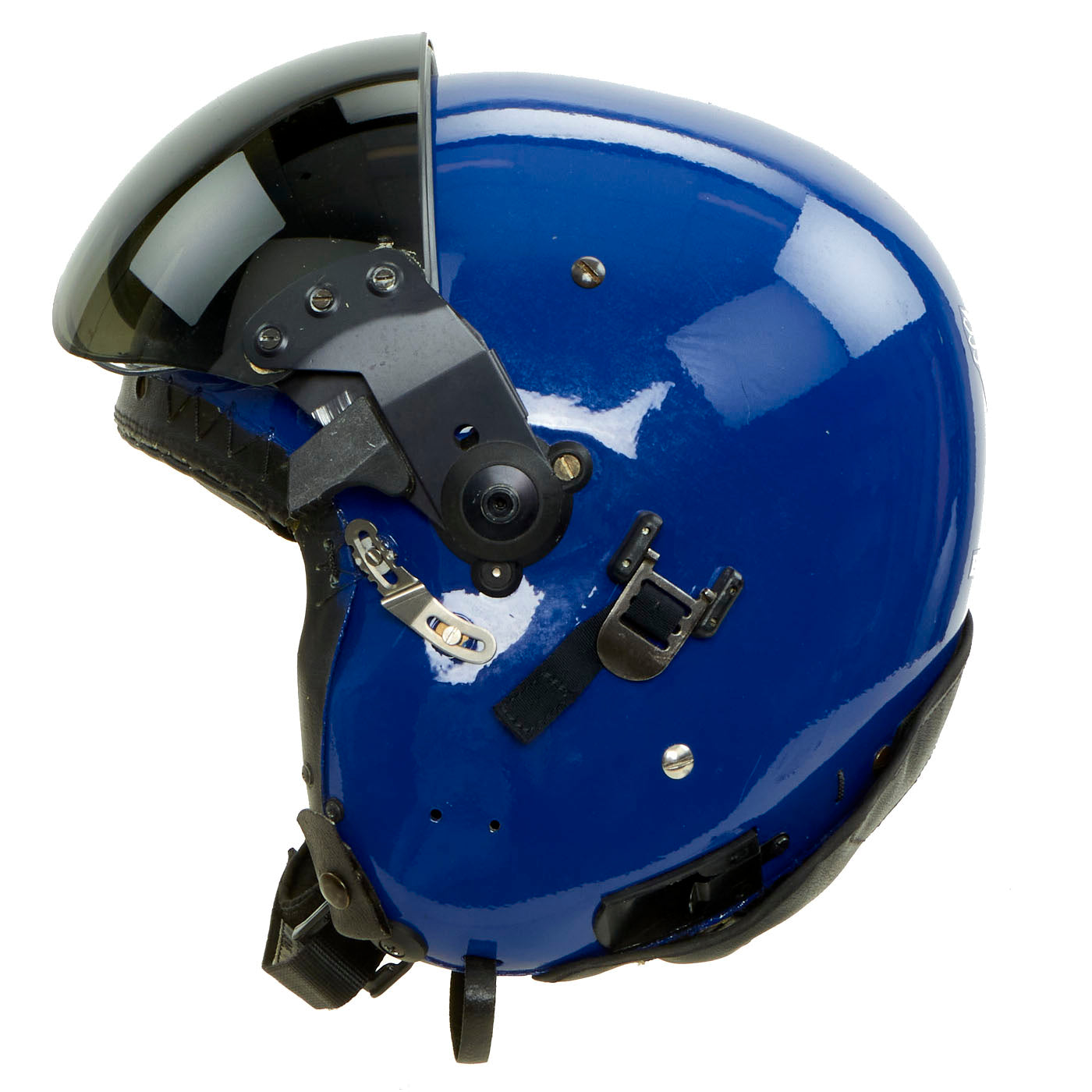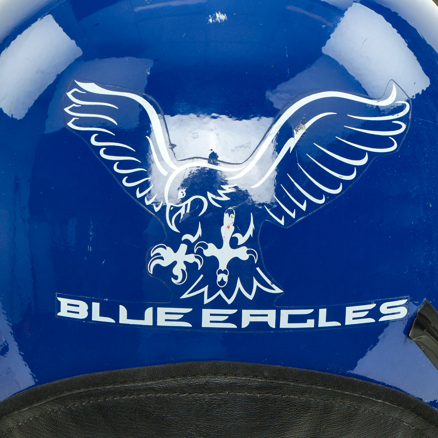 This helmet belonged to a pilot or crewman that was a part of the Blue Eagles Helicopter Aerobatic Team of the British Army Air Corps in 2009! The helmet is a size large and appears to be complete without the electronics for obvious reasons. There is minor wear to the helmet and no extensive damage. The dual visors are both functional and clear. The reverse of the helmet has a lovely Blue Eagles decal with the words Blue Eagles beneath it. The visor cover is free of damage and has the following embroidered on it: