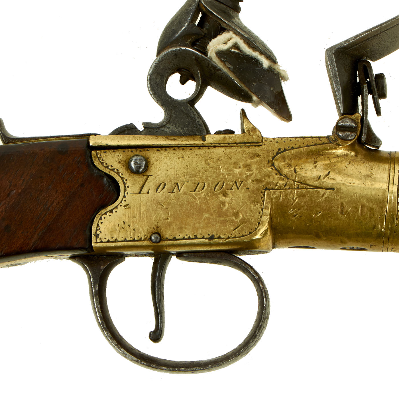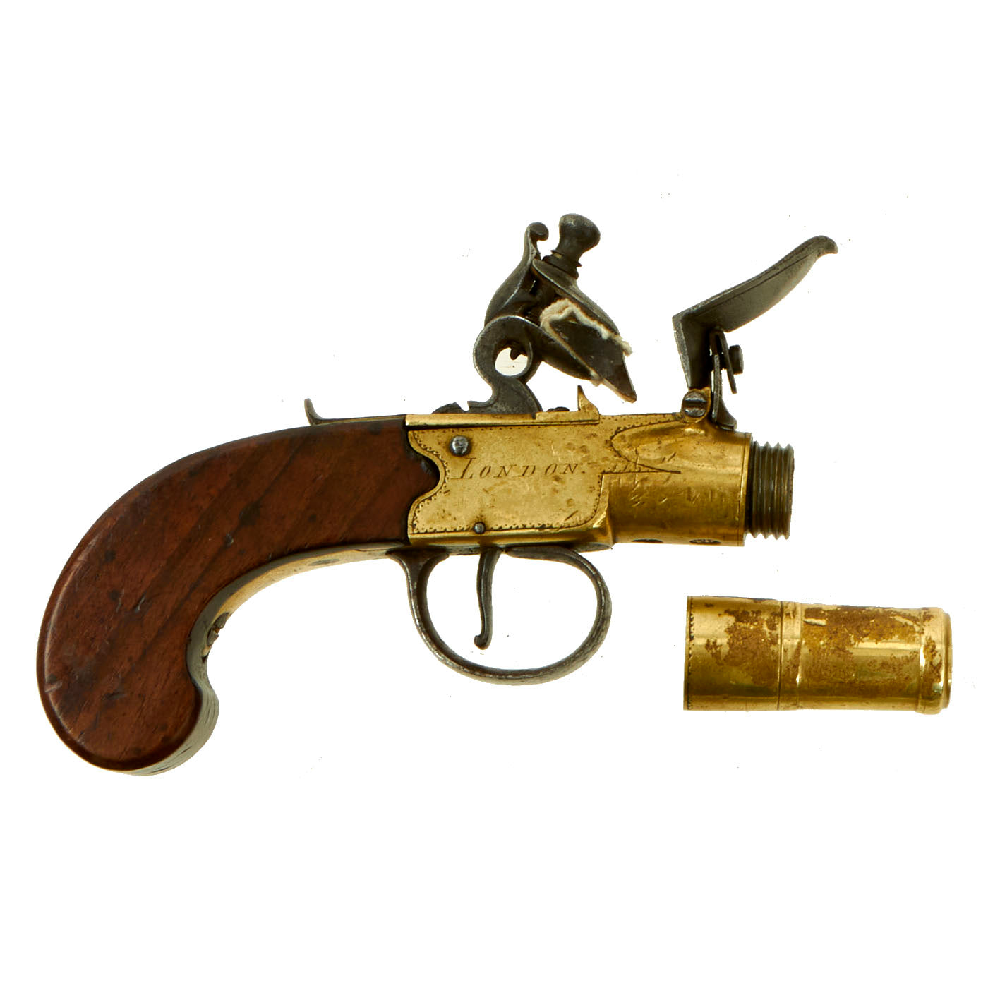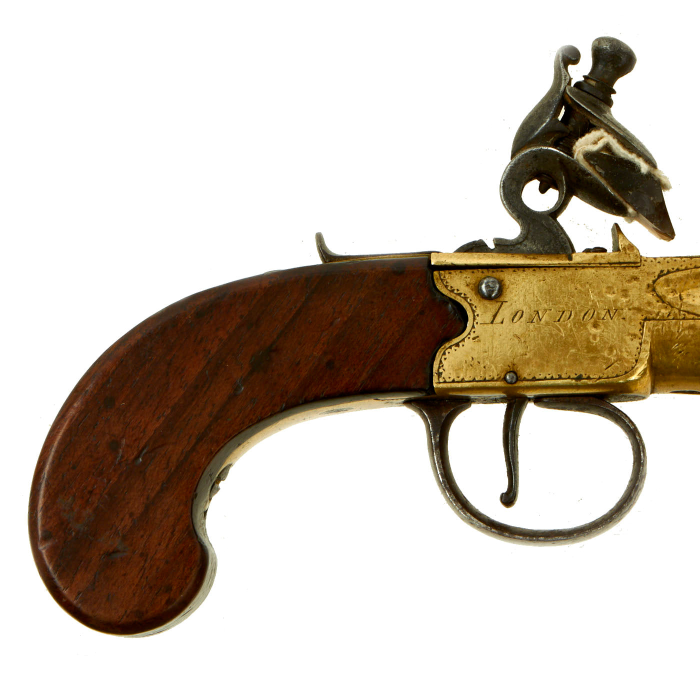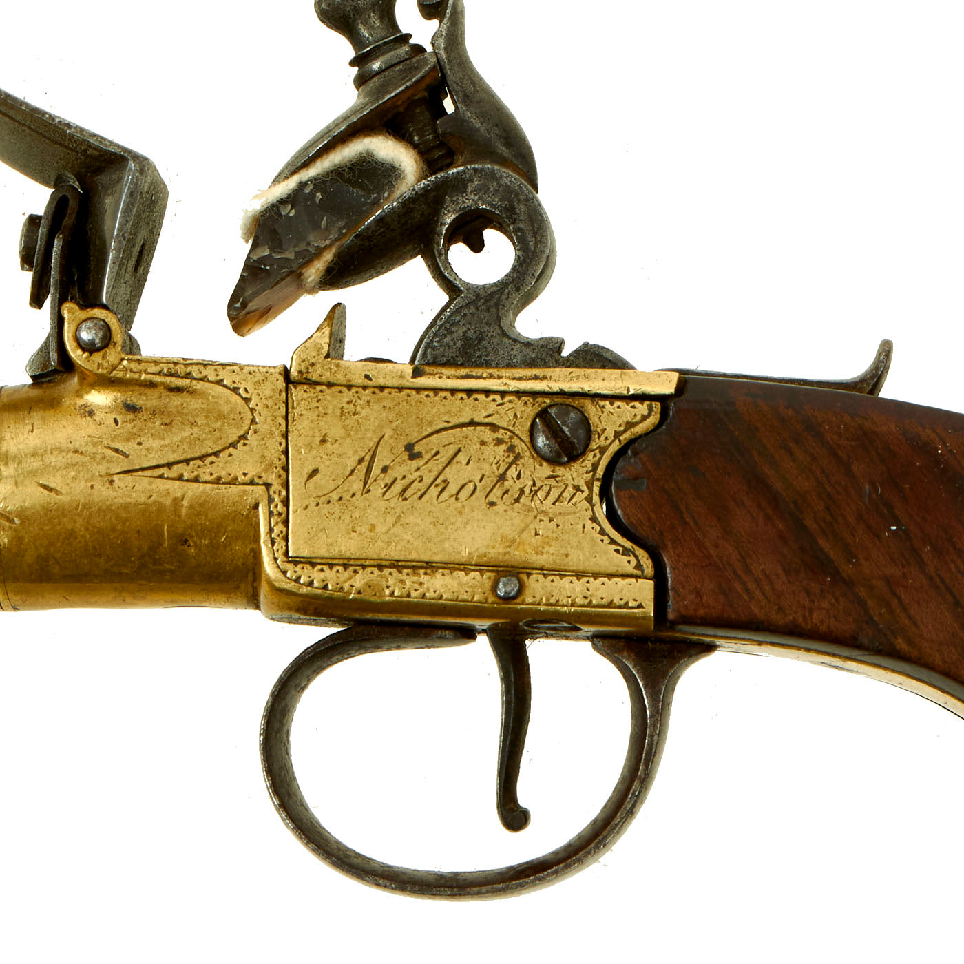 Original Item. Only One Available. This is a great condition brass framed flintlock pocket pistol dating to approximately 1790, and marked clearly on the lock plates with Nicholson. and LONDON. E.D. Nicholson of the Cornhill area of London is a known gunsmith, and worked there from 1760 until 1808, definitely a long career in those days!