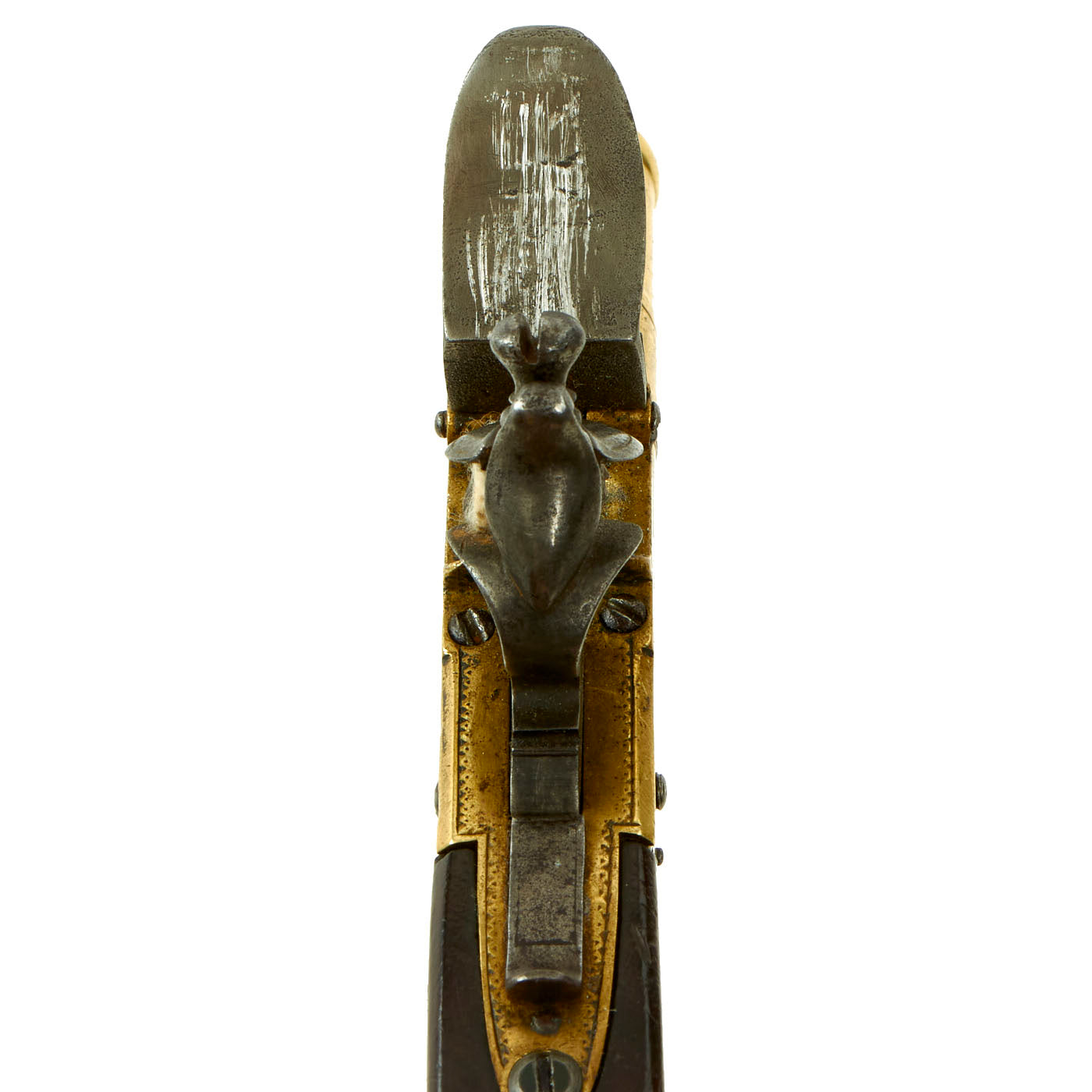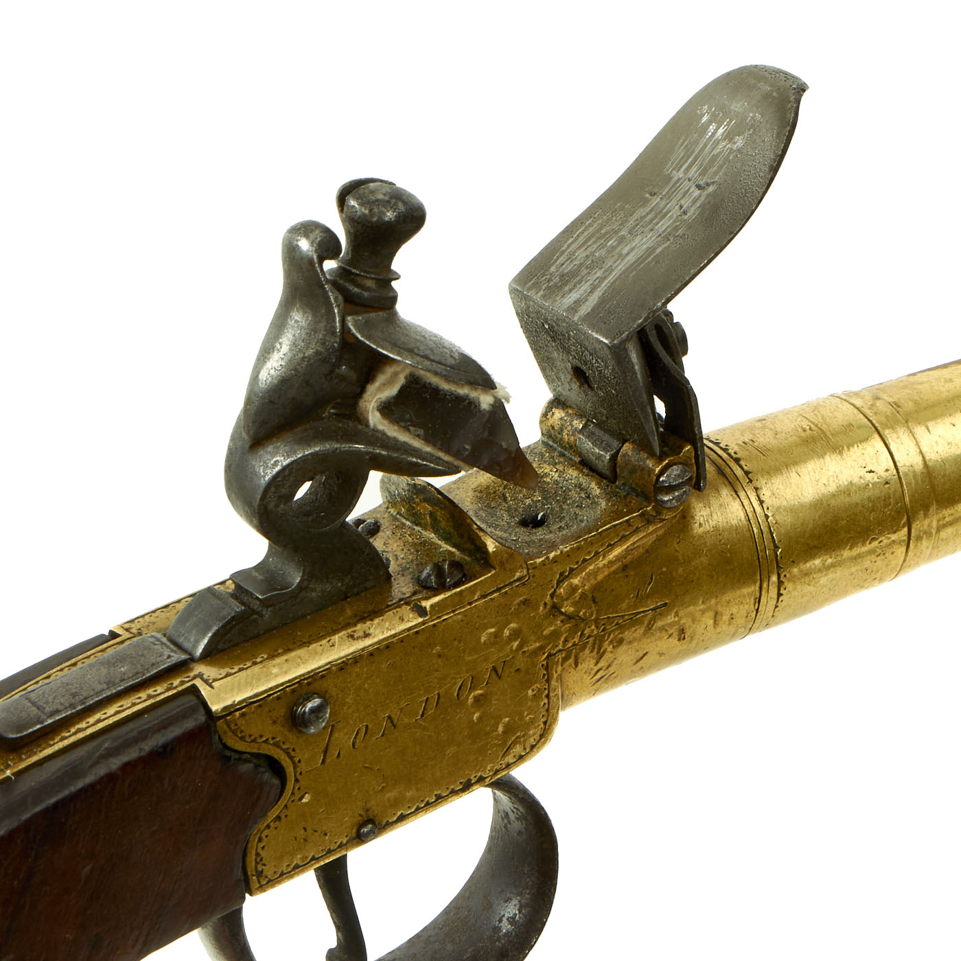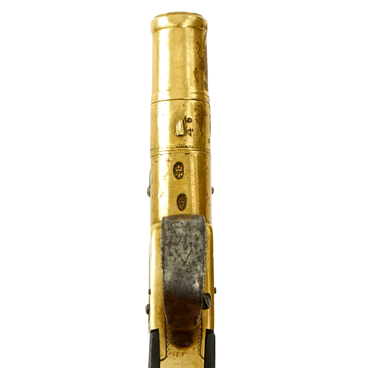 The weapon measures 6" in overall length with a screw off 1 1/2" smooth bored brass cannon barrel. The bottom of the barrel has the CROWN / GP "Gunmakers" proof and CROWN / V viewed markings of the London Proof house. The frame, action and barrel are show a lovely yellowed brass patina, with some oxidation on the left side, which we have left intact to avoid disturbing the patina.