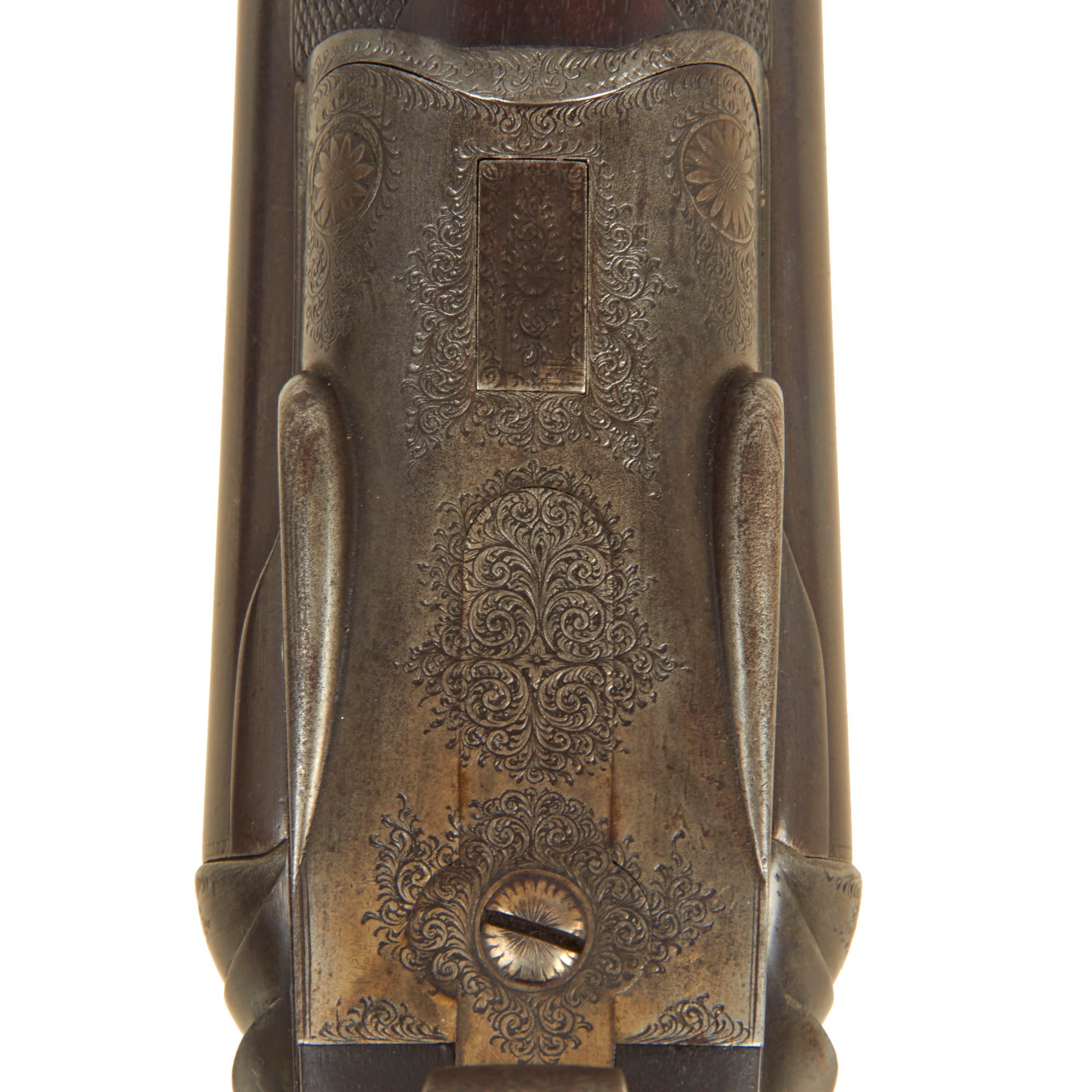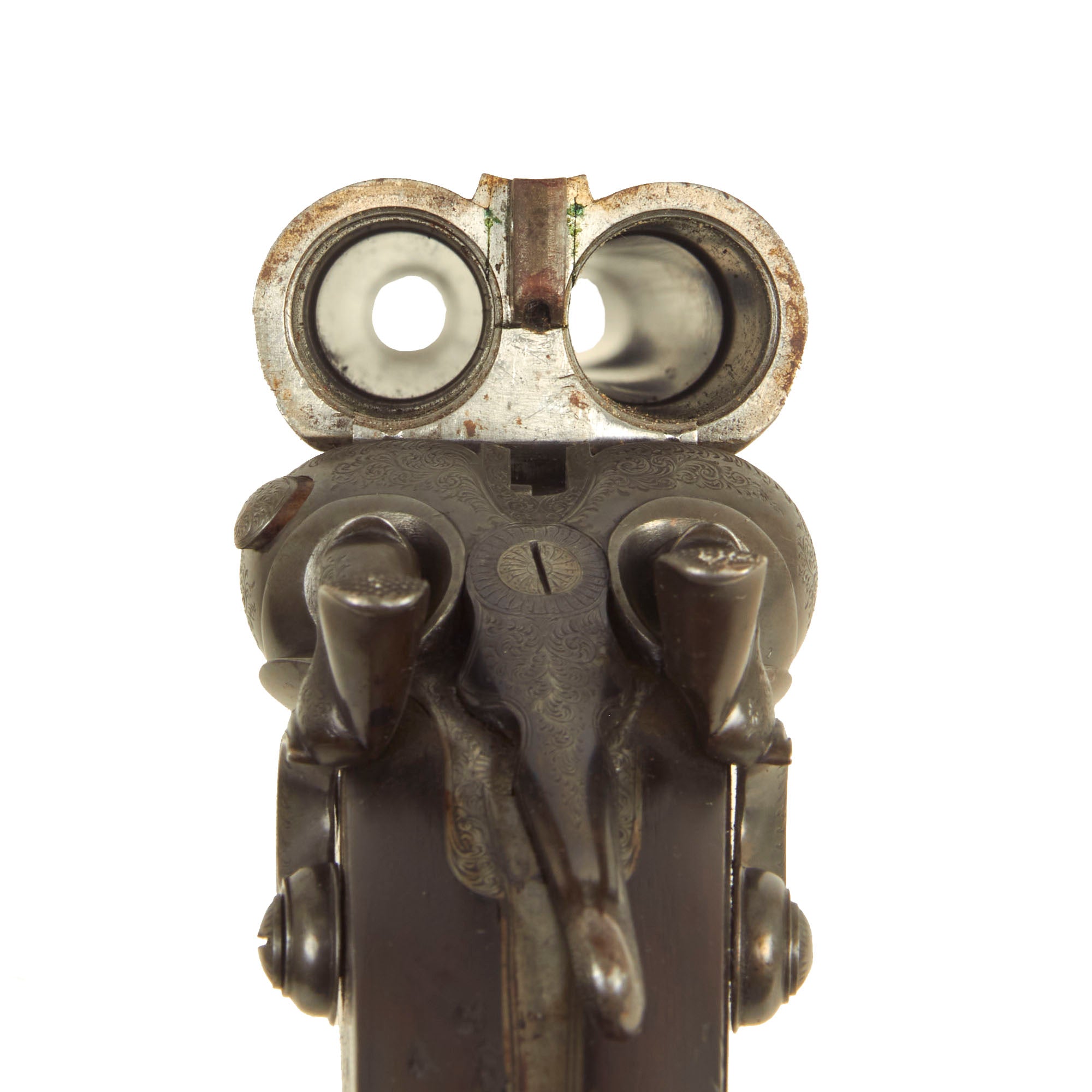 This fantastic DOUBLE BARREL 14 gauge Hammer Shotgun presents very nicely, still showing crisp engraving on the lower receiver / action area, which has almost certainly NOT been refinished. It is truly a beautiful example, with copious foliate engraving on all components. The butt stock is high quality figured walnut, which has a checkered "pistol grip", which is still in excellent condition. There are also brass escutcheons on the bottom of the pistol grip and another on the bottom of the butt stock. There is even a small brass ornamentation around the tang of the receiver. The butt pad is a lovely piece of checkered and carved horn. The only real deficiency is that the toe of the butt stock has been replaced, and a section of the butt pad replaced with a silver insert.