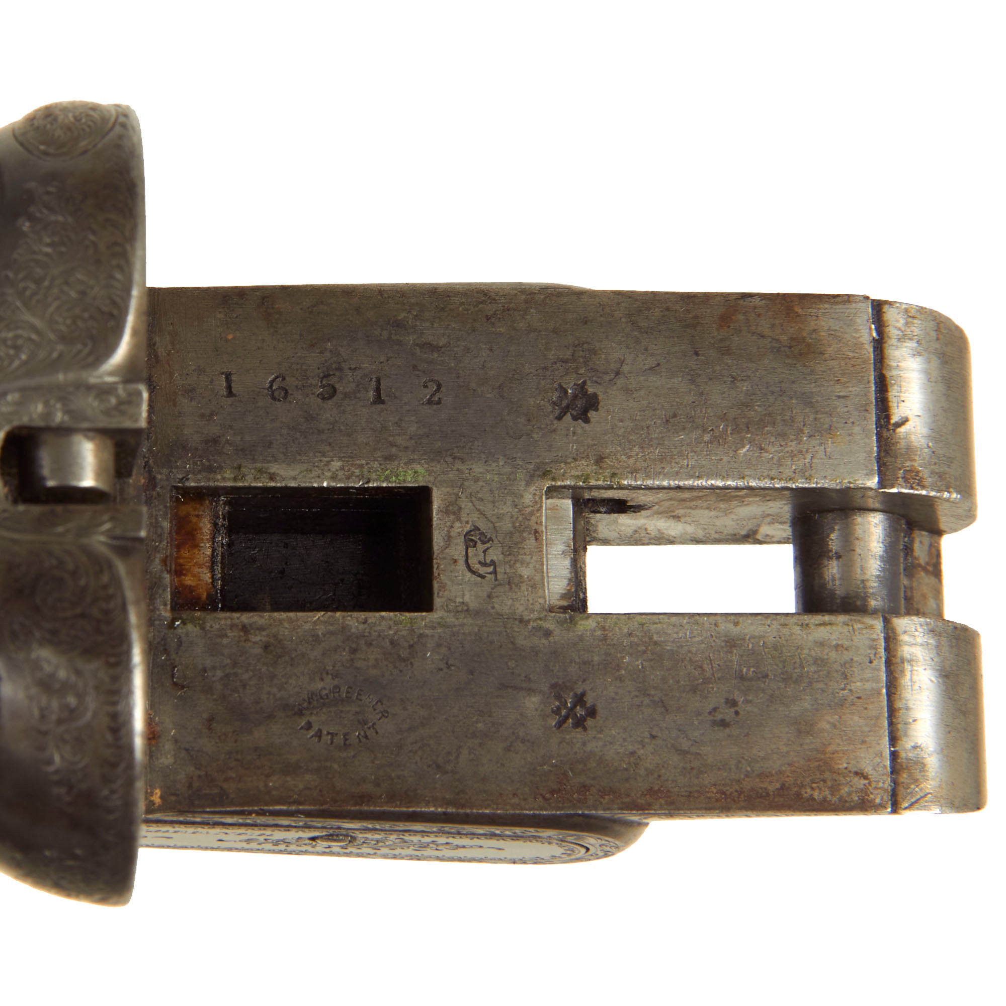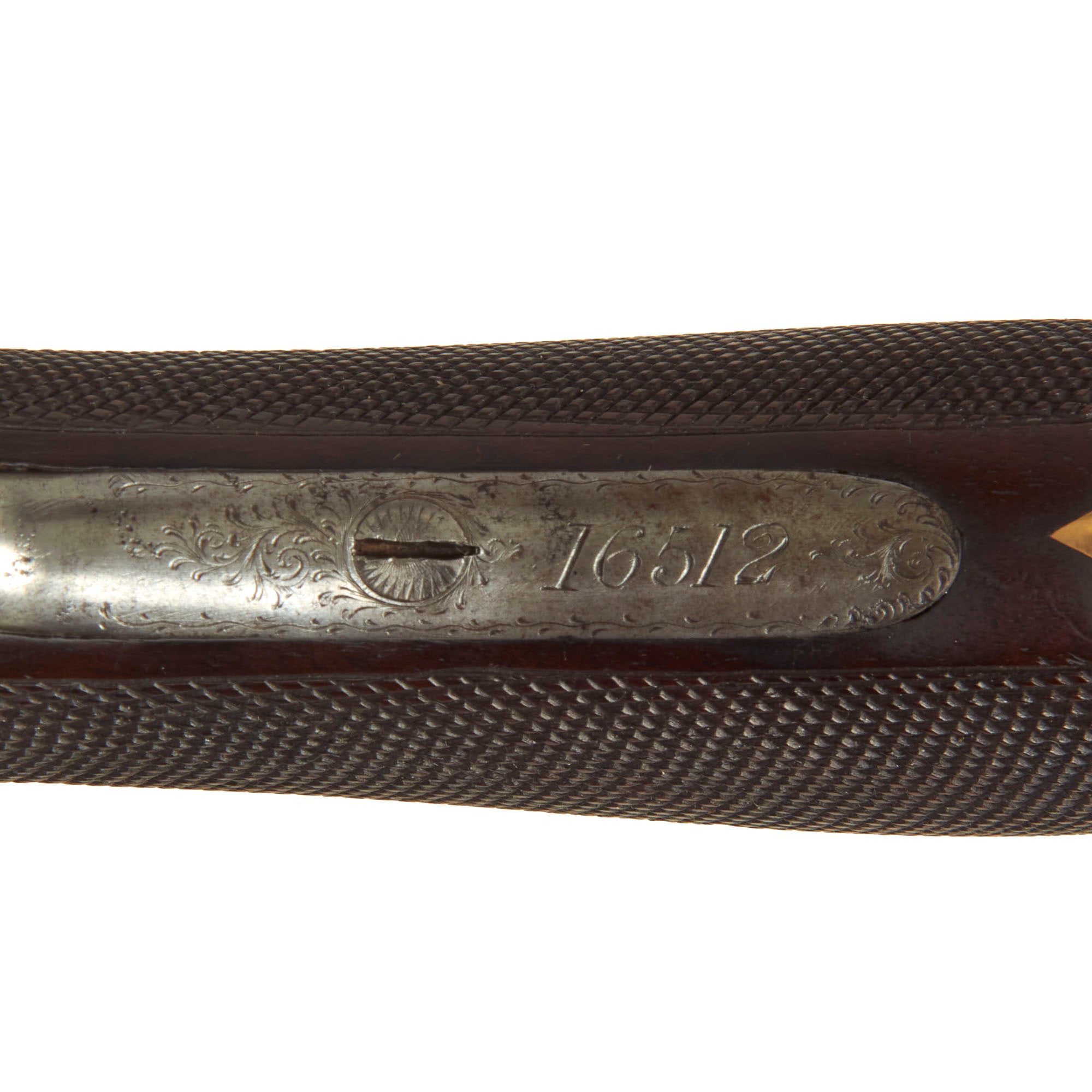 This is a great example of one of the relatively early production shotguns made right during the period when the trials were being conducted. It is marked on the trigger guard, the top of the receiver under the barrel, and on the bottom of both barrels with matching serial number 16512. Consulting known W.W. Greener records indicate that serial numbers 16001 through 17500 were produced in 1876. The shot gun definitely looks to have had the barrel refinished at some time, which has made the markings faint, but we can still make out the breech patent information on the far rear of the barrel assembly: