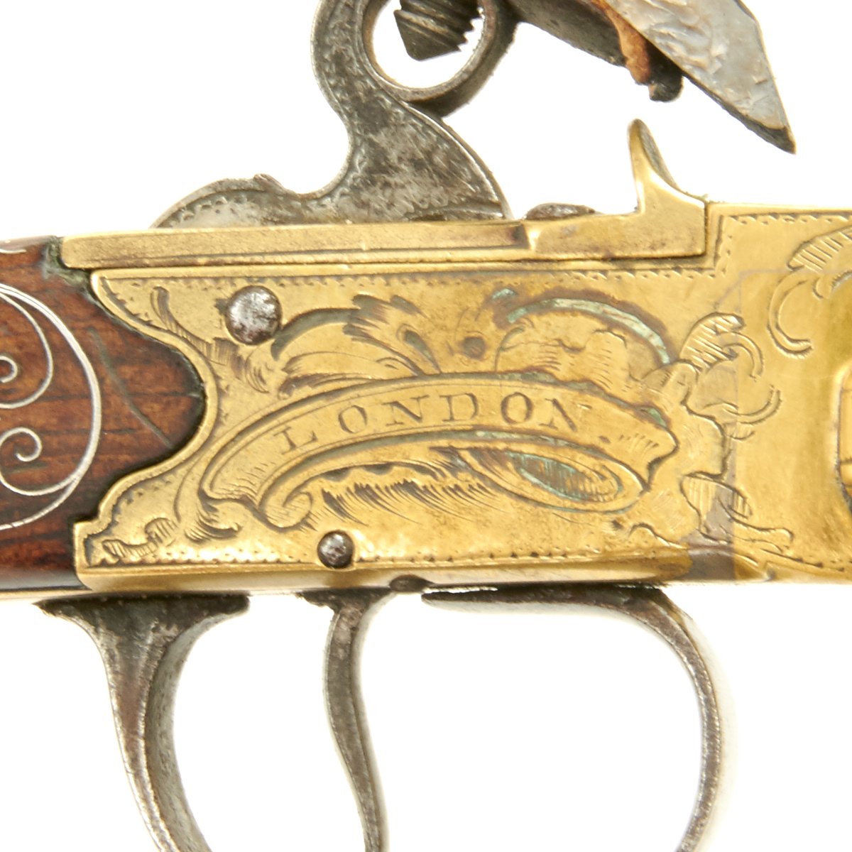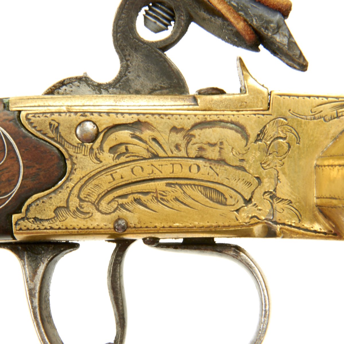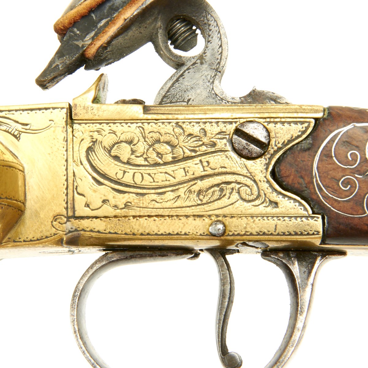 In fact, the lack of original examples and paucity of historical references to them have given cause for some collectors to speculate that they never really existed. We are confident, however, that this is not the case here due to many factors, such as the high quality of work. These pistols are almost entirely hand crafted. This exceptional work includes silver wire inlay, gorgeous brass chambers, barrels perfectly engineered to screw and unscrew with aligned matching numerals or frame and barrel (1-8). All barrels show with clear British proof markings and the locks are signed by the well known London gun maker JOYNER. The silver 18th century hallmarks are genuine and further confirm their authenticity and date of manufacture. Furthermore, these pistols have been successfully test fired showing that they were indeed built to perform and not as some type of fantastical prop.