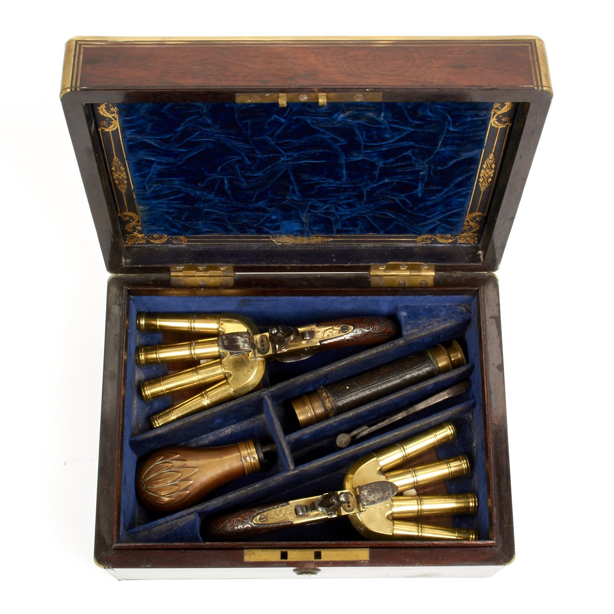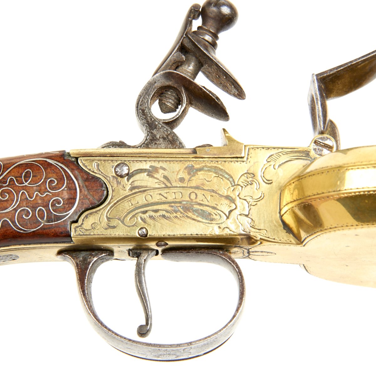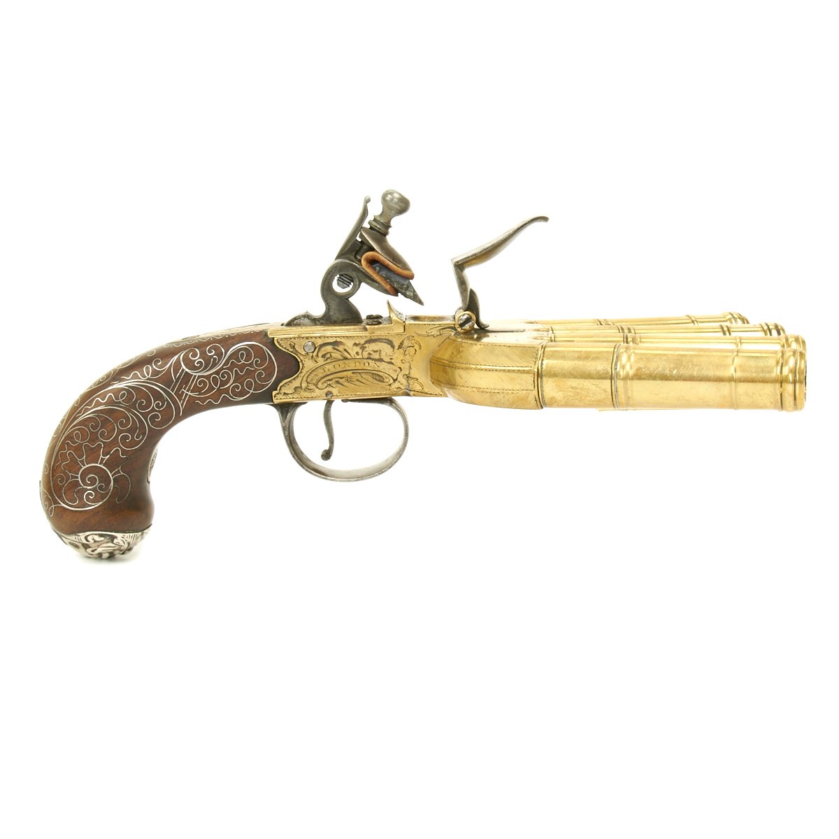 In fact, the lack of original examples and paucity of historical references to them have given cause for some collectors to speculate that they never really existed. We are confident, however, that this is not the case here due to many factors, such as the high quality of work. These pistols are almost entirely hand crafted. This exceptional work includes silver wire inlay, gorgeous brass chambers, barrels perfectly engineered to screw and unscrew with aligned matching numerals or frame and barrel (1-8). All barrels show with clear British proof markings and the locks are signed by the well known London gun maker JOYNER. The silver 18th century hallmarks are genuine and further confirm their authenticity and date of manufacture. Furthermore, these pistols have been successfully test fired showing that they were indeed built to perform and not as some type of fantastical prop.