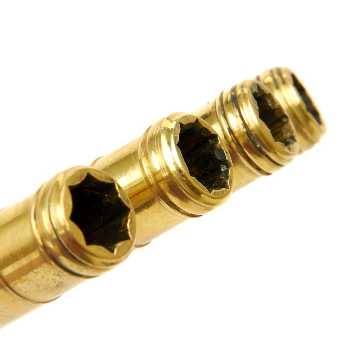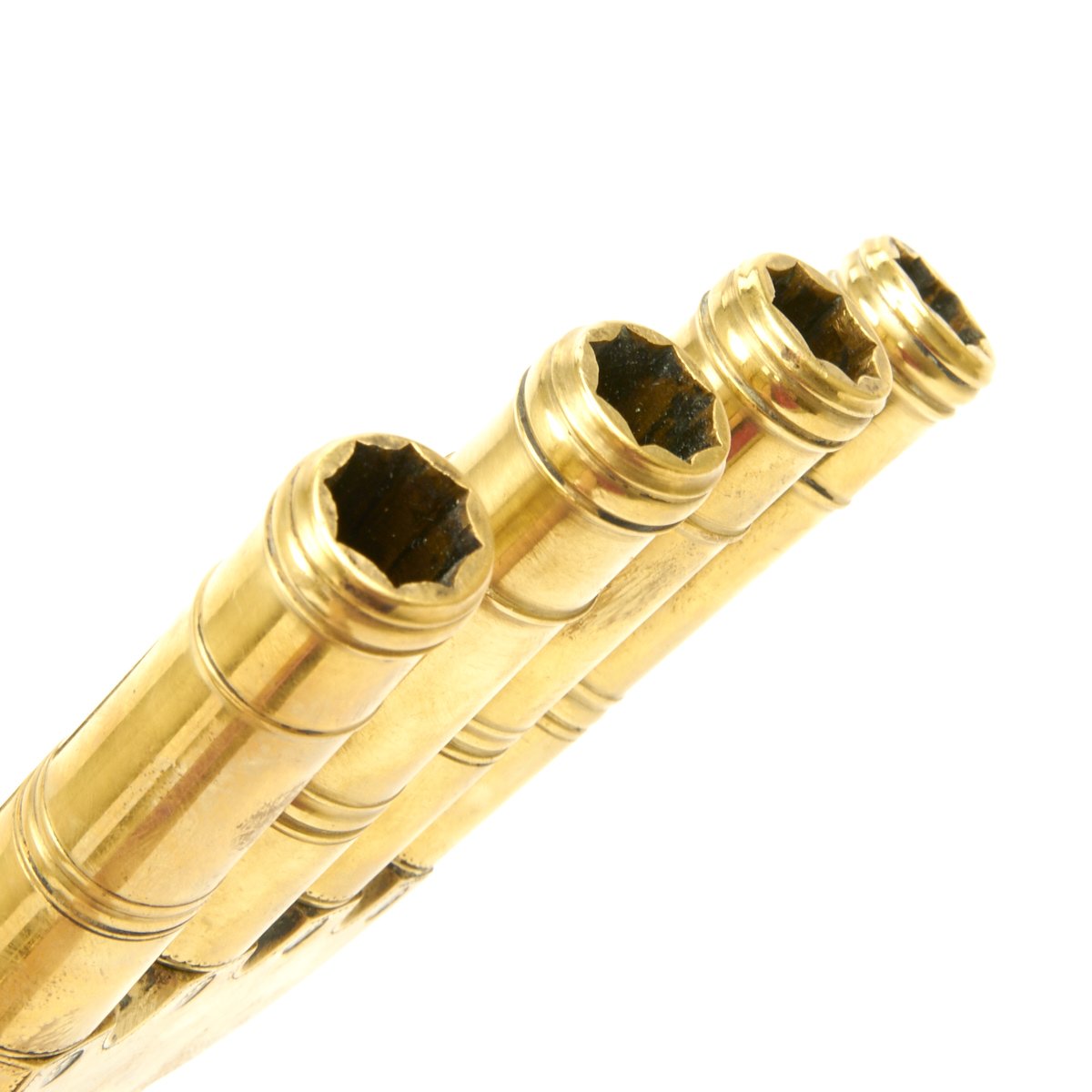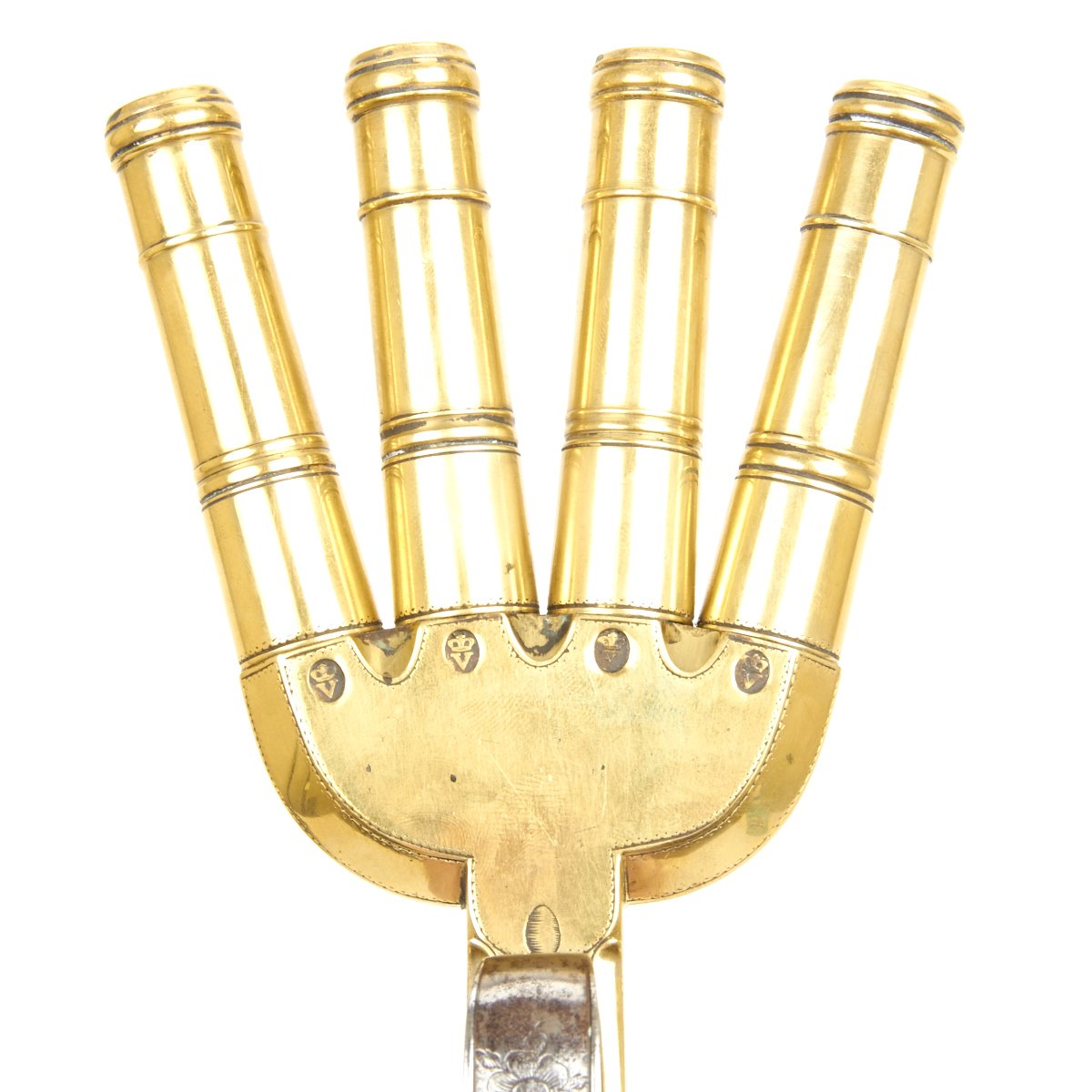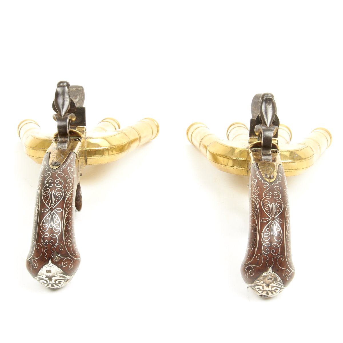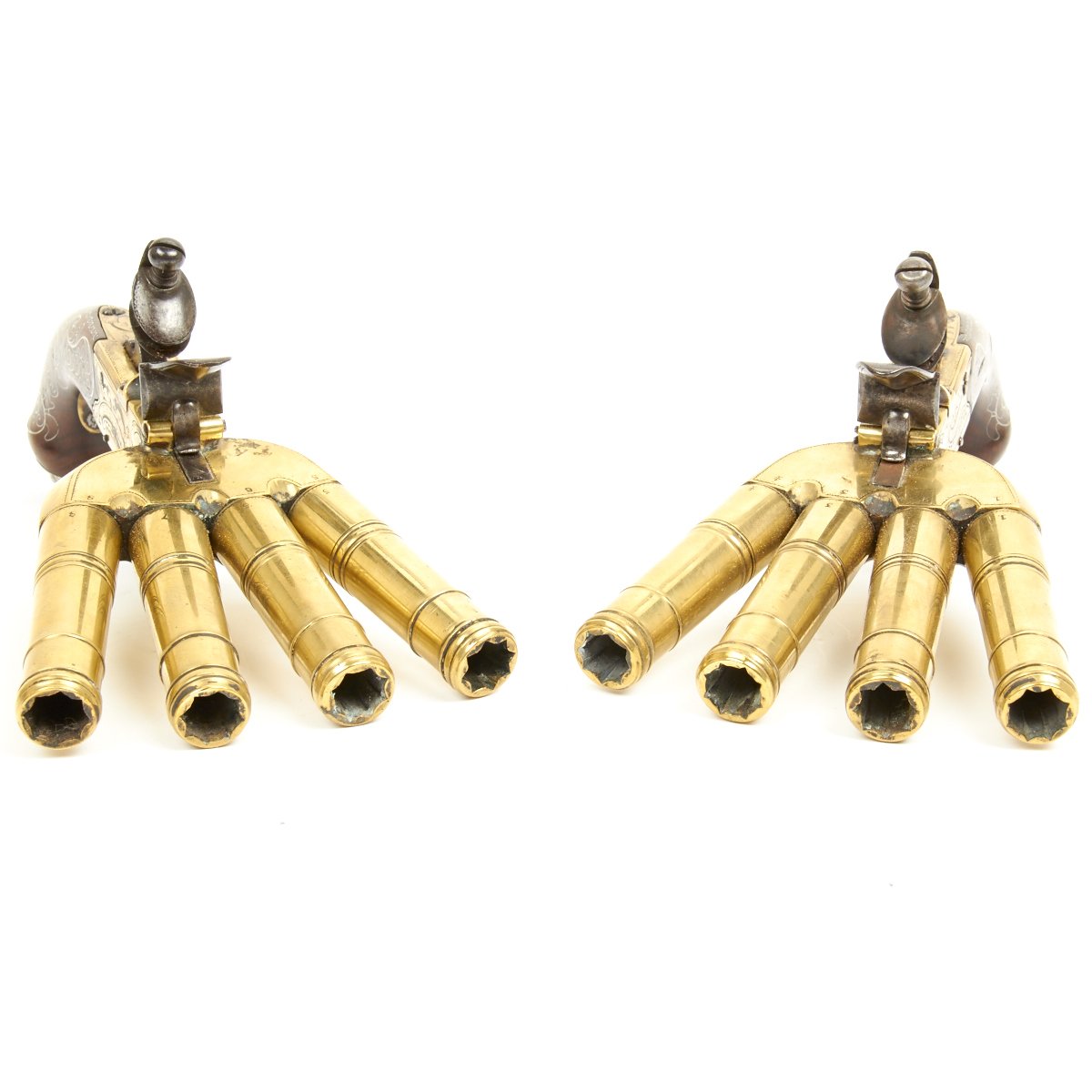 Original Items: One-of-a-kind set. This is a magnificent set of a matching pair of English brass framed and barreled Duck's Foot Pistols each having four splayed cannon style barrels each measuring just 2.75 in length.