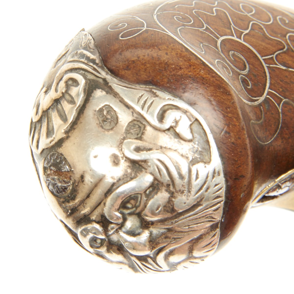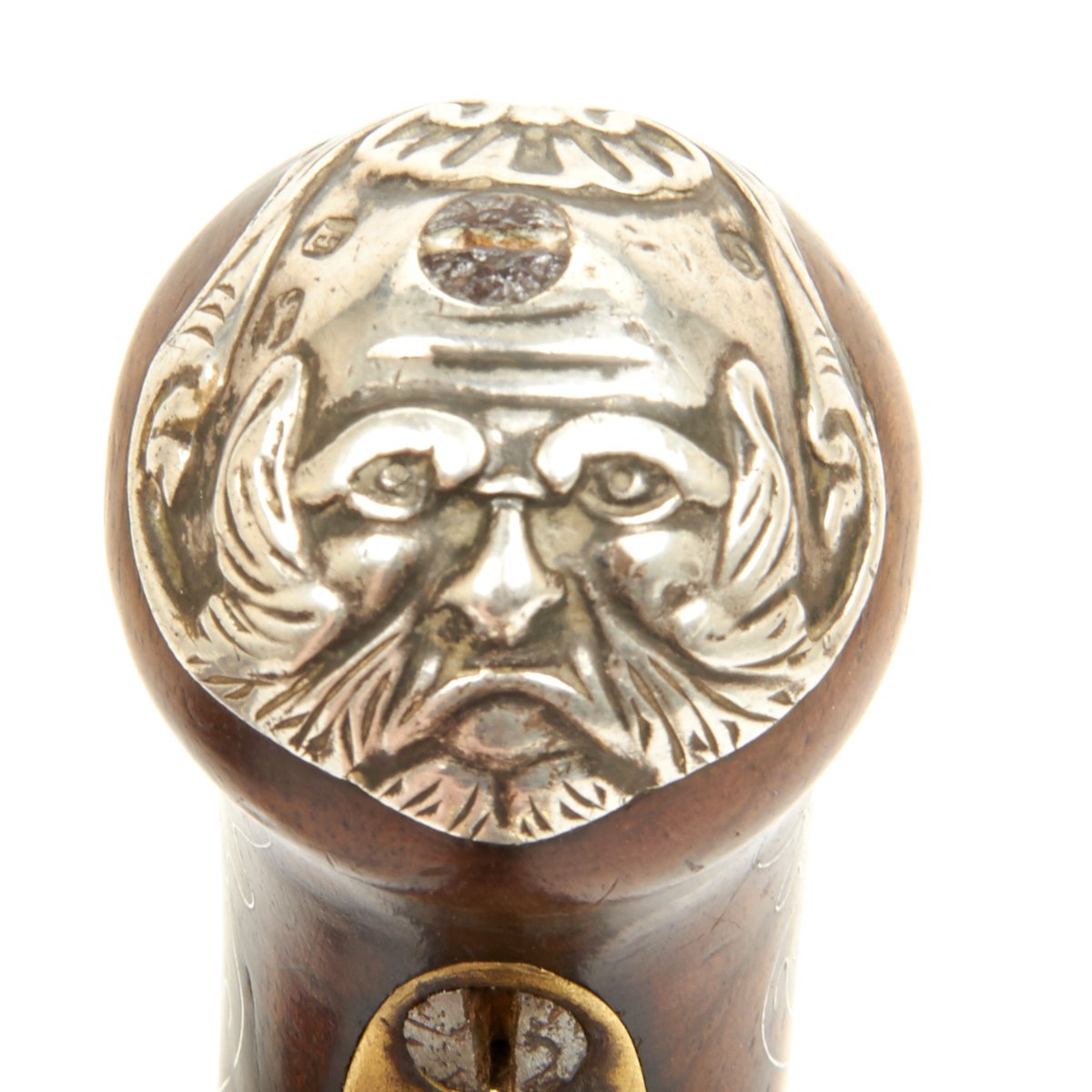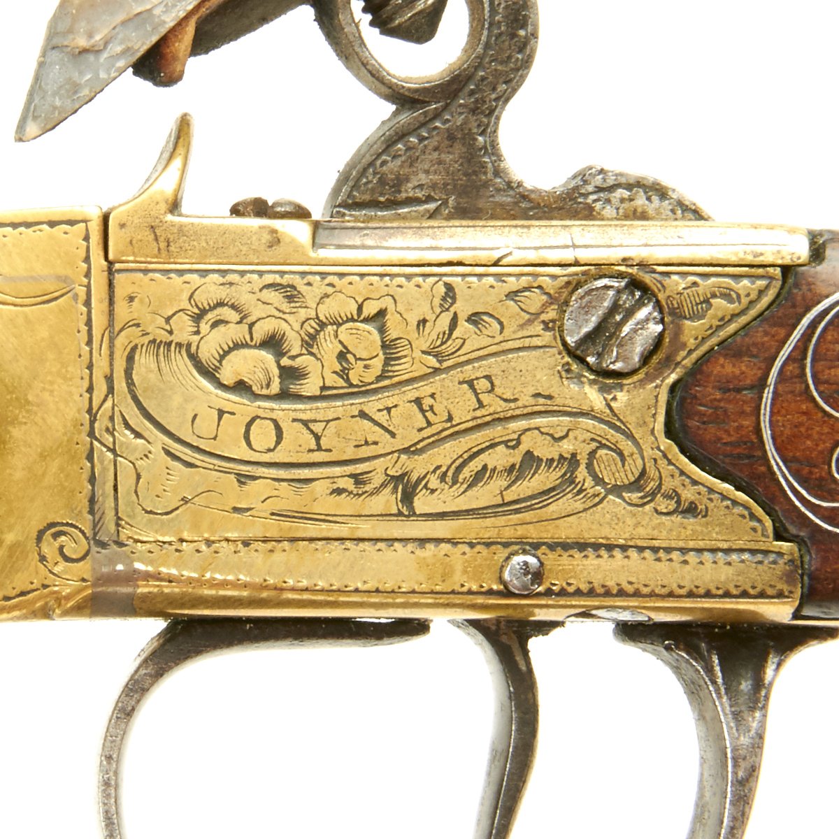 The flintlock ignition system in a brass box lock frame bears the maker's name JOYNER on one side and LONDON on the other. The walnut grips are heavily inlaid with silver wire decoration and the sterling silver mask butt caps. Each barrel is numbered 1-4 and 5-8. All barrels show correct British Proof marks of "Crown" over "V" (for viewed) on the underside.