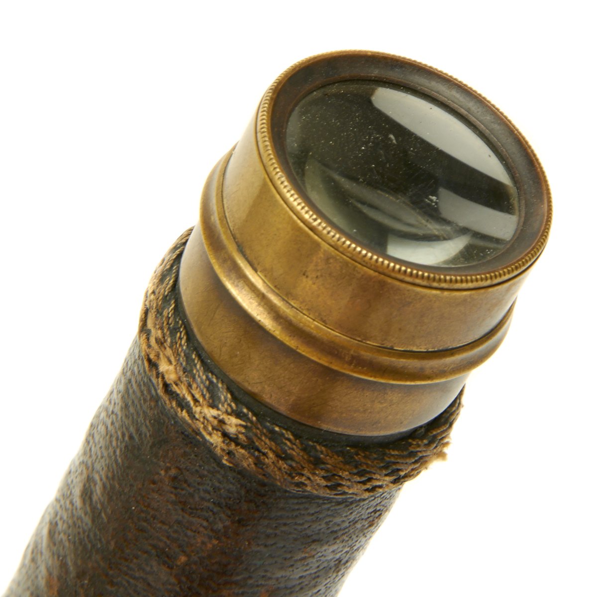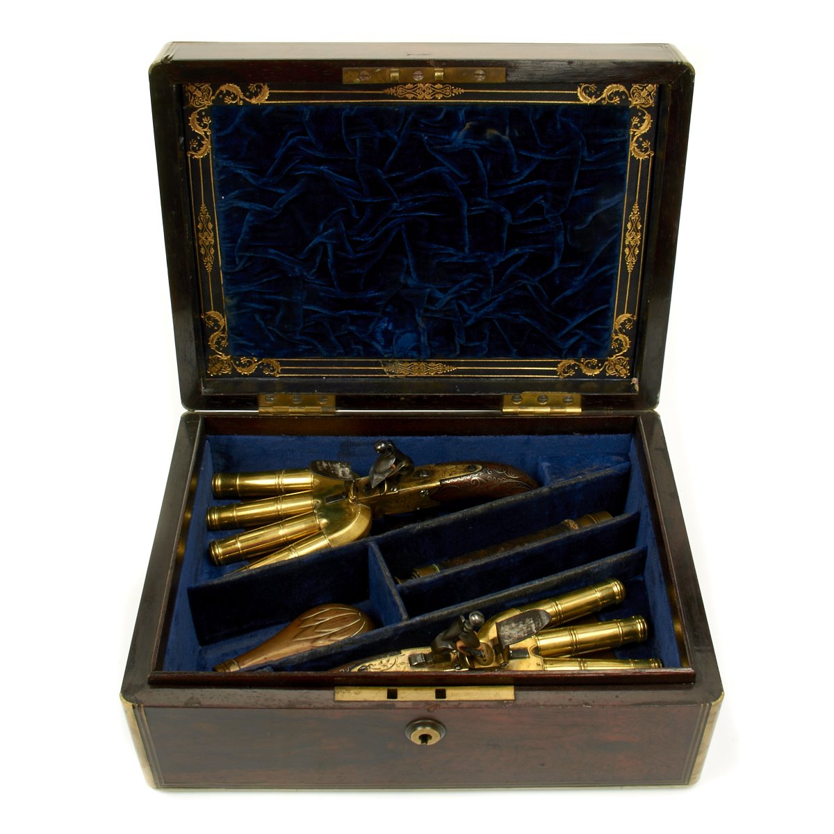 This pair is housed in their original navy blue velvet lined fine hardwood case which measures The case measures 12" x 9" x 5. The case has dedicated compartments for each pistol, powder flask and bullet mold all of which are present. Lidded compartments include flints and lead balls together with an open compartment housing a very typical 18th century English brass draw telescope. The barrel wrapped at one point with naval rope work.