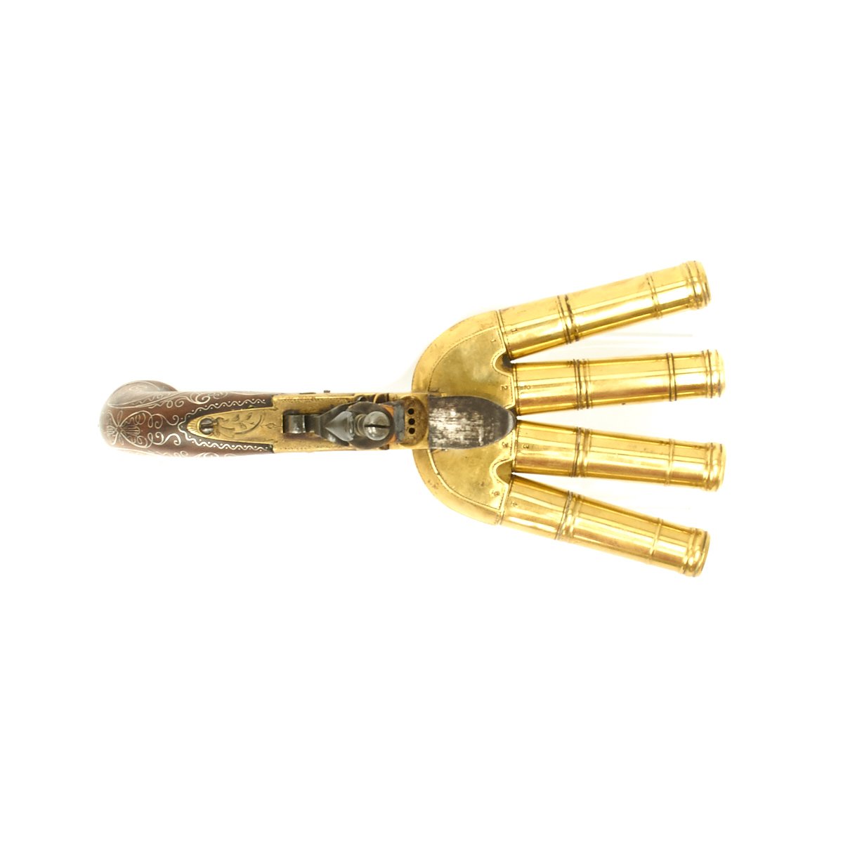 Flintlock Duck's foot pistols were first introduced in the 18th century, most often found in the four barrel configuration, but variations from 3 barrels to 7 barrels have been recorded. Multi-barrel ducks foot pattern pistols were intended for use in a crowd or mob situation as they discharged all the barrels at the same time in a "spread" direction. The 18th century was the era of the single shot or the occasional double shot pistol which was very time consuming to reload. A pair of 4 barrel Duck's foot pistols provided a spread of 8 balls into a mutinous crew making the presence of such multi shot pistols very discouraging to potential mutineers or an attacking mob. Production of such pistols at the time was very expensive and original examples are rare.