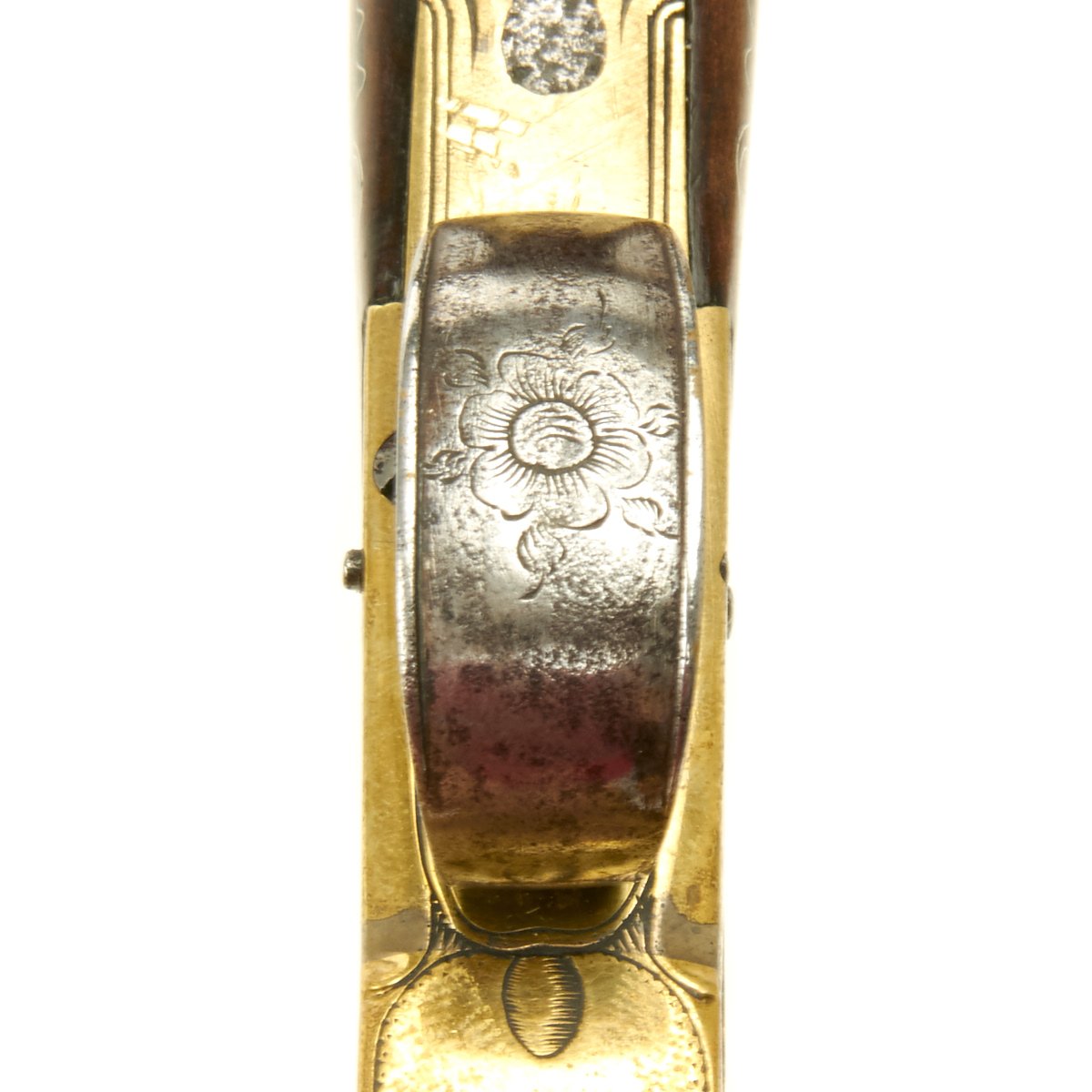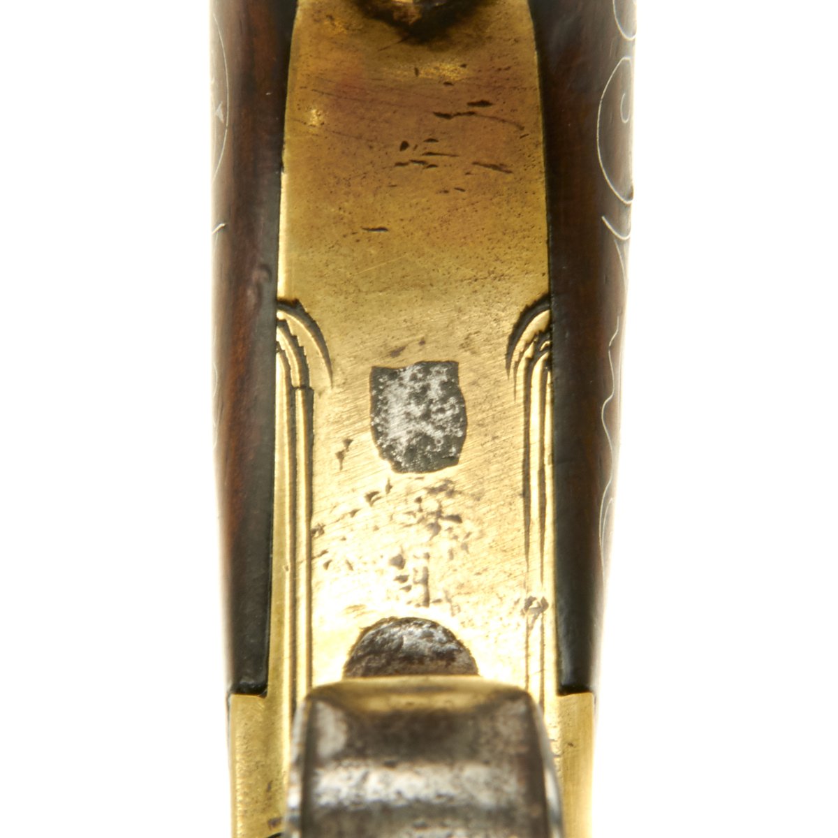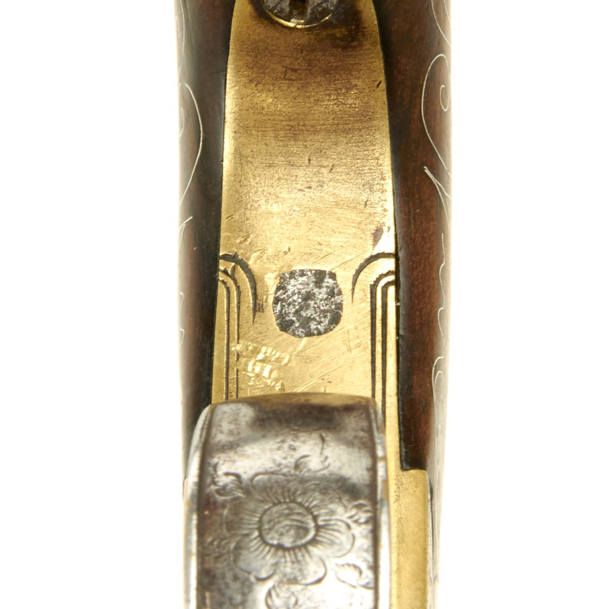 The pistols date between 1778-1780 we know this for two reasons; silver hallmarks (F inside a square with cut corners) in the butt cap, which indicate the silver was done in Birmingham England in June 1778 - June 1779. The maker John JOYNER (which is named on each pistol) had a shop in LONDON from 1761-1780 so that so these were made in the last 2 years of his work.