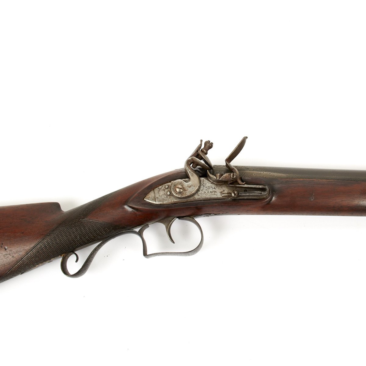 Original Item: Only One Available. Lovely steel Lock plate with waterproof pan signed CLARKE who worked from 1785 until 1840 from his shop in Holborn, London. Clarke had many British government contracts to supply military muskets but also built bespoke guns making business for well heeled customers.