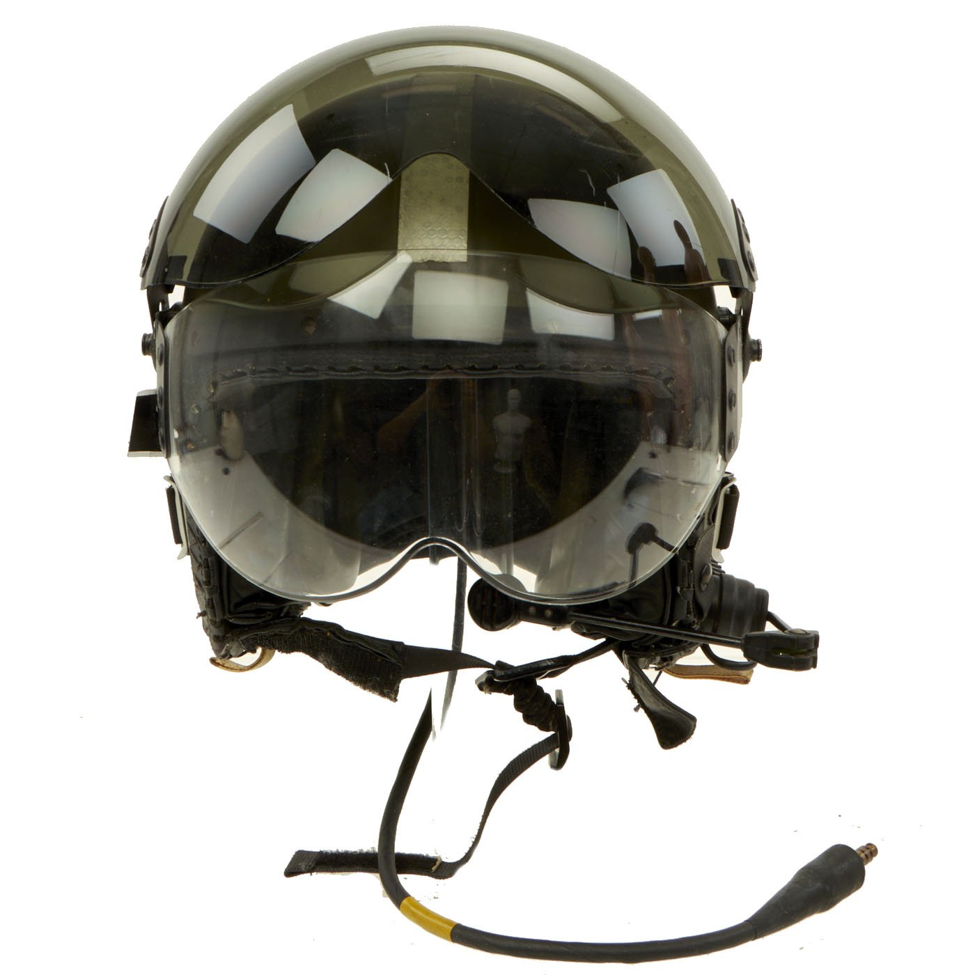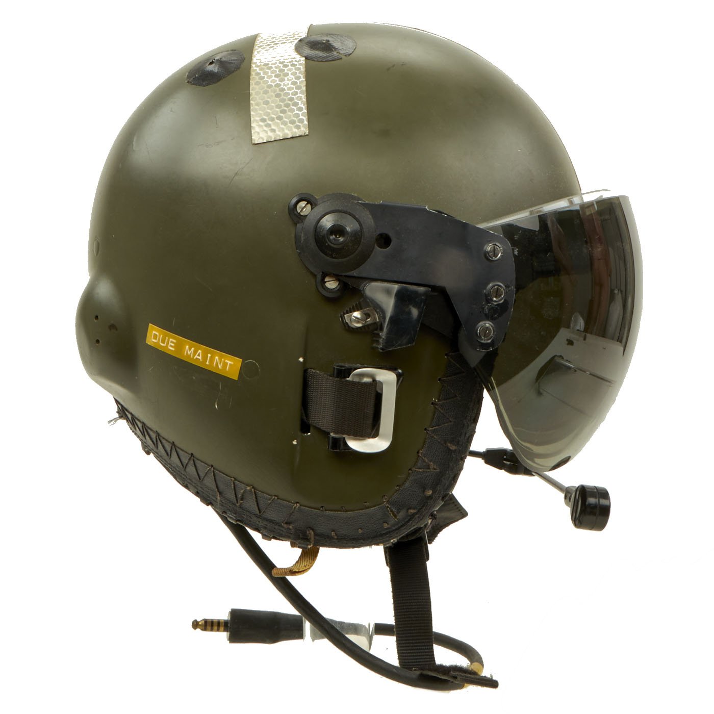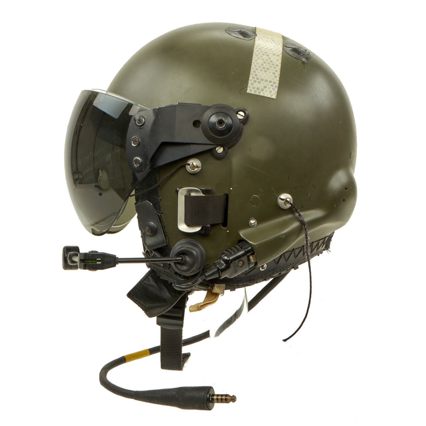 Original Item: Only One Available. The Mk.4A Flying Helmet was Royal Air Force / Royal Navy / Army Air corps issue and superseded the Mk.3C helmet in the 1980`s. The shell is made of glass fibre impregnated with polyester resin and lined with shock absorbing expanded polystyrene; the interior is fitted with a multi-point adjustable webbing harness system with adjustable independently suspended earcups. The helmet has a locking clear inner blast visor and a friction mounted outer tinted visor with a detachable cloth visor cover, avionics consist of twin 300Ω speakers giving an impedance of 150Ω (@ 1kHz) terminating with a 18" downlead and single pin NATO jackplug, mounting blocks allow the fitting of hooks for the P or Q type oxygen mask. The Mk.4A has locating holes allowing the fitting of RAF or similar Boom Mikes. The manufacturer is probably Helmet Integrated Systems Ltd.