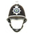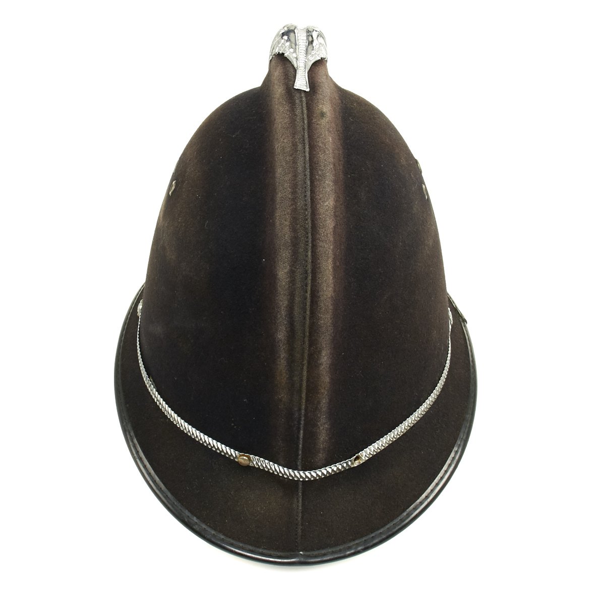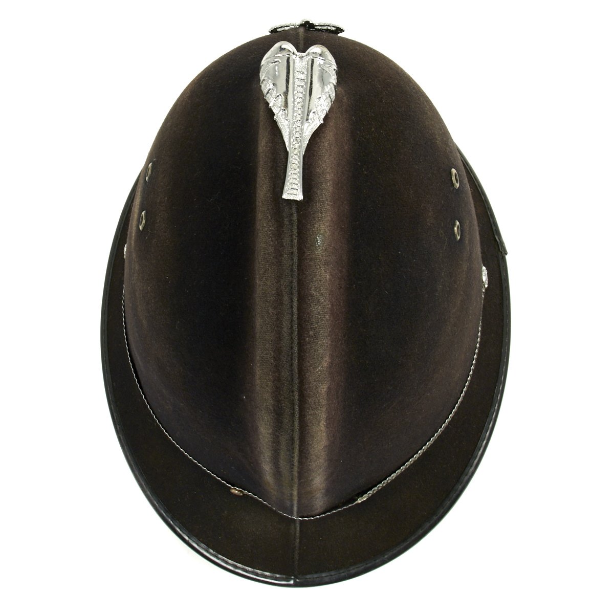 Original Item: Only One Available. The Traditional Bobby helmet was named after the creator of the British Police Force, SIR ROBERT PEEL, who became Prime Minister under Queen Victoria. This version, known as a "Comb Top", replaced the earlier "ball top" and "rose top" helmets used in many areas. The pattern features a pronounced ridge on the top of the helmet, which is capped off by a silvered fitting bearing a coat of arms.